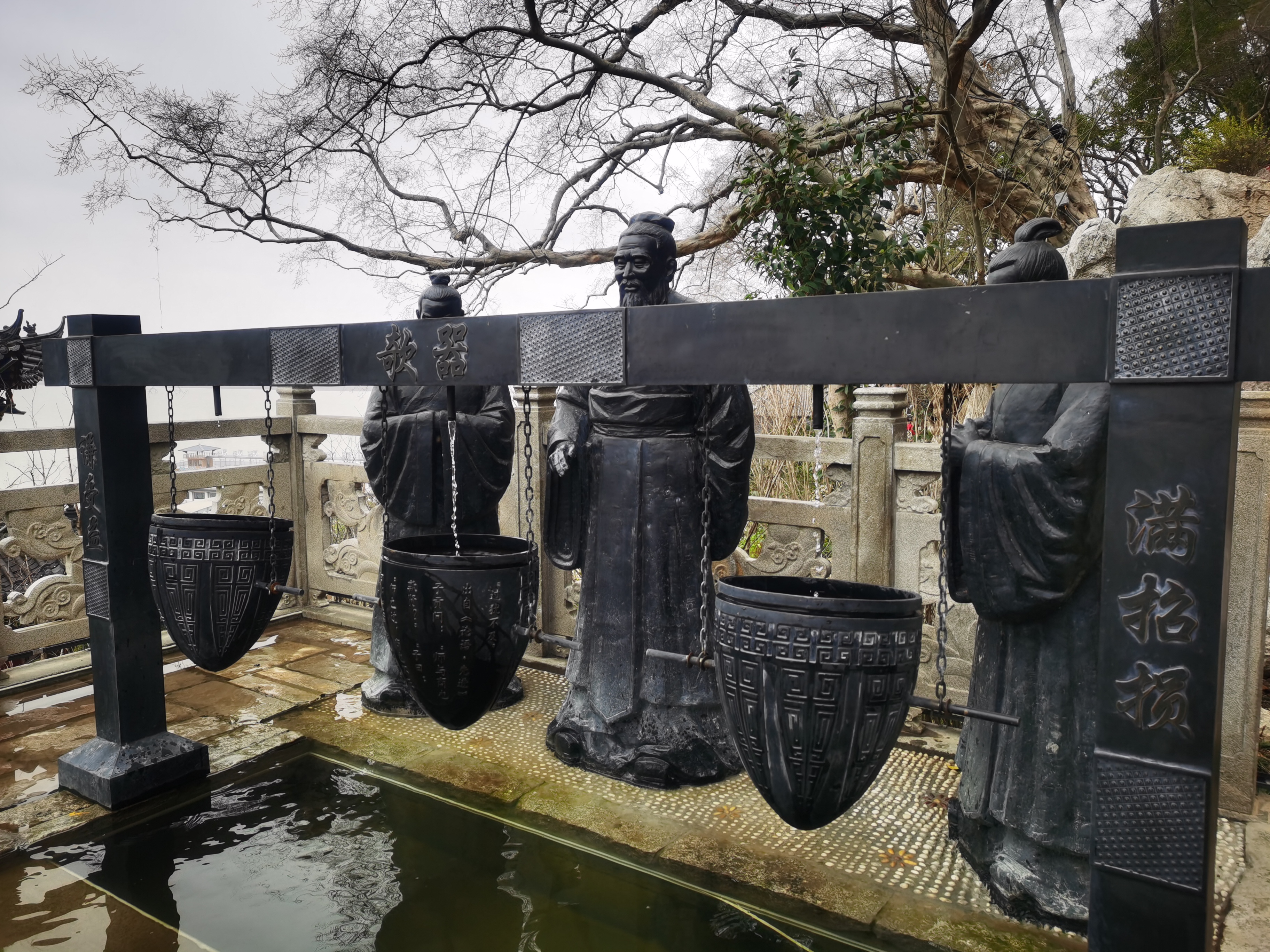 冬日石钟山,灰黑调里静淌千年文脉。古树虬枝斜映池塘,倒影如墨;青铜雕像凝立水畔,与刻字石柱“满招损,谦受益”低语。悬挂水缸盛着微澜,链条轻垂,石栏斑驳,一池寒水照见江南的骨相与温存。快门轻按,不是拍景,是接住一段未落款的宋词。