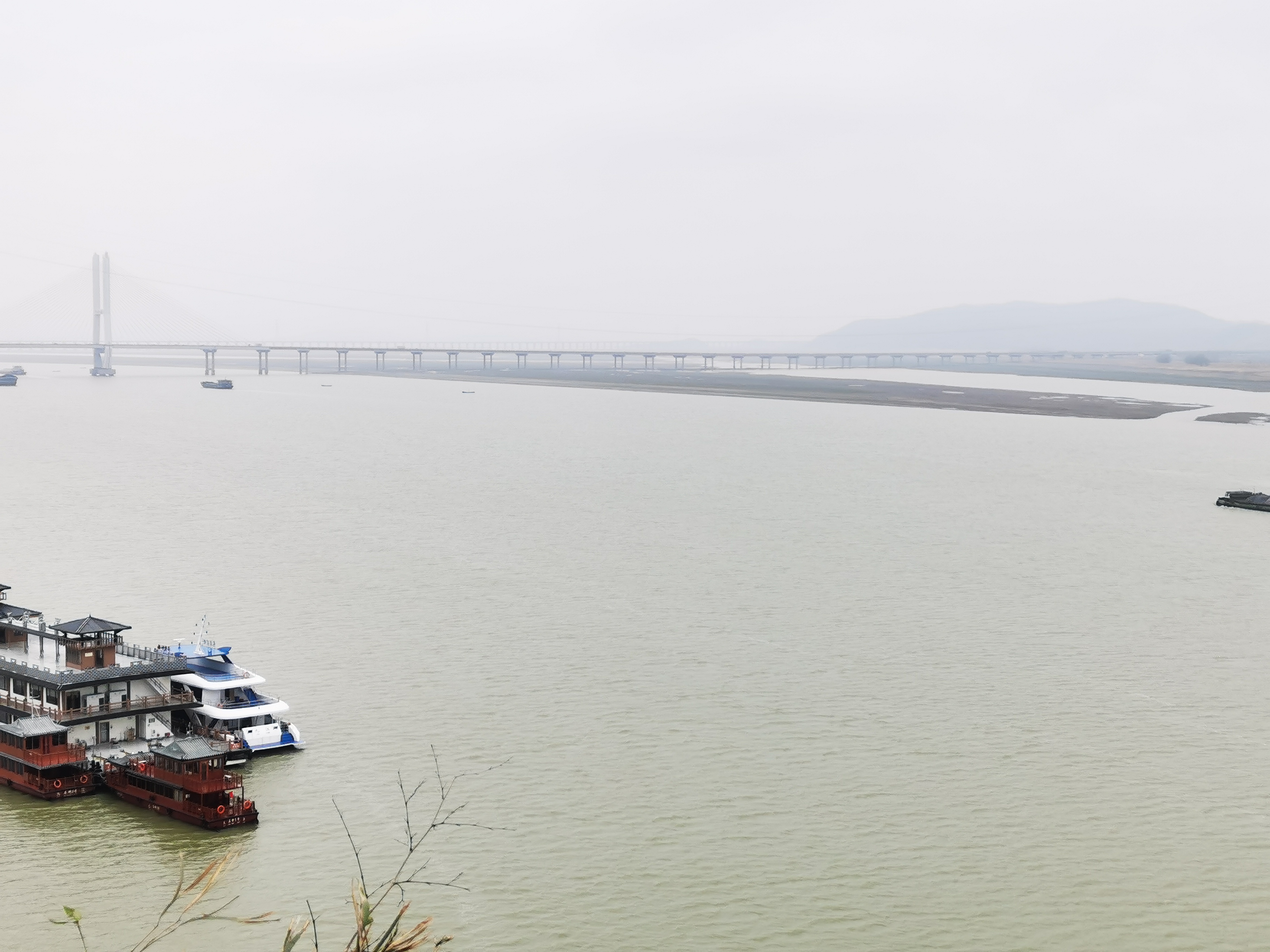 雾锁长江,水天一色,游船轻破码头的薄霭。现代桥梁飞跨两岸,与中式渡口遥遥相望。江面平阔如镜,倒映着灰蒙天光与远山轮廓,观光船缓缓划开微澜,似一笔淡墨入宣。