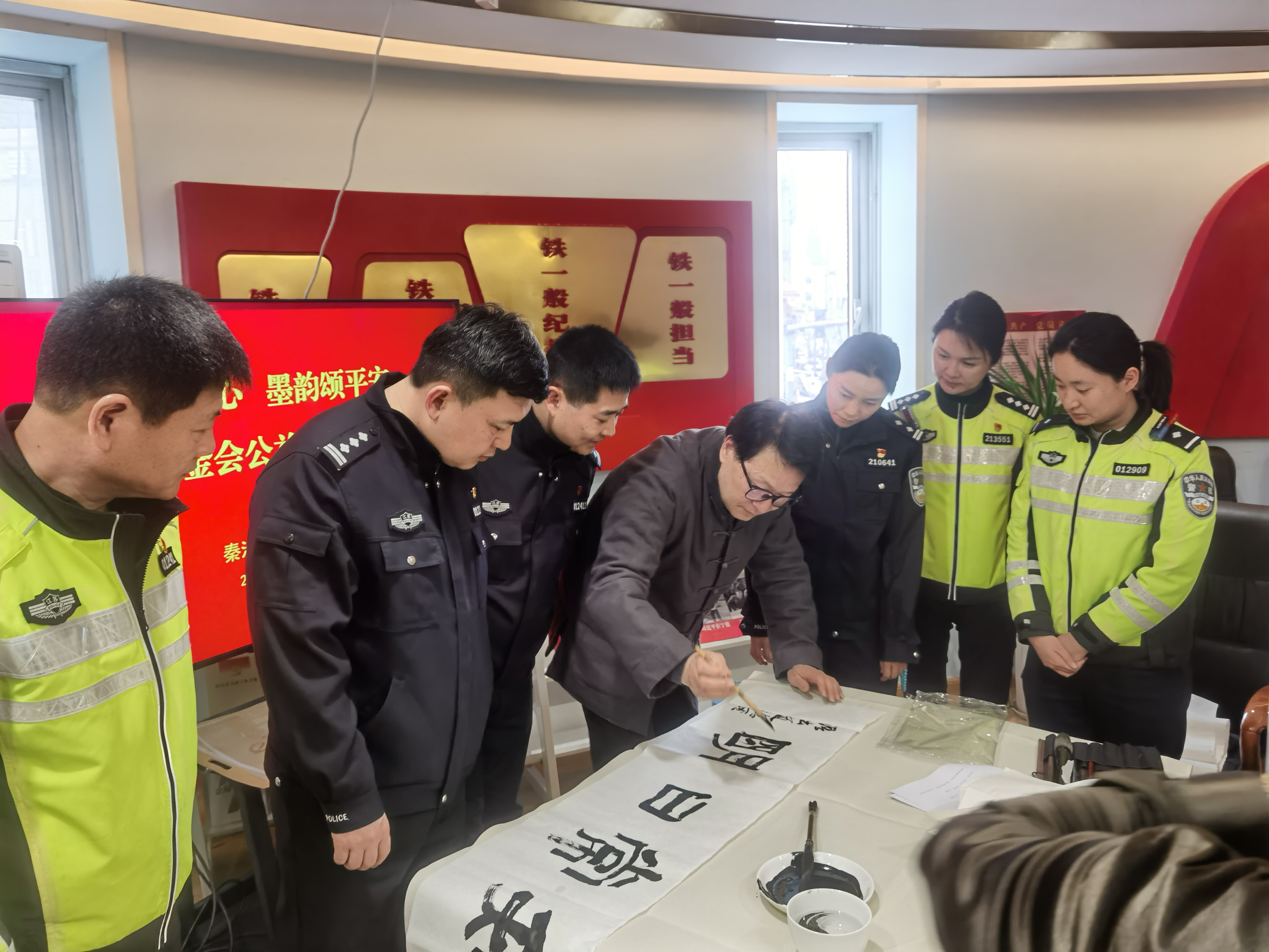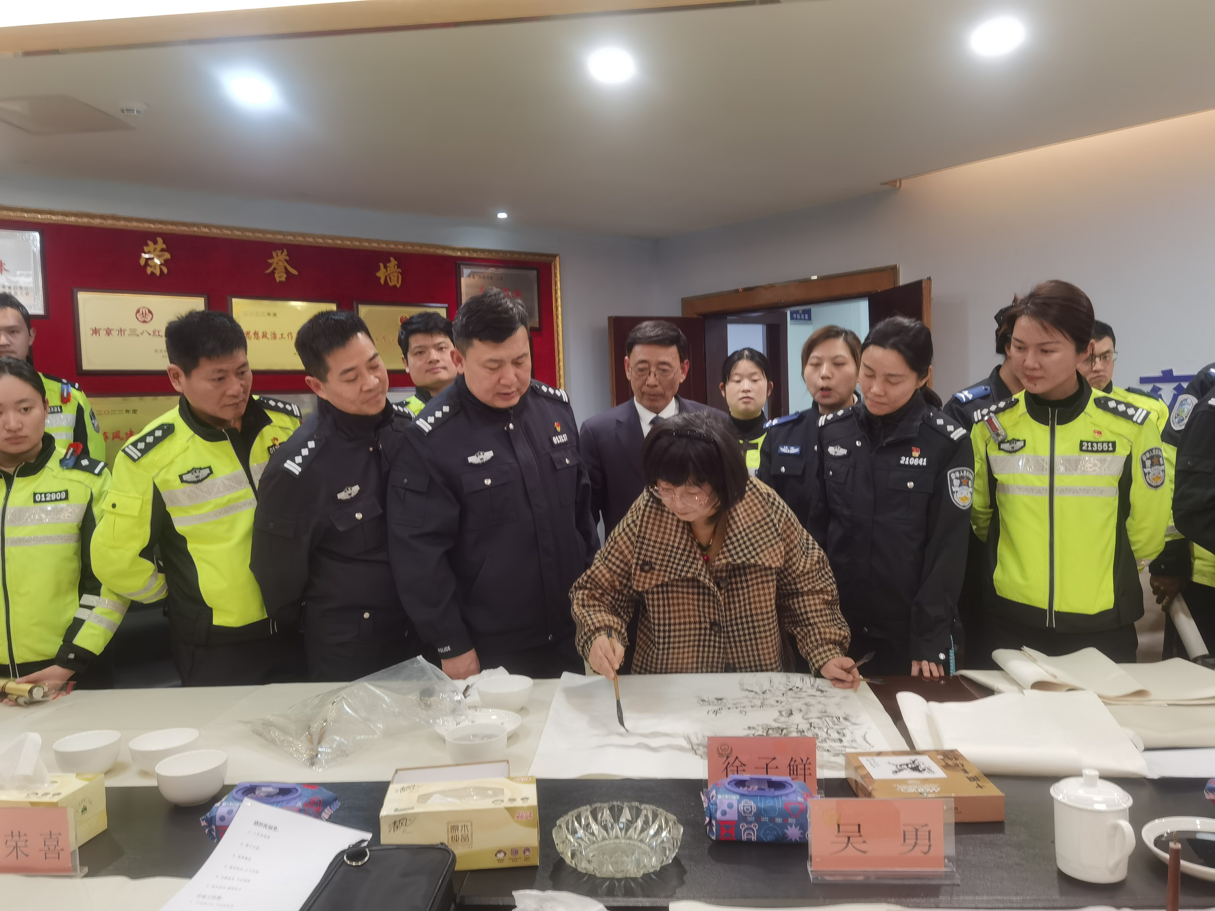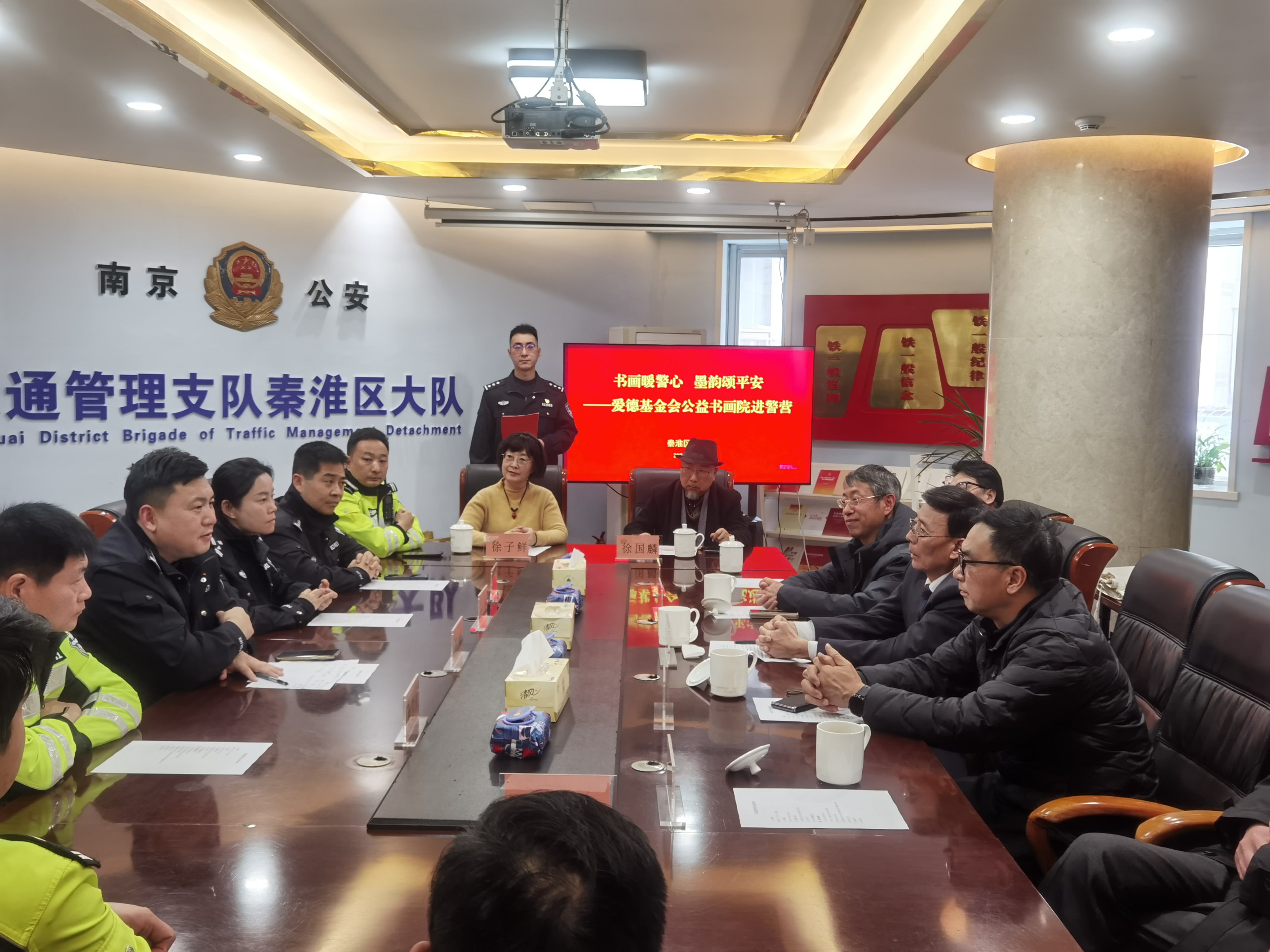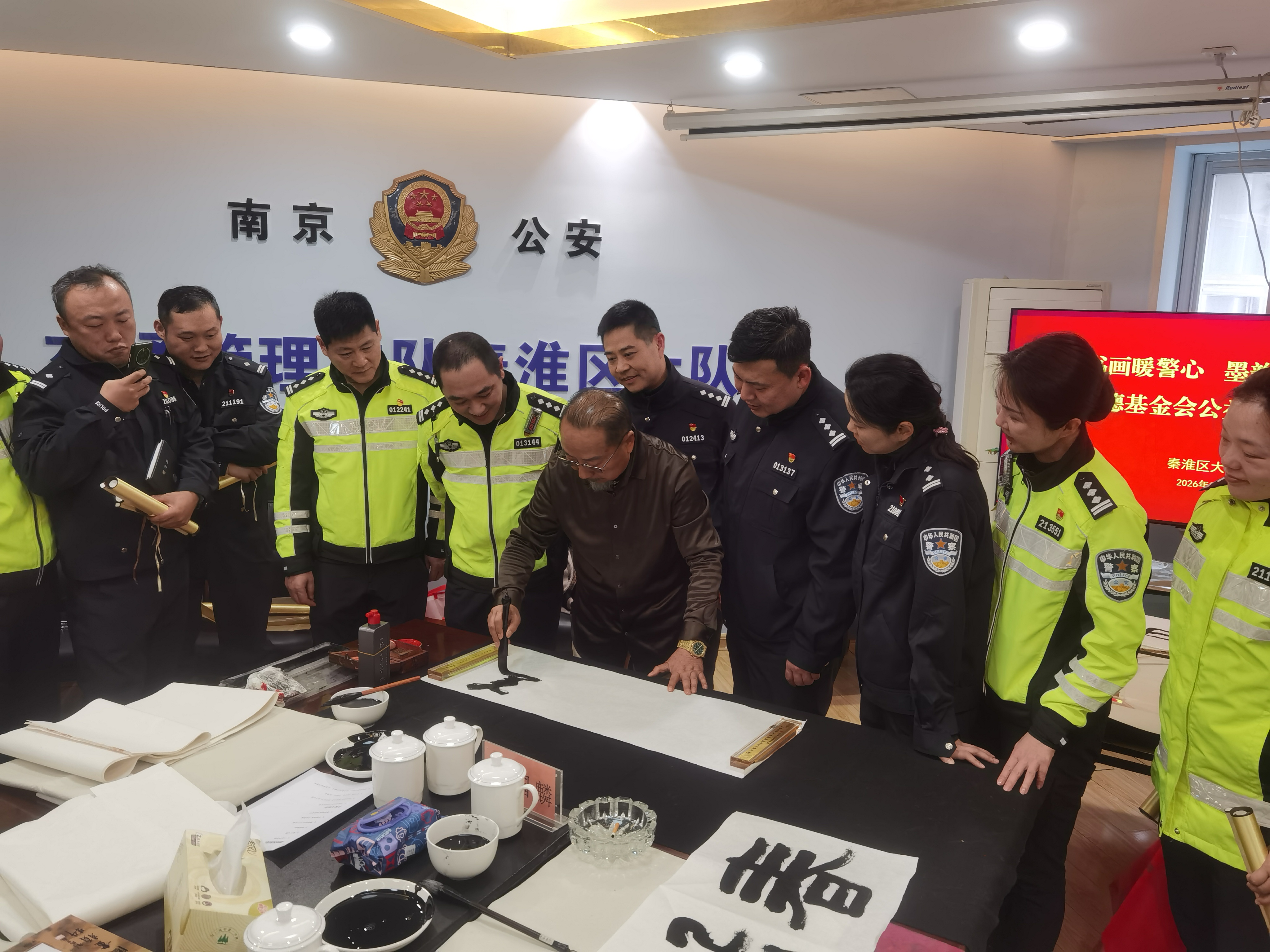 墨香润警营 元宵送平安——爱德基金会公益书画院书画家走进秦淮交警大队慰问创作 爱德照新报道 丹青绘忠诚,墨韵颂平安。元宵佳节过后第一天,南京市公安局交通管理局秦淮交警大队的警营里洋溢着浓浓的文化气息。3月4日下午,爱德基金会公益书画院的爱心书画家代表们,带着爱德基金会领导的新春祝福走进警营,向春节期间奋战在交通安保一线的全体干警致以崇高的敬意和节日的问候。 秦淮交警大队大队长王峰、政委任博、副大队长桂子振、林四清、李子龙等领导热情接待了书画家一行,并出席慰问座谈会。桂子振副大队长和爱心书画家们一同挥毫,更感警民一家亲温暖场面。出席此次活动的书画家有:爱德基金会公益书画院常务院长戴德新,常务院长尤荣喜(南京市文化和旅游局二级巡视员、南京书画院书记),常务院长吴勇(江苏省省直书法家协会副主席、江苏省硬笔书法家协会主席),秘书长李根宝(国家一级美术师),秘书长史居华(著名书画家),常务理事徐国麟(非遗武中奇书法技艺传承人、国家一级美术师、中国书法家协会会员、清华美院客座教授),常务理事徐子鲜江苏省山水国画研究院副院长)及近五十名交通警察代表参与活动。 过去的一个春节,面对夫子庙、老门东等景区巨大的客流车流压力,秦淮交警大队全体民辅警舍小家、为大家,日夜鏖战在疏堵保畅第一线,用辛勤的汗水守护了城市的“烟火气”,确保了市民游客度过一个平安祥和的新春佳节。此次元宵节慰问活动,正是社会各界对交警辛勤付出的深情回馈。 下午三时许,活动在热烈而庄重的气氛中拉开帷幕。秦淮交警大队大队长王峰首先代表全体干警致欢迎辞。他对书画家们在元宵佳节过后第一天专程来到警营开展笔会慰问表示衷心感谢。王峰大队长指出,交通管理工作不仅是法律法规的执行,更是城市文明的窗口。书画艺术进警营,不仅丰富了警营文化生活,更是一种精神上的滋养和激励。他鼓励全体干警将社会的关爱转化为工作的动力,继续发扬连续作战、敢打硬仗的优良作风,全力保障辖区道路安全畅通,不断提升人民群众的出行安全感和满意度。 随后,秦淮交警大队政委任博与书画家们进行了亲切交流。任博政委介绍了大队在春节期间勤务部署、应急处突以及服务群众方面的具体情况,并对艺术家们深入一线体验生活、用笔墨描绘交警风采的举动表示赞赏。 戴德新首先代表书画院致辞。“平安是最大的福祉,守护平安的人最值得尊敬。在万家团圆的春节,秦淮交警同志们依然坚守在寒风中的路口,用你们的辛苦指数换来了群众的幸福指数。我们今天来到这里,不带纸墨之外的任何慰问品,就是要用最纯粹的文化方式,用我们手中的画笔,为同志们描绘春意、书写平安。这既是艺术家深入生活、扎根人民的一次实践,也是希望通过艺术的力量,为刚毅的警营增添一份文化的温度。” 随后,尤荣喜在讲话中表示,交警是城市文明的守护者,也是城市形象的塑造者。作为文旅系统的老同志,他深知节假日期间交通保障的艰辛与不易。他代表书画家们向全体干警致以崇高敬意,并表示将继续带领艺术家们用画笔讴歌时代英雄,讲好警民故事。 常务院长吴勇则从书法艺术的角度表达心声。他指出,书法不仅是笔墨的艺术,更是精神的载体。干警们忠诚履职、无私奉献的精神,正是书法作品中“骨力”与“正气”的生动体现。他现场挥毫写下“路畅民安”四个大字,赢得满堂喝彩。 讲话结束后,一场别开生面的书画笔会正式开始。尤荣喜、吴勇、李根宝、史居华、徐国麟、徐子鲜等书画家现场挥毫泼墨,凝神创作。他们以“平安出行”“忠诚为民”“廉洁奉公”“警民一家”为主题,创作了数十幅精美的书画作品。一幅幅寓意平安祥和的画作,一张张遒劲有力的书法,饱含着对一线交警的深情厚谊。现场气氛热烈而融洽,充满了浓厚的文化气息。 此次慰问活动,通过书画笔会的形式,进一步拉近了警民之间的距离,营造了警民一家亲的浓厚氛围。秦淮交警大队全体干警备受鼓舞,纷纷表示将以更加饱满的热情、更加昂扬的斗志投入到新一年的交通管理工作中,为建设平安秦淮、畅通秦淮贡献更大的力量。 张征宇警官主持了今天慰问笔会活动。