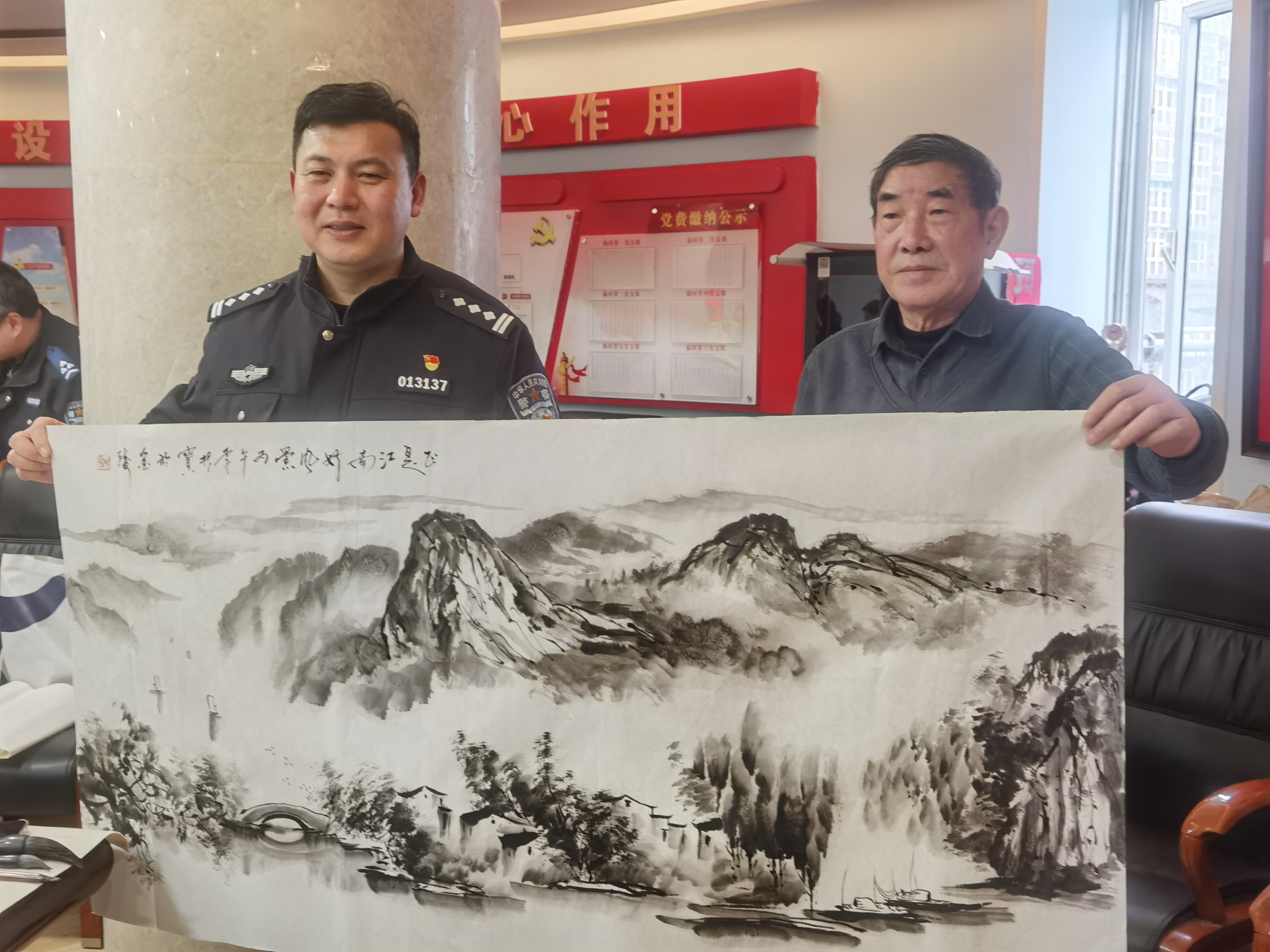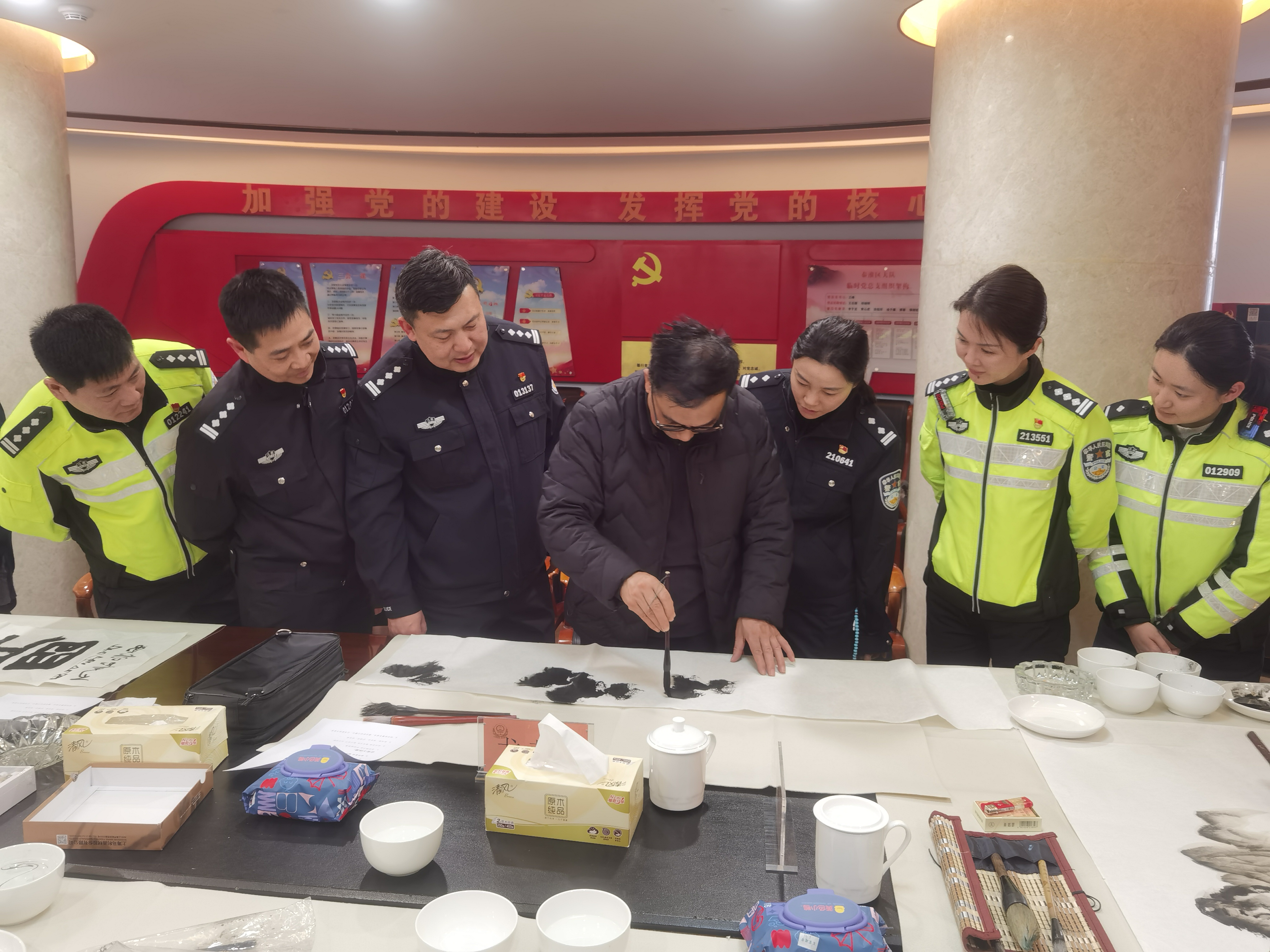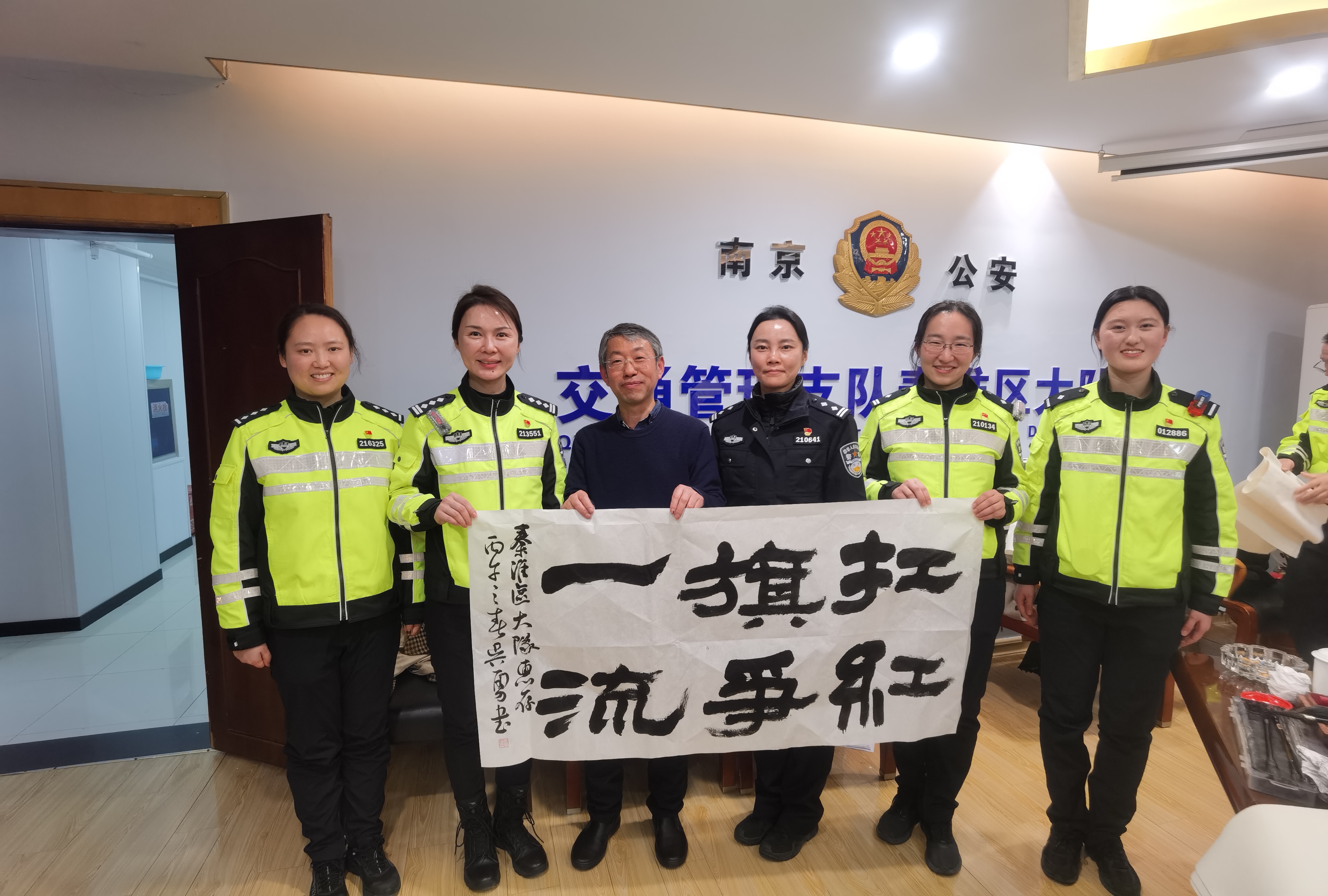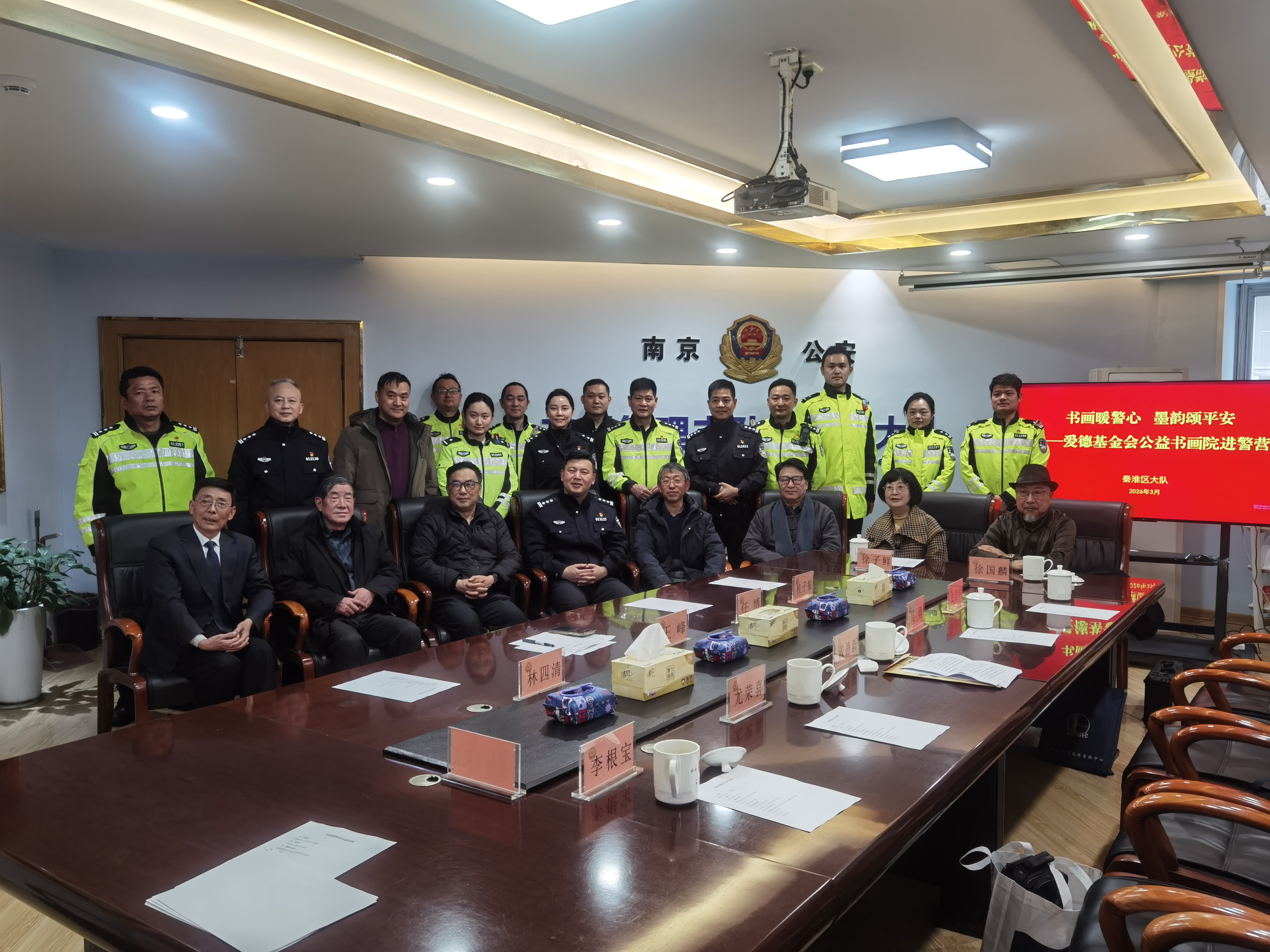 墨香润警营 元宵送平安——爱德基金会公益书画院书画家走进秦淮交警大队慰问创作 爱德照新报道 丹青绘忠诚,墨韵颂平安。元宵佳节过后第一天,南京市公安局交通管理局秦淮交警大队的警营里洋溢着浓浓的文化气息。3月4日下午,爱德基金会公益书画院的爱心书画家代表们,带着爱德基金会领导的新春祝福走进警营,向春节期间奋战在交通安保一线的全体干警致以崇高的敬意和节日的问候。 秦淮交警大队大队长王峰、政委任博、副大队长桂子振、林四清、李子龙等领导热情接待了书画家一行,并出席慰问座谈会。桂子振副大队长和爱心书画家们一同挥毫,更感警民一家亲温暖场面。出席此次活动的书画家有:爱德基金会公益书画院常务院长戴德新,常务院长尤荣喜(南京市文化和旅游局二级巡视员、南京书画院书记),常务院长吴勇(江苏省省直书法家协会副主席、江苏省硬笔书法家协会主席),秘书长李根宝(国家一级美术师),秘书长史居华(著名书画家),常务理事徐国麟(非遗武中奇书法技艺传承人、国家一级美术师、中国书法家协会会员、清华美院客座教授),常务理事徐子鲜江苏省山水国画研究院副院长)及近五十名交通警察代表参与活动。 过去的一个春节,面对夫子庙、老门东等景区巨大的客流车流压力,秦淮交警大队全体民辅警舍小家、为大家,日夜鏖战在疏堵保畅第一线,用辛勤的汗水守护了城市的“烟火气”,确保了市民游客度过一个平安祥和的新春佳节。此次元宵节慰问活动,正是社会各界对交警辛勤付出的深情回馈。 下午三时许,活动在热烈而庄重的气氛中拉开帷幕。秦淮交警大队大队长王峰首先代表全体干警致欢迎辞。他对书画家们在元宵佳节过后第一天专程来到警营开展笔会慰问表示衷心感谢。王峰大队长指出,交通管理工作不仅是法律法规的执行,更是城市文明的窗口。书画艺术进警营,不仅丰富了警营文化生活,更是一种精神上的滋养和激励。他鼓励全体干警将社会的关爱转化为工作的动力,继续发扬连续作战、敢打硬仗的优良作风,全力保障辖区道路安全畅通,不断提升人民群众的出行安全感和满意度。 随后,秦淮交警大队政委任博与书画家们进行了亲切交流。任博政委介绍了大队在春节期间勤务部署、应急处突以及服务群众方面的具体情况,并对艺术家们深入一线体验生活、用笔墨描绘交警风采的举动表示赞赏。 戴德新首先代表书画院致辞。“平安是最大的福祉,守护平安的人最值得尊敬。在万家团圆的春节,秦淮交警同志们依然坚守在寒风中的路口,用你们的辛苦指数换来了群众的幸福指数。我们今天来到这里,不带纸墨之外的任何慰问品,就是要用最纯粹的文化方式,用我们手中的画笔,为同志们描绘春意、书写平安。这既是艺术家深入生活、扎根人民的一次实践,也是希望通过艺术的力量,为刚毅的警营增添一份文化的温度。” 随后,尤荣喜在讲话中表示,交警是城市文明的守护者,也是城市形象的塑造者。作为文旅系统的老同志,他深知节假日期间交通保障的艰辛与不易。他代表书画家们向全体干警致以崇高敬意,并表示将继续带领艺术家们用画笔讴歌时代英雄,讲好警民故事。 常务院长吴勇则从书法艺术的角度表达心声。他指出,书法不仅是笔墨的艺术,更是精神的载体。干警们忠诚履职、无私奉献的精神,正是书法作品中“骨力”与“正气”的生动体现。他现场挥毫写下“路畅民安”四个大字,赢得满堂喝彩。 讲话结束后,一场别开生面的书画笔会正式开始。尤荣喜、吴勇、李根宝、史居华、徐国麟、徐子鲜等书画家现场挥毫泼墨,凝神创作。他们以“平安出行”“忠诚为民”“廉洁奉公”“警民一家”为主题,创作了数十幅精美的书画作品。一幅幅寓意平安祥和的画作,一张张遒劲有力的书法,饱含着对一线交警的深情厚谊。现场气氛热烈而融洽,充满了浓厚的文化气息。 此次慰问活动,通过书画笔会的形式,进一步拉近了警民之间的距离,营造了警民一家亲的浓厚氛围。秦淮交警大队全体干警备受鼓舞,纷纷表示将以更加饱满的热情、更加昂扬的斗志投入到新一年的交通管理工作中,为建设平安秦淮、畅通秦淮贡献更大的力量。 张征宇警官主持了今天慰问笔会活动。