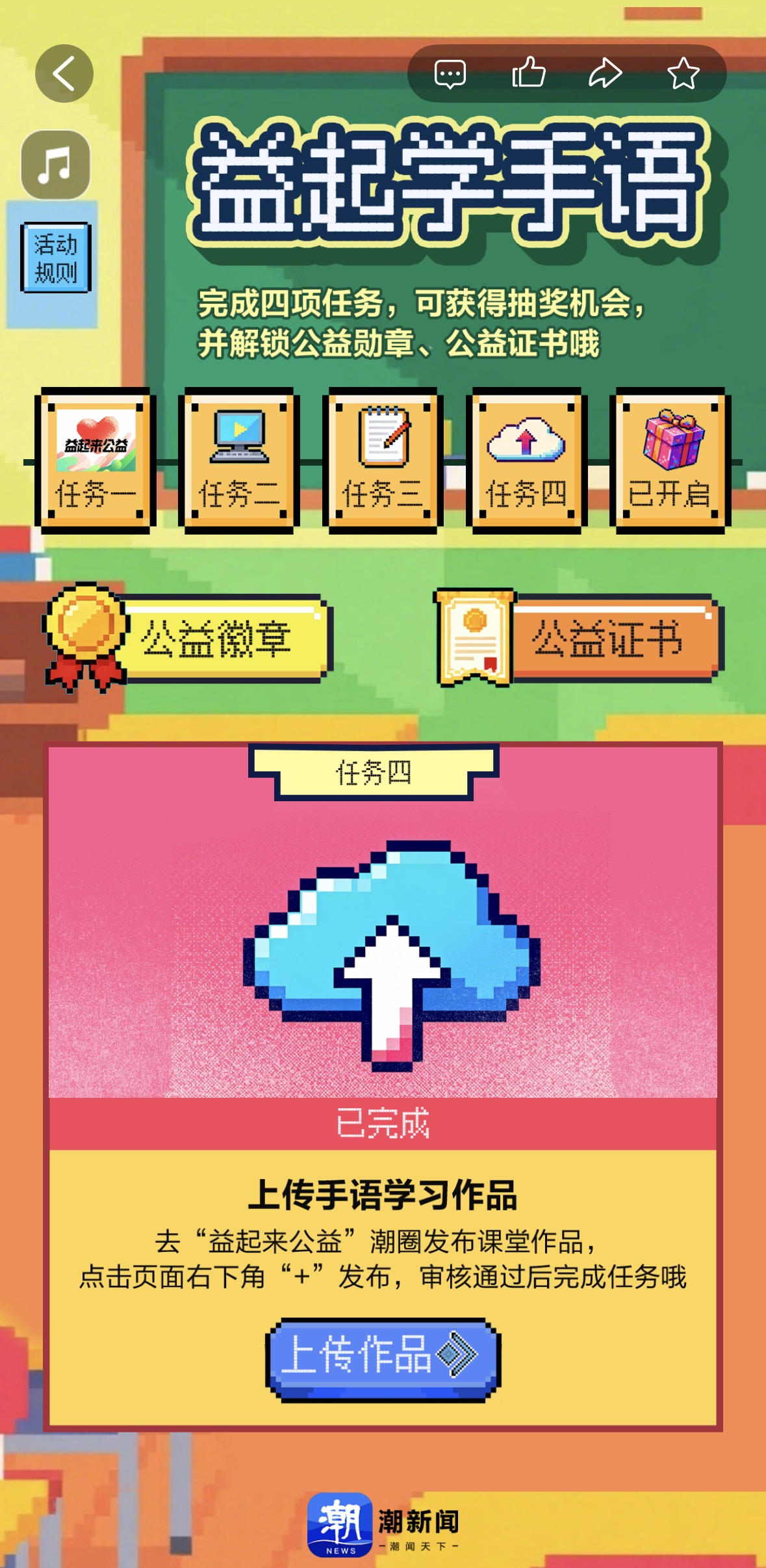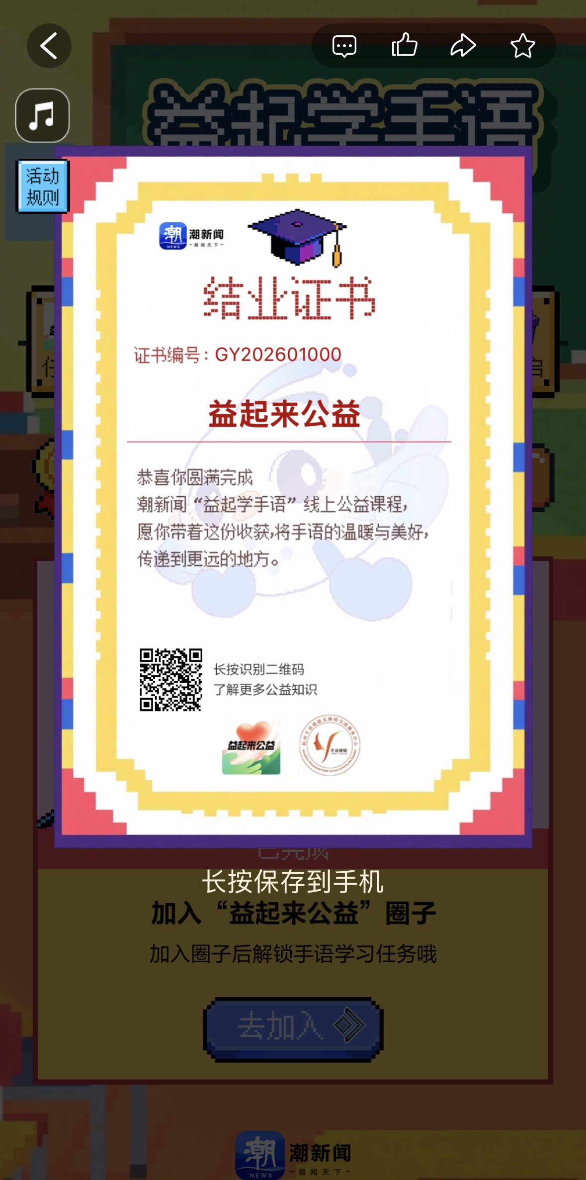 你学会用手语说“新年快乐”了吗?“益起学手语”公益课堂陪你用手语传递温暖 “益起学手语”是由公益圈携手手语姐姐团队共同推出的趣味手语公益课。课程采用闯关模式,让你在一步步解锁任务、收获成就的过程中,轻松掌握无障碍志愿服务中的实用技能。 这里没有枯燥的理论,只有满满的“干货”:无障碍设施怎么用更规范?推行轮椅时有哪些贴心小技巧?引导视障人士需要注意什么?如何用手语生动表达日常问候?手语姐姐毛董莱老师还会在“公益课堂”板块持续更新手语教学,陪你一起进步。 一个多月过去了,你的学习进度如何?掌握了多少新表达?小编发现,已经有不少小伙伴在圈子里晒出了自己的学习成果——灵巧的双手比划出“你好”“谢谢”“新年快乐”等温暖词句。 如果你也对这门课程感兴趣,欢迎随时加入学习!目前线上课堂仍在进行中,参与在线答题、上传你的手语作品,完成所有关卡挑战后,不仅有机会参与抽奖,赢取潮新闻文创、手艺超人文创等精美新年好礼,还将获得专属的“公益学习达人”电子勋章和一份值得珍藏的结业电子证书!(参与链接可点击“益起来公益”潮圈页面顶部,图片置顶位的“益起来公益线上公益课堂开课啦”) 已经完成全部关卡的朋友,别着急,小编近期将陆续寄出你们抽中的礼品,敬请期待哦~