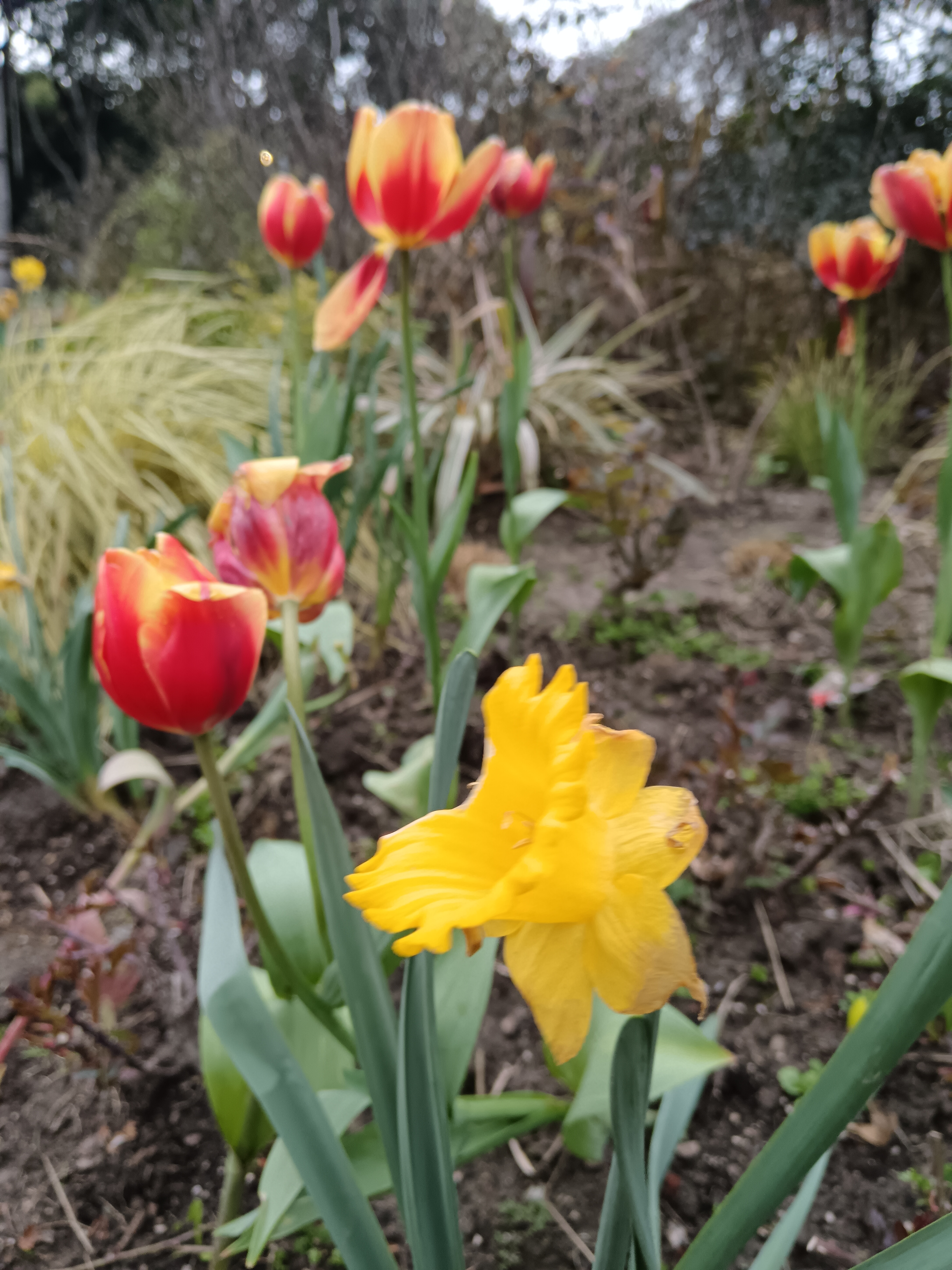 郁金香和水仙在春日花坛里悄悄比美,红黄相间,绿叶打call~随手一拍就是春天!🌷