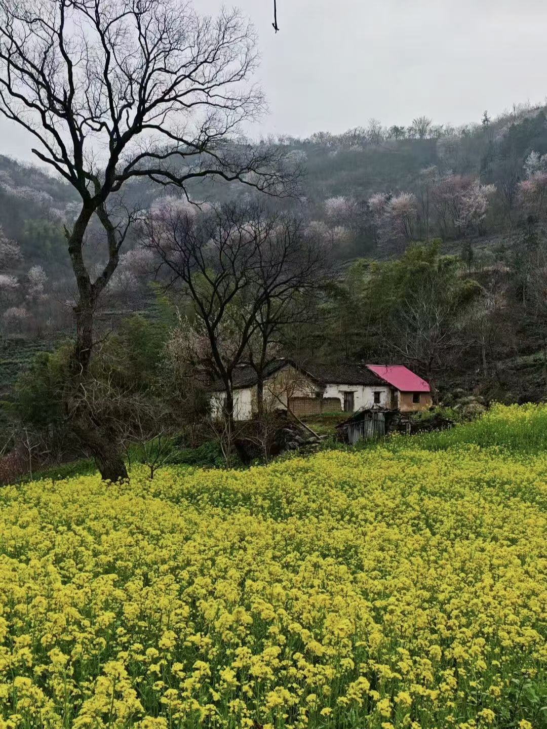 油菜花田畔,红顶农舍静立,光秃枝桠间樱花初绽,梯田蜿蜒如诗,大别山春色在阴天里更显温润清幽。