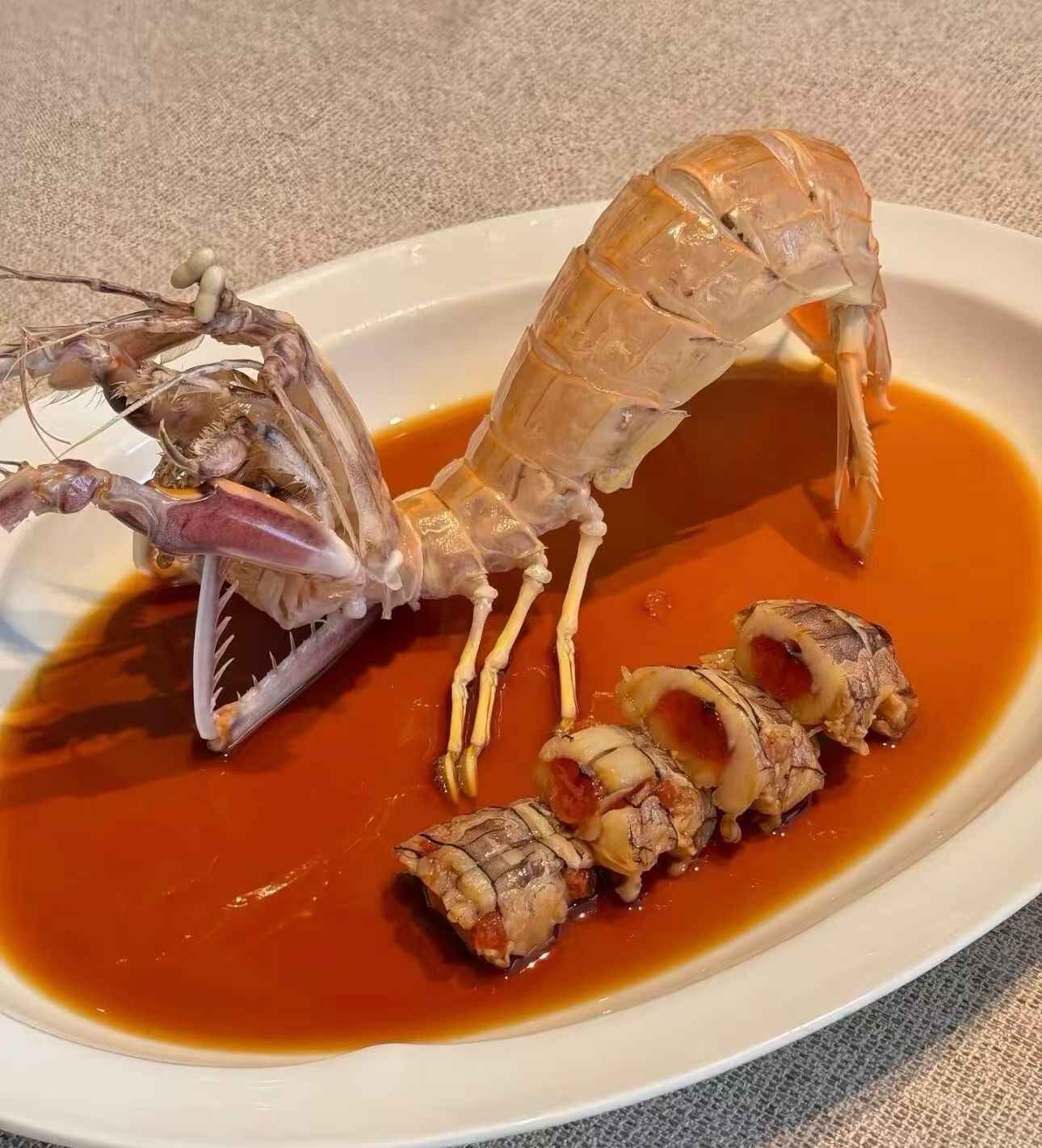 盘中造物,海之馈赠的凝眸 瓷盘似一方素净的岸,托着海的精魂——一只皮皮虾,以雕塑般的姿态横陈于琥珀色的酱汁里。它的甲壳半透明的棕褐,泛着生涩的光,仿佛还裹挟着深海的潮气;螯足张开的弧度里,藏着捕食者的凌厉,却又因这静止的姿态,添了几分被时光定格的戏剧感。几截切分的虾身,露出内里绯红的膏黄与莹白的肉,像绽裂的玛瑙,将海的醇厚、生命的丰腴,都锁在这一方红亮的汤汁中。 酱汁如浓缩的海浪,浓稠地漫过盘底,色泽是热烈的橘红,似落日熔金时海面的余烬,又似渔人灶膛里熬煮的时光。皮皮虾的肢体浸在其中,壳上的纹理与汤汁的流泽相融,恍若它本就是从这酱色里生长而出,带着海的咸涩与火的炙烤,凝成一盘可触的诗。 这一方盘中景,是匠人对食材的敬畏,亦是大海对餐桌的馈赠。它以凝固的形态,诉说着潮汐的律动、捕捞的艰辛、烹饪的匠心。当目光抚过甲壳的褶皱、膏黄的艳色、酱汁的光泽,仿佛能听见海浪拍岸的声响,闻到渔港清晨的腥风,尝到味蕾触碰到鲜美的瞬间——那是海的魂魄,在瓷盘里安了家,以静默的姿态,邀人共赴一场关于“鲜美”的盛宴。 盘外的麻布桌布,纹理朴素如滩涂,衬得这盘海鲜愈发醒目。它不似庭院池畔的雕塑那般借水成画,却以酱汁为墨、虾身为笔,在白盘上绘就海的缩影。每一道纹路、每一抹色泽,都是自然与人文的对话,是生命从深海到餐桌的旅程,在这一刻,被温柔地定格,供人凝视,供人品咂,供人在烟火人间里,触摸到海洋的脉搏。 (图源达宝)