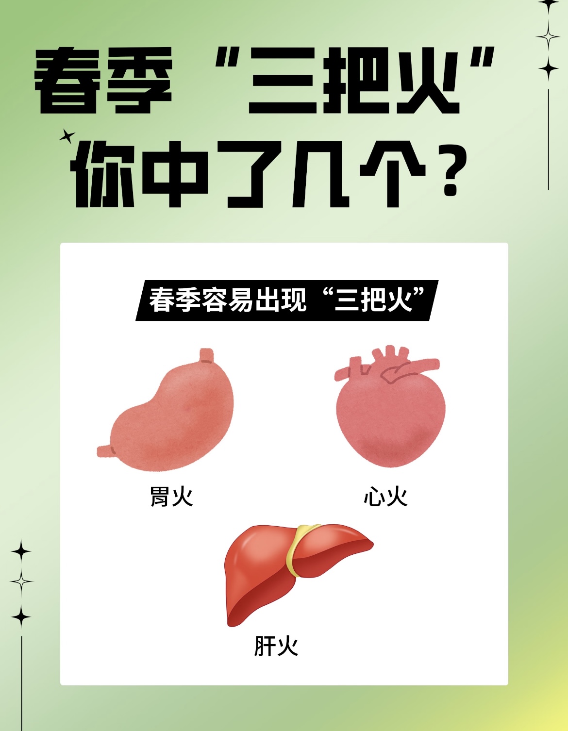 【中医养生】春季“三把火”,你中了几把? 春天来了,万物复苏,阳气升发,但很多人却因为“上火”而烦恼。 🌱中医认为,春季容易出现“三把火”:肝火、胃火和心火。今天就来聊聊这“三把火”,以及如何轻松灭火! 第一把火:肝火 肝火旺盛是春季最常见的问题之一。主要症状包括头痛、头晕、耳鸣、眼干、口干舌燥、两肋胀痛、睡眠不稳等。 原因:春季阳气升发,肝气也随之上升。如果情绪波动大、压力过大,或者饮食辛辣刺激,就容易导致肝火过旺。 灭火小妙招: - 饮食调理:多吃清淡食物,如桑叶茶、绿茶,搭配冰糖,清热降火。 - 穴位按摩:每天按揉行间穴(脚背大脚趾和第二脚趾之间),每次3分钟,帮助疏肝理气。 第二把火:胃火 胃火旺盛的人常表现为胃部灼热疼痛、口臭、牙龈肿痛、便秘等。 原因:春季肝木克脾土,脾胃运化功能减弱,加上饮食不节制,容易导致胃火上炎。 灭火小妙招: - 饮食调理:多吃黄绿色蔬菜和时令水果,如银耳、小米粥,帮助清热养胃。 - 穴位按摩:按揉内庭穴(脚背第二、三脚趾之间),每天3-5分钟,缓解胃火。 第三把火:心火 心火旺盛的表现包括舌尖发红、口舌生疮、失眠多梦等。 原因:春季阳气升发,心火容易被扰动,加上情绪不稳定,容易引发心火。 灭火小妙招: - 饮食调理:多吃白色食物,如莲藕、百合,帮助清心安神。 - 穴位按摩:按揉神门穴(手腕内侧),每天3分钟,帮助改善睡眠。#春天养生#