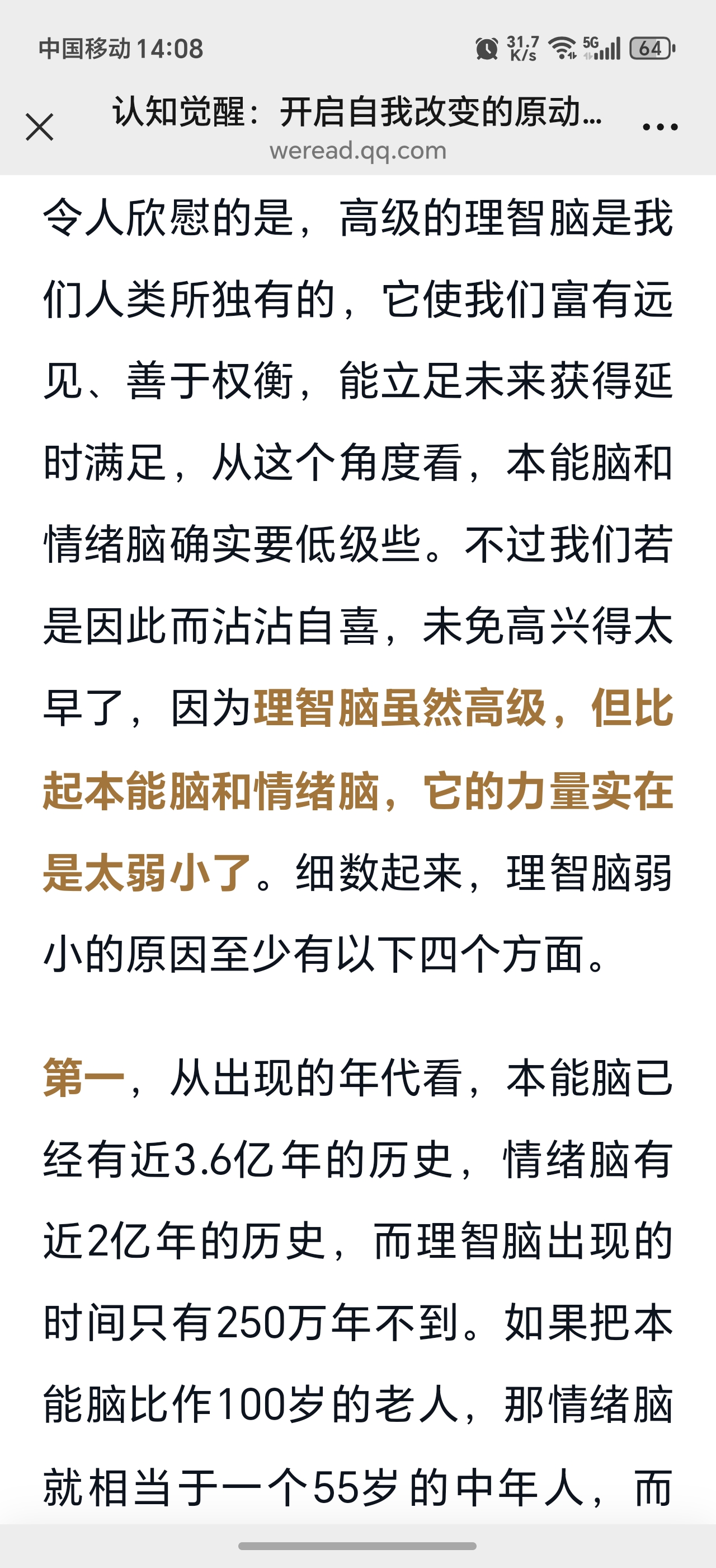 打卡第二天 理智脑虽然高级,但比起本能脑和情绪脑,它的力量实在是太弱小了。