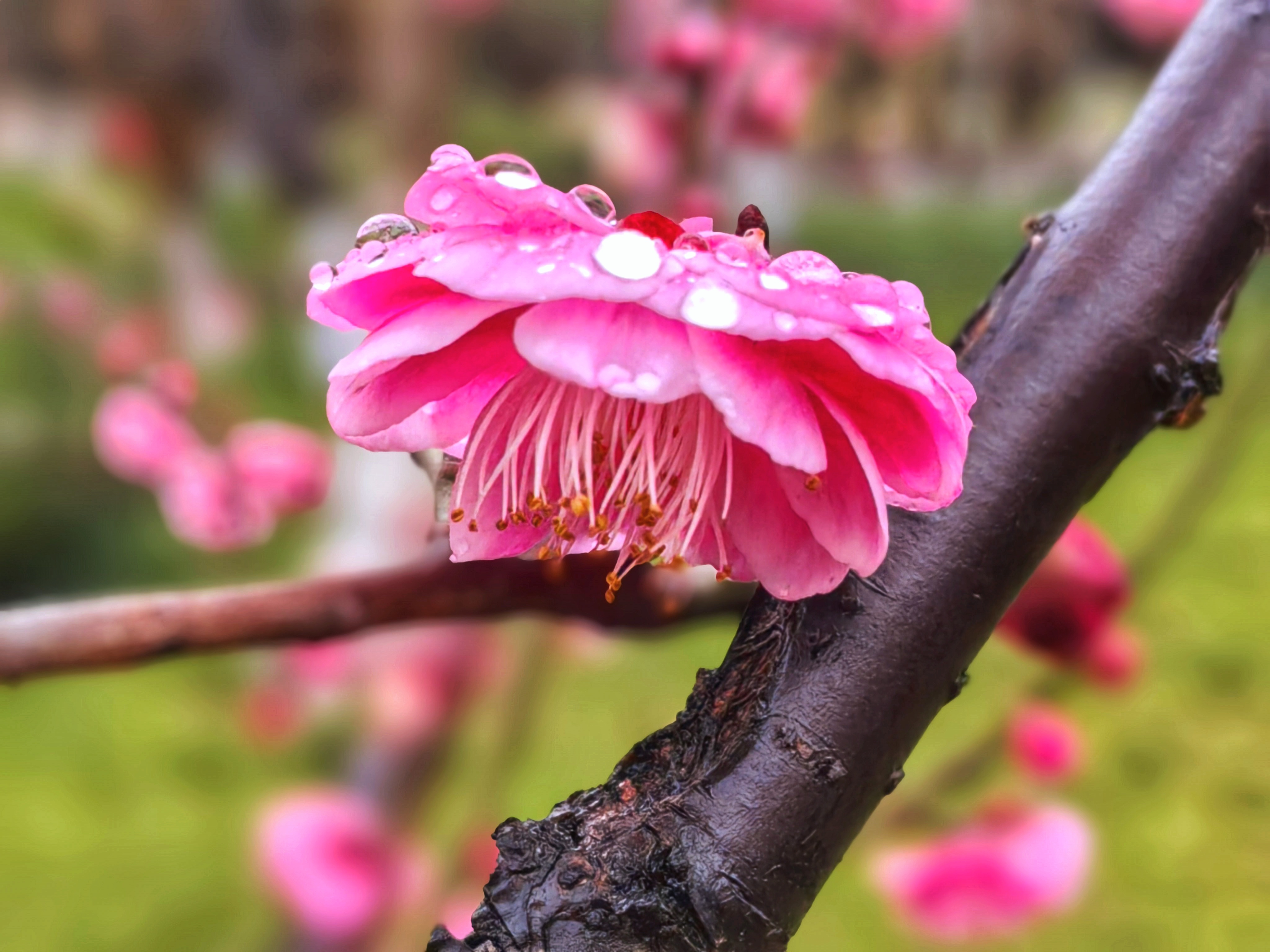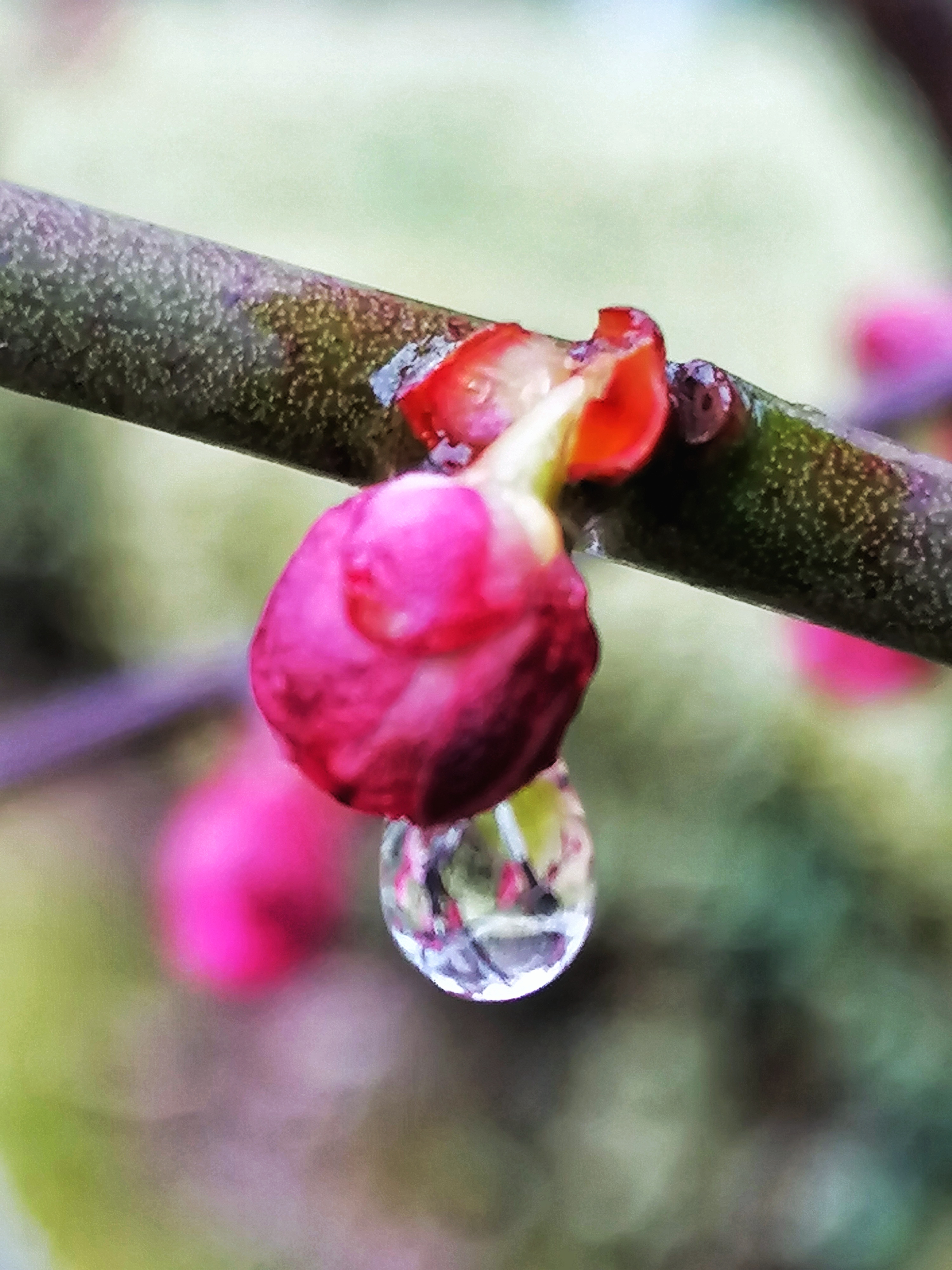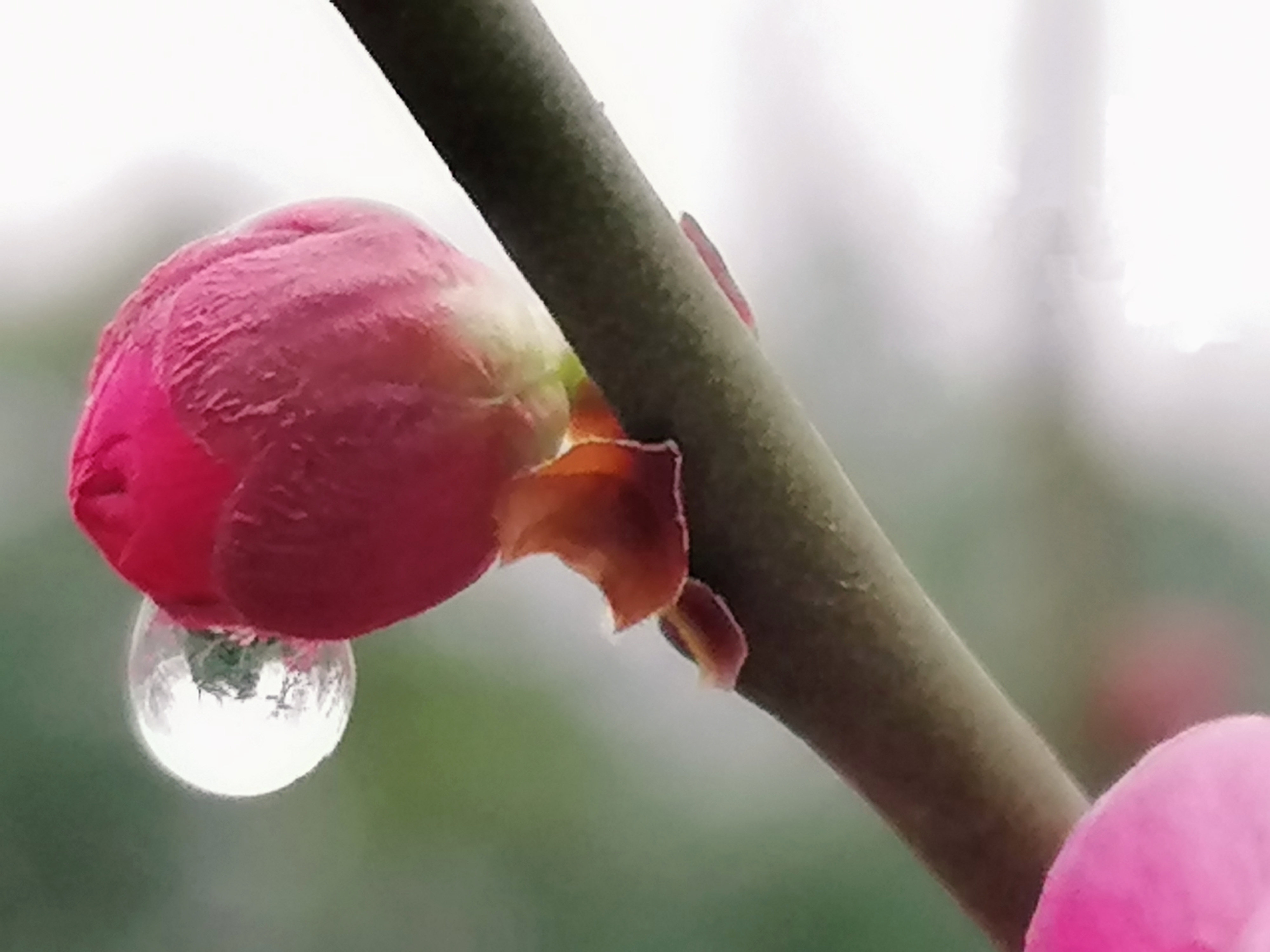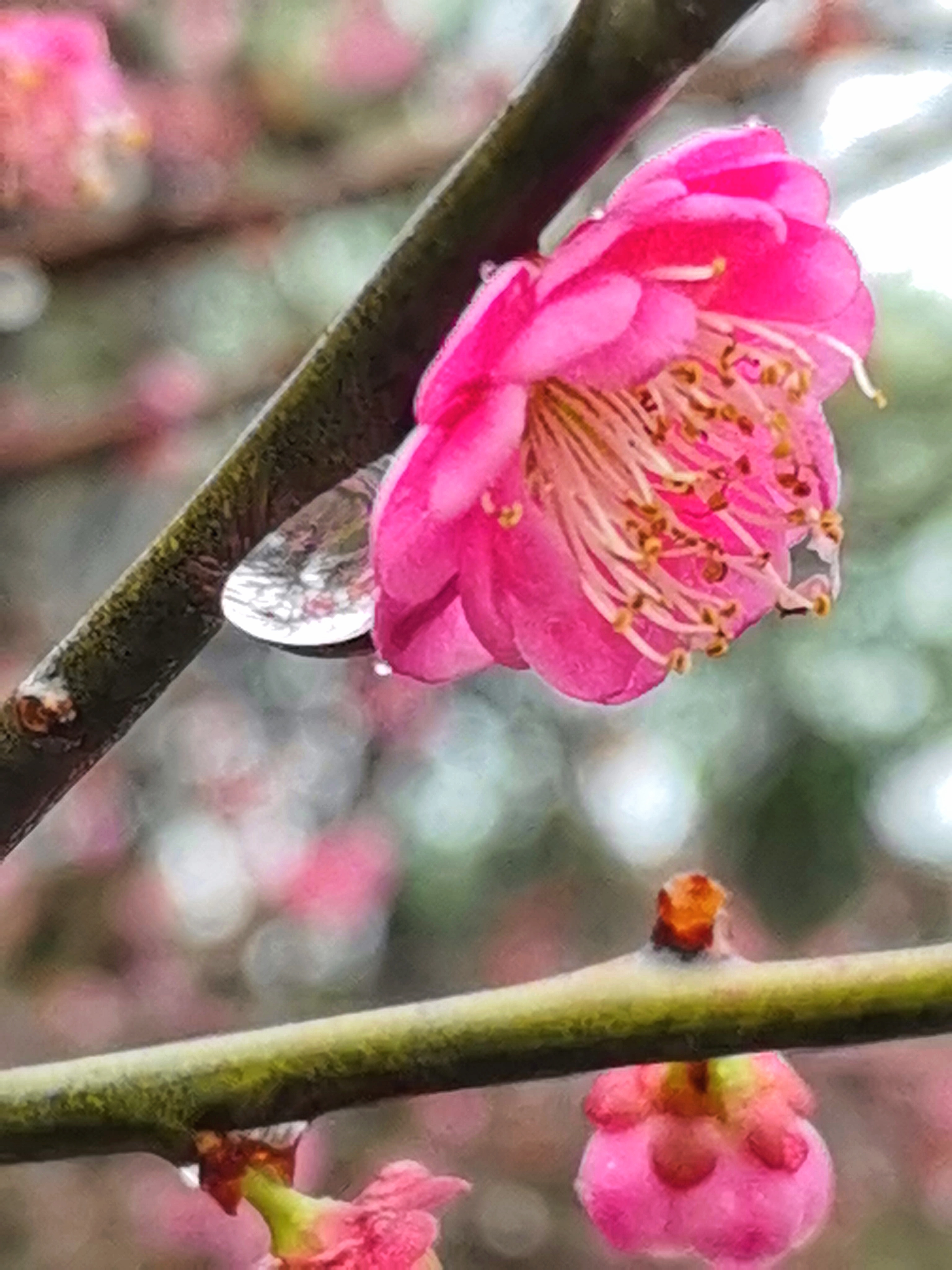 只留清气满乾坤 春雨如丝,滋润着朵朵红梅,洗尽花瓣上的尘埃,愈发娇艳欲滴。雨丝凝聚成水珠,或挂枝头,或沾花瓣,晶莹剔透,内藏着秀丽春光,凸显清新神韵。宋代著名女诗人朱淑真《雨中看梅》诗云:“疏梅点点雨中开,冷艳幽香独自来。不似桃花争艳丽,只将清气满庭台。” 雨后复阳,红梅昂首怒放,笑傲蓝天,只留清气满乾坤!