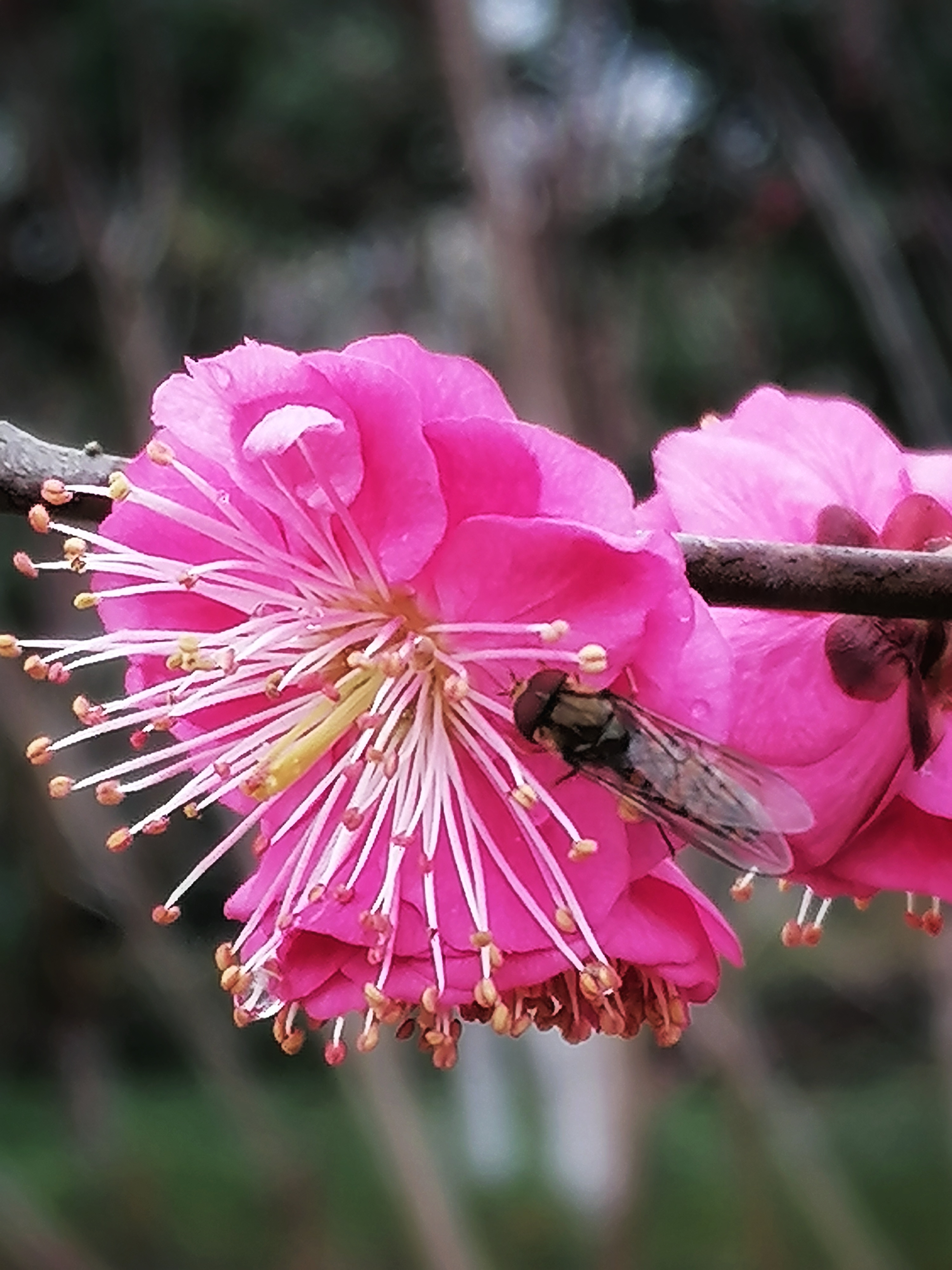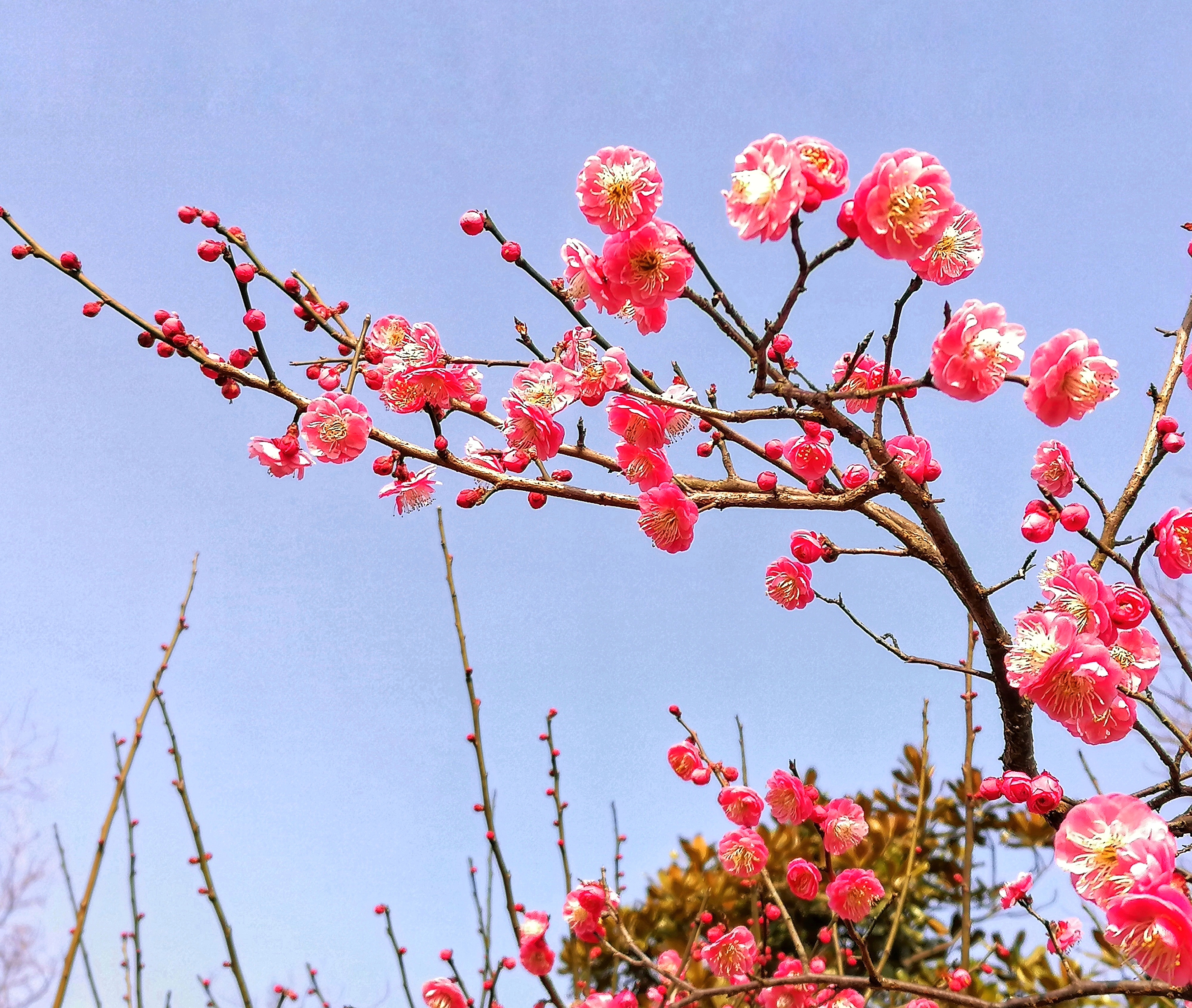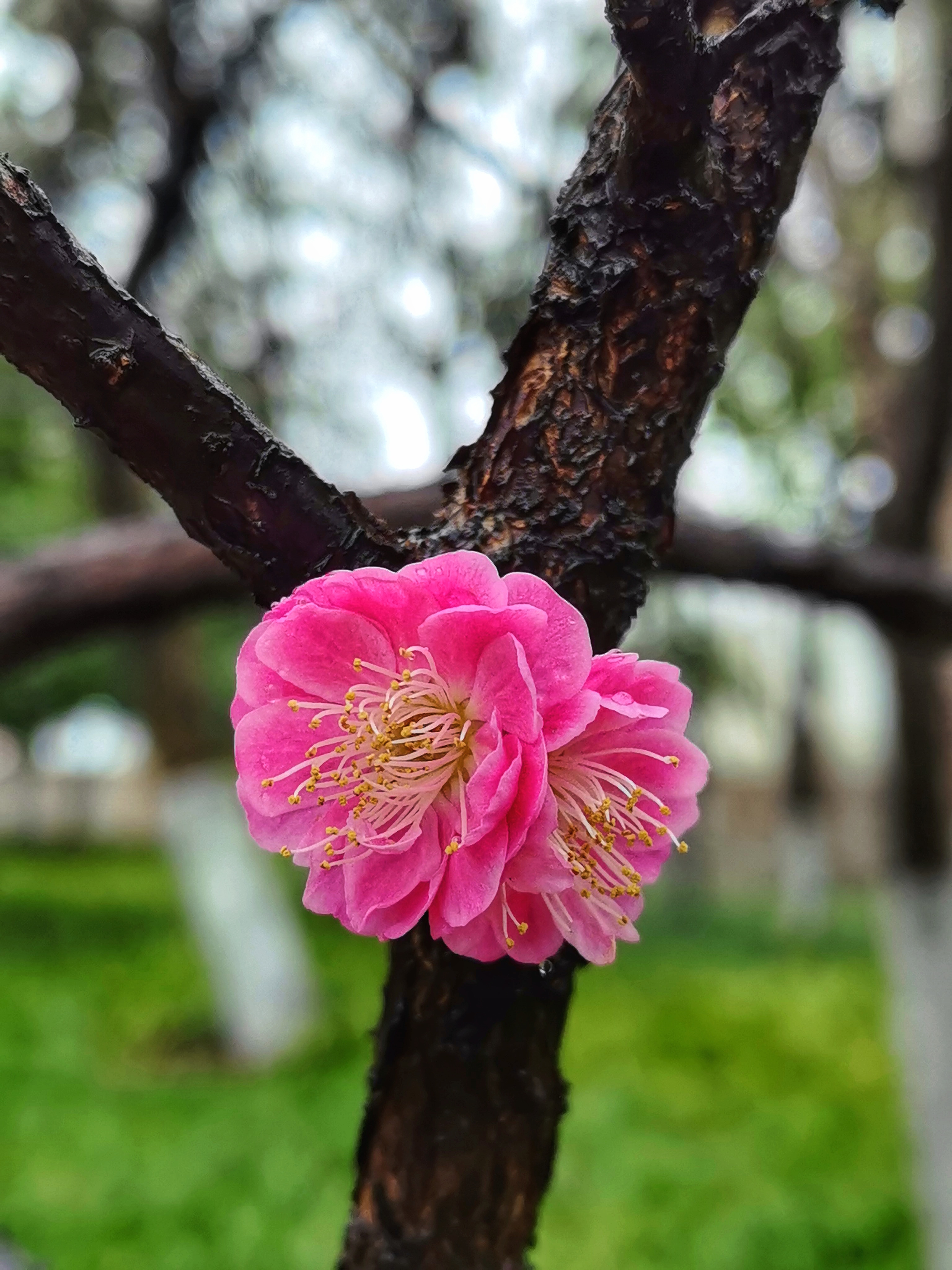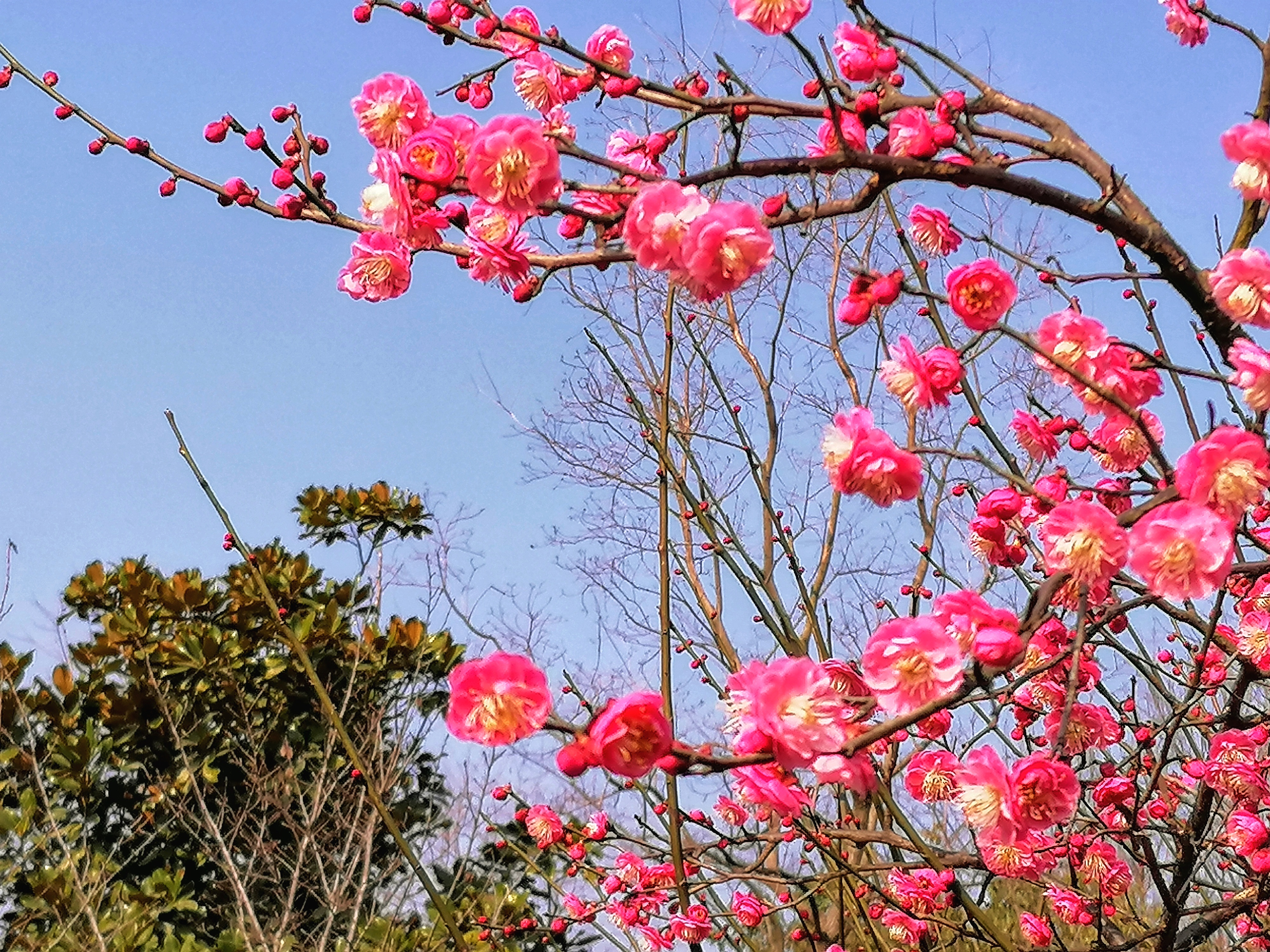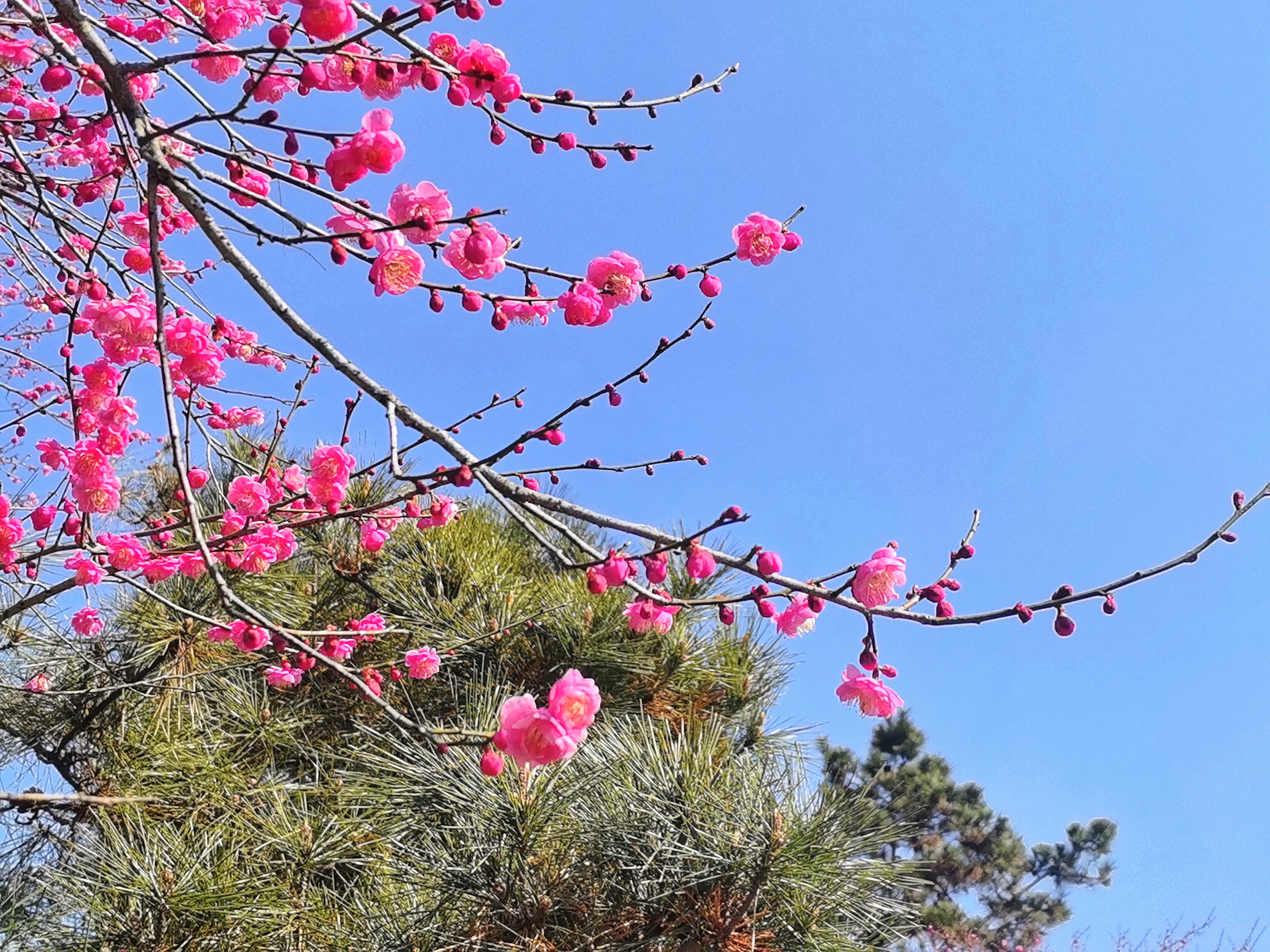 只留清气满乾坤 春雨如丝,滋润着朵朵红梅,洗尽花瓣上的尘埃,愈发娇艳欲滴。雨丝凝聚成水珠,或挂枝头,或沾花瓣,晶莹剔透,内藏着秀丽春光,凸显清新神韵。宋代著名女诗人朱淑真《雨中看梅》诗云:“疏梅点点雨中开,冷艳幽香独自来。不似桃花争艳丽,只将清气满庭台。” 雨后复阳,红梅昂首怒放,笑傲蓝天,只留清气满乾坤!