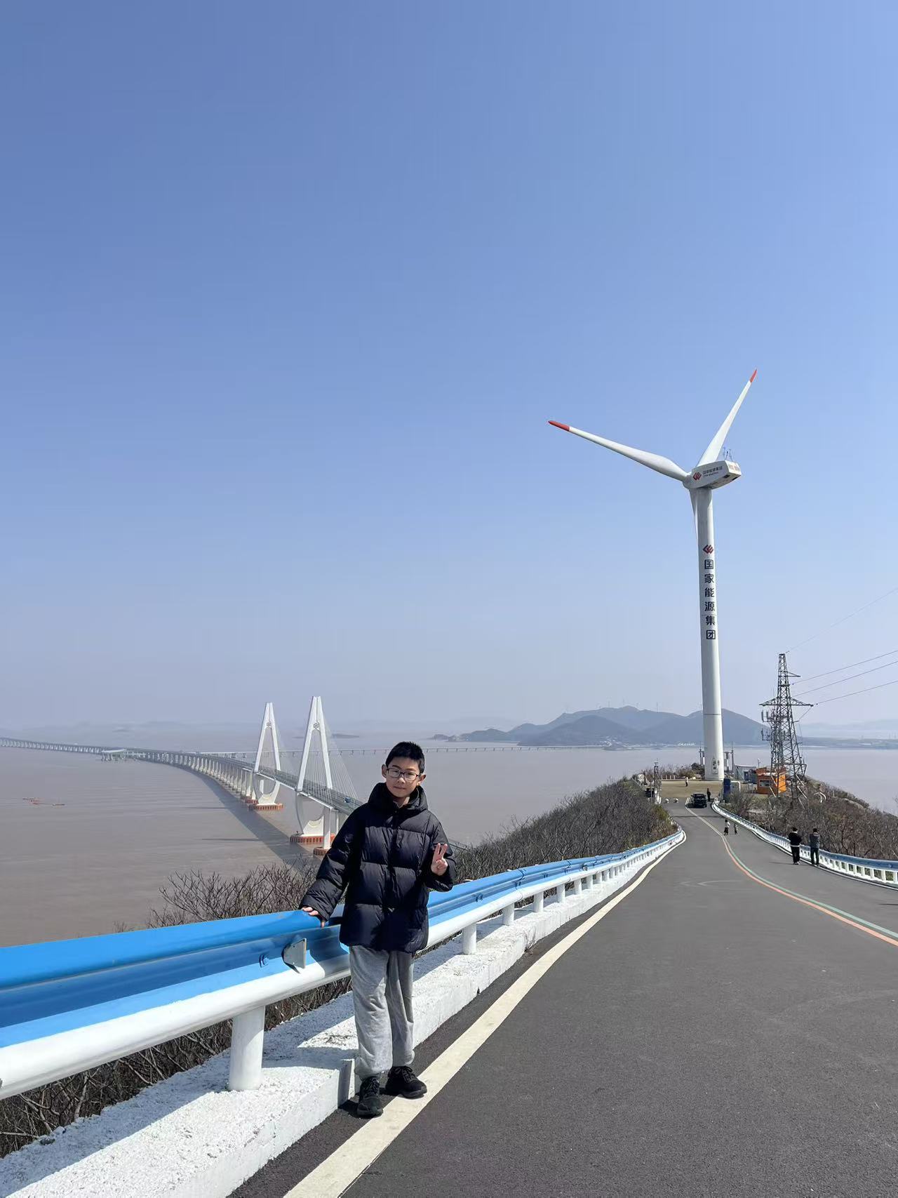 舟山马目大风车 “你听到过风车的呼呼声吗?”我听到过。“你感受过风车振动的压迫感吗?”我感受过。“你感受过站在最高点,却也渺小吗?”我感受过。 开学第一周的周末,阳光正好,爸爸妈妈带着我前往舟山马目感受舟山特别的大风车。一路呼啸而去,感受路边显眼的站牌,路边丰收的大棚,田野里刚报春的油菜花。在这“山脚下”,在这“大海边”,我懂得了“天地辽阔,我很渺小”。初阳、白云、大海、船只,这些描绘着最美的舟山,不止朝阳、还有夕阳。 在山顶,我俯瞰大海,俯瞰大山,但却仰望给我们力量的舟山大风车,人生未必能站在最高点,但是,有风的时候一定要用力蓄电,风停的时候蓄能储能,等下一次风起。南海实验小学 五(1)班 朱瀚琛