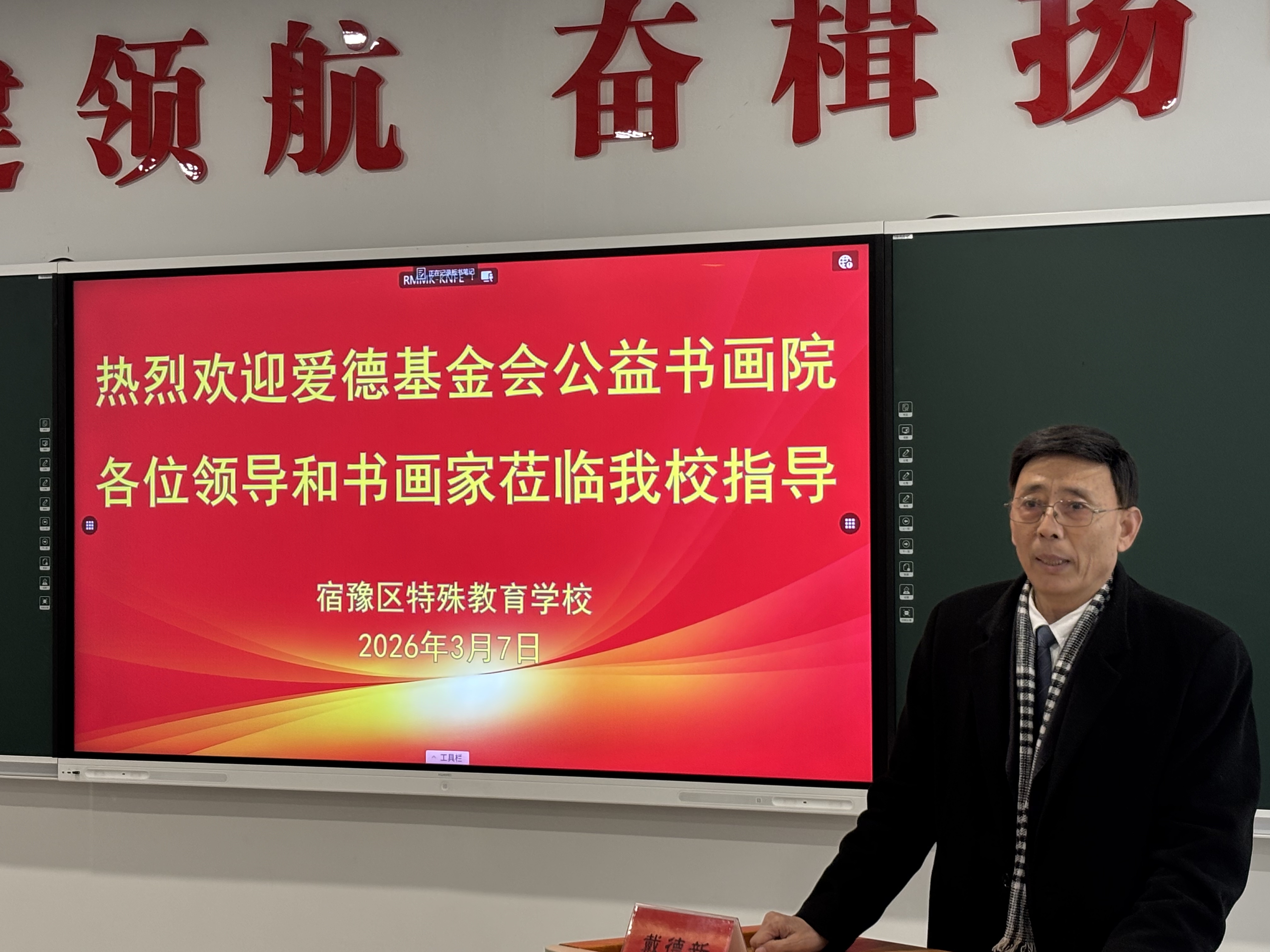 墨香浸润心灵 爱心传递温情——爱德基金会公益书画院走进宿迁市宿豫区特殊教育学校 爱德照新报道 春意渐浓,爱心涌动。2026年3月7日下午,由爱德基金会公益书画院主办,宿迁市宿豫区特殊教育学校(市特殊教育指导中心)与南京汉堂文化传媒协办的“墨香浸润心灵”公益活动在宿豫区特殊教育学校隆重举行。来自省内的六位知名书画家走进校园,通过举办公益讲座、校园文化交流及现场笔会等形式,为师生送去了一场丰盛的艺术盛宴和精神慰藉。 下午2时,活动由宿迁青年书协创会主席范青主持。首场活动为书法公益讲座,由中国书法家协会会员、宿迁市青年书协副主席王海洋先生主讲。王老师深入浅出地讲解了书法的历史渊源与基本技法,并与台下的老师和学生亲切互动。尽管面对的是特殊儿童,但他耐心细致的讲解和生动的示范,迅速拉近了与孩子们的距离,激发了大家对传统书画艺术的浓厚兴趣,现场不时响起热烈的掌声。 讲座结束后,举行了校园文化汇报会。宿豫区特殊教育学校张金科校长向书画家及教育工作者详细介绍了学校的办学理念、特色课程以及在特殊教育领域取得的丰硕成果。同时观看了特殊教育学校学生表演的视频节目。书画家们对学校“有爱无碍”的教育环境和老师们无私的奉献精神给予了高度评价,双方就如何进一步将美育融入特殊教育进行了深入的探讨与交流。 下午4时30分,备受期待的现场公益笔会正式开始。爱德基金会公益书画院常务院长戴德新致辞。他向辛勤耕耘在特教一线的教师们表达了崇高的敬意,并阐述了此次公益活动的初衷:“艺术是通往心灵的窗户,我们希望用笔墨为孩子们打开一扇窗,让他们感受到世界的多彩与温暖。”他表示,爱心书画家们将以艺术为媒介,传递社会的关怀,并鼓励孩子们勇敢追求梦想。 随后,笔会正式启动。现场墨香四溢,气氛热烈。参加此次公益笔会的书画家: 范青先生(中国书法家协会会员、宿迁青年书协创会主席)草书如行云流水,韵致超然;隶法显高古沉雄,笔力千钧; 李根宝先生(爱德基金会公益书画院秘书长、中国美术家协会会员)挥毫泼墨,山水小品意境悠远; 马宏峰先生(爱德基金会公益书画院秘书长、中国书法家协会会员、江苏省美术家协会会员)笔走龙蛇,其书法作品苍劲有力; 唐晓斌先生(中国书法家协会会员、盐城市书法家协会副秘书长)笔法精到,引得众人围观; 储卫先生(中国书法家协会会员、宿迁青年书协执行主席)与再次登台的王海洋先生也即兴创作,一幅幅精美的书画作品跃然纸上。 书画家们以饱满的热情,围绕励志名言及美好寓意进行创作。不仅展示了高超的艺术水准,更将对特殊儿童的关爱之情融入笔端。同学们围在桌前,目不转睛地看着艺术家们创作,眼中充满了好奇与惊喜。有书画基础的学生还得到了名家的现场指点,受益匪浅。 经过一个半小时的精心创作,书画家们共创作近五十幅精美的书画作品。在随后的作品捐赠仪式上,戴德新院长代表书画家们将这些凝聚着爱心与祝福的作品郑重地交到学校领导手中。现场再次响起热烈的掌声。这些作品将被学校收藏或用于美化校园环境,让艺术的芬芳长久地陪伴孩子们成长。 据悉,参与此次活动的爱心书画家均已纳入爱德基金会公益书画院“爱心书法家人才库”。作为公益回馈,南京汉堂文化传媒将为每位书画家提供一次免费的公众号宣传,并特邀其参加下半年举办的苏北5市年度公益书法家作品展,以此鼓励更多的艺术工作者投身公益事业。 此次活动不仅为宿豫区特殊教育学校的师生带来了高雅的艺术享受,更是一次心灵的抚慰与精神的激励。爱德基金会公益书画院表示,未来将继续整合社会资源,开展更多形式多样的公益活动,让艺术的阳光照亮社会的每一个角落。 爱德基金会公益书画院办公室朱婷婷老师、宿豫区委教育工委委员、教师发展中心副主任凌朝阳及学校领导和教师50人参与了今天公益活动。