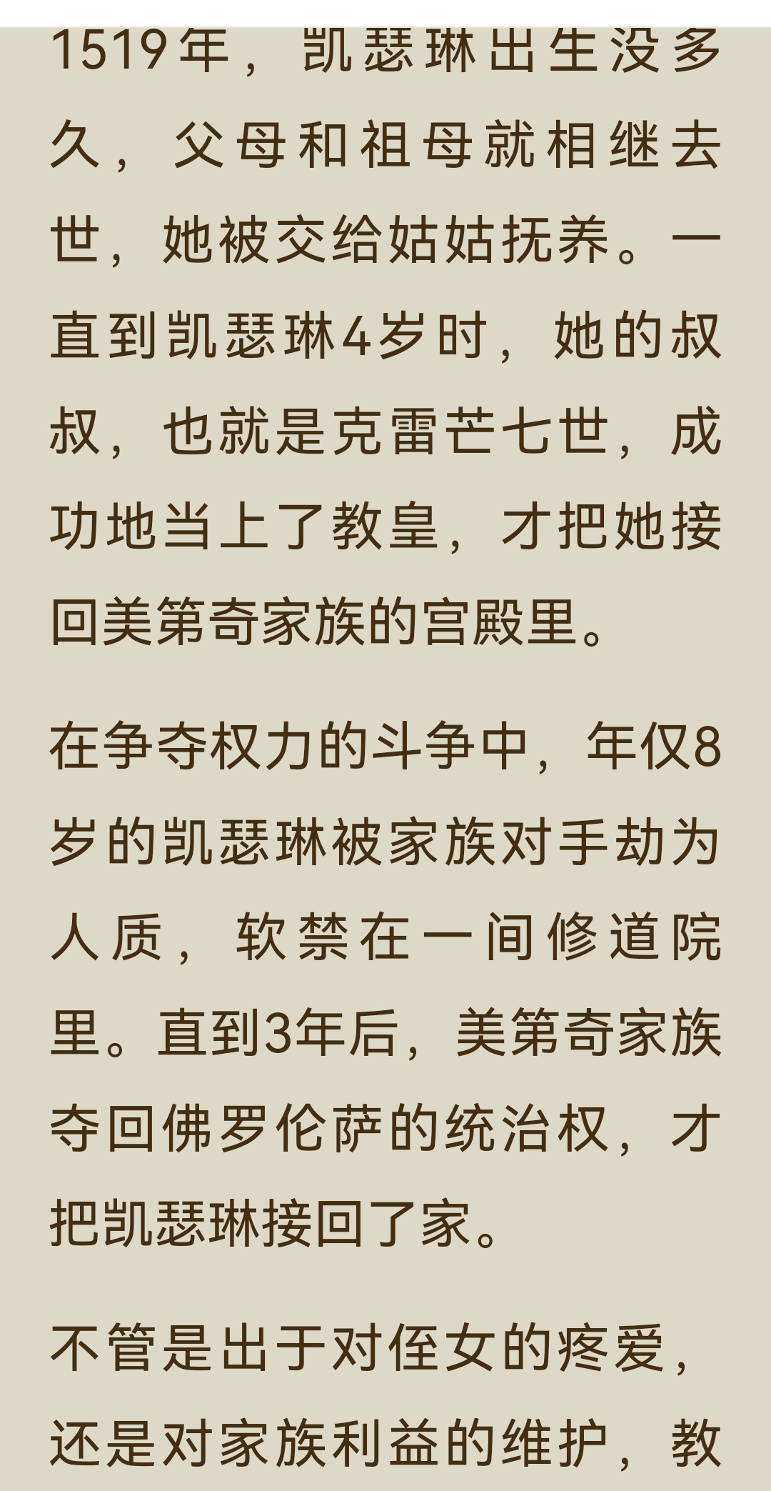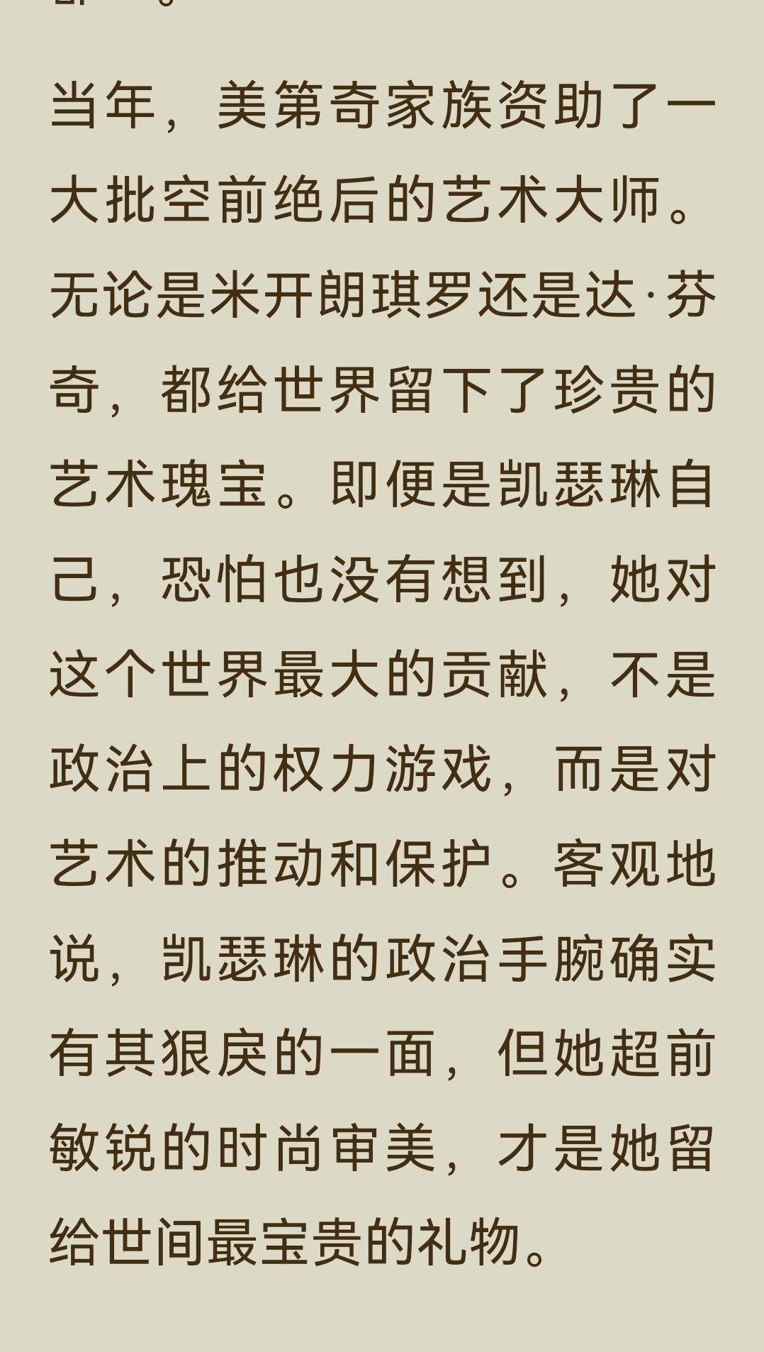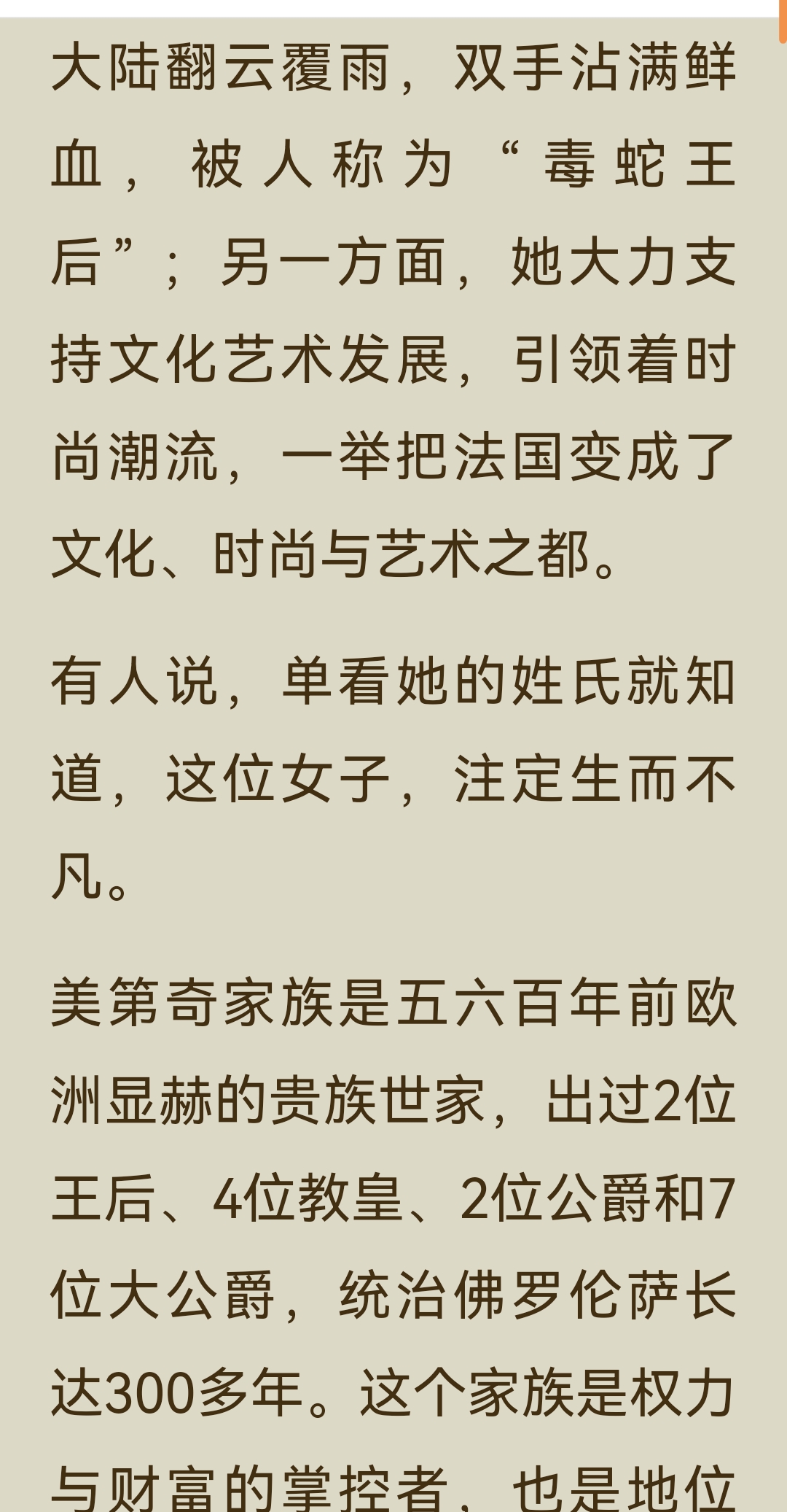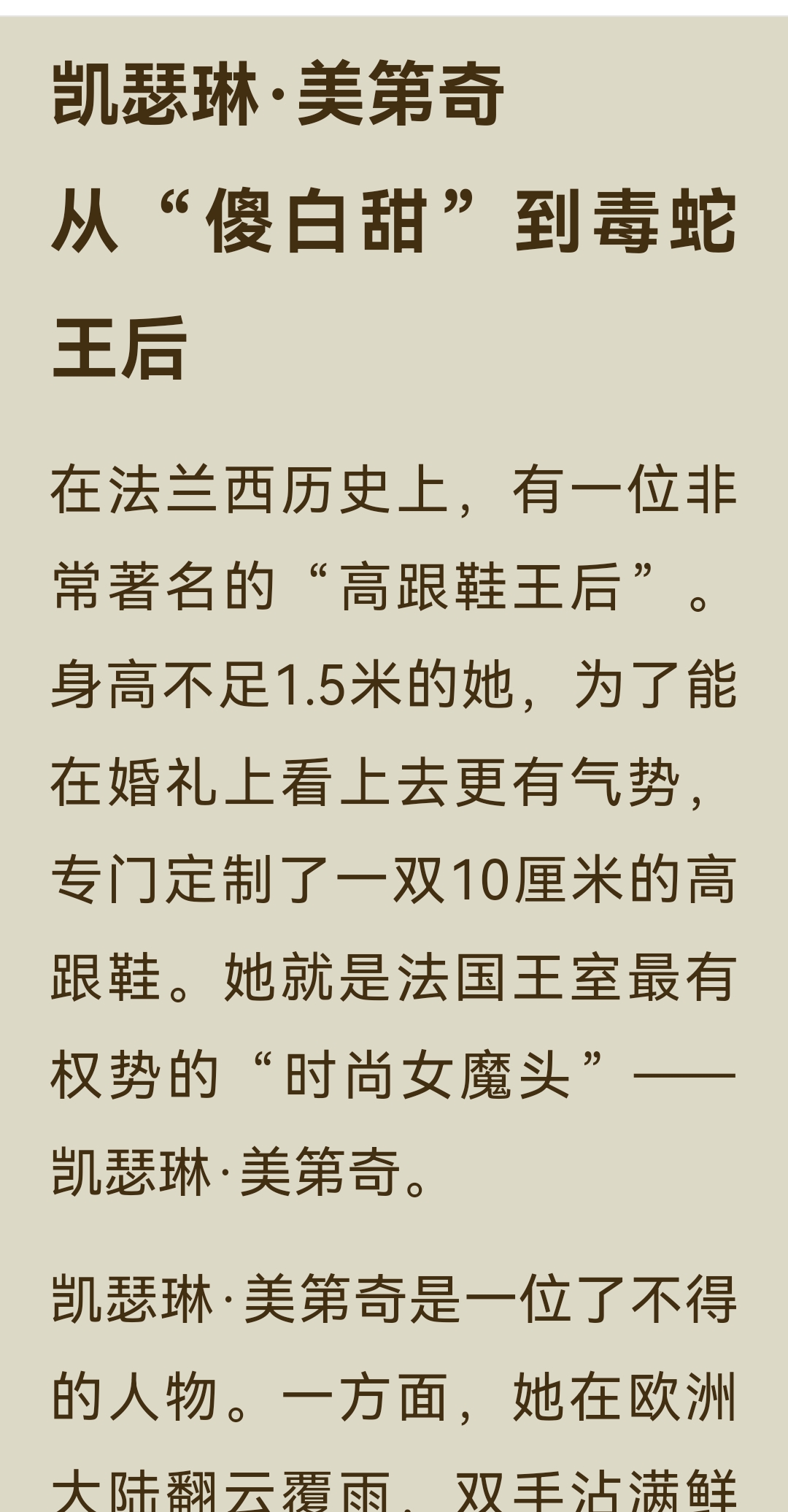 《了不起的女子》“气场篇”中“凯瑟琳·美第奇”一节,讲述了这位从佛罗伦萨落魄孤儿到法国“毒蛇王后”的传奇一生: 一、主要内容 1. 从孤儿到王后 凯瑟琳出生不久便父母双亡,8岁时被家族对手劫为人质,在修道院软禁3年。后来,她作为美第奇家族的联姻棋子,嫁给法国王子亨利。婚礼上,为了在气势上压倒丈夫的情人戴安,她定制了10厘米的高跟鞋,惊艳全场。婚后,亨利对她十分冷淡,心有所属的戴安却成为她在宫廷中唯一的突破口,凯瑟琳用佛罗伦萨的美食和精致餐具打动了戴安,最终在其劝说下,亨利与她生育了10个子女。 2. 摄政与铁腕统治 1559年,亨利二世在比武中意外身亡,凯瑟琳以太后身份摄政,成为法国实际的掌权者。面对宗教与政治的动荡,她手段狠戾,策划了针对新教徒的“圣巴托洛缪大屠杀”,因此被称为“毒蛇王后”。她的两个儿子先后继位又早逝,连续的丧子之痛和尖锐的社会矛盾,让她的统治愈发残酷。 3. 时尚与艺术的推手 尽管政治手段备受争议,凯瑟琳却对法国的文化与时尚影响深远。她推广了尖头穆勒鞋、束胸衣等时尚单品,将意大利的美食、餐具和艺术品味带入法国宫廷,为法国成为“文化、时尚与艺术之都”奠定了基础。她资助了米开朗琪罗、达·芬奇等艺术大师,推动了文艺复兴在欧洲的传播。 二、阅读体会 真正的气场,是在绝境中学会生存,在权力中懂得取舍的清醒与狠绝。 她的一生都在权力的漩涡中挣扎:童年丧亲、沦为棋子、婚姻不幸、丧子之痛……但她从未被命运打垮,反而在一次次危机中淬炼出钢铁般的意志。她用高跟鞋打破身高的限制,用美食撬开情敌的心扉,用铁腕手段稳固统治,每一步都走得精准而决绝。 凯瑟琳用一生证明:即使出身不由己,命运也可以由自己改写;即使身处绝境,也能凭借智慧与决心,将一手烂牌打出王炸。而她对艺术与时尚的推动,更让我们看到,权力之外,审美与品味才是一个人留给世界最持久的印记。