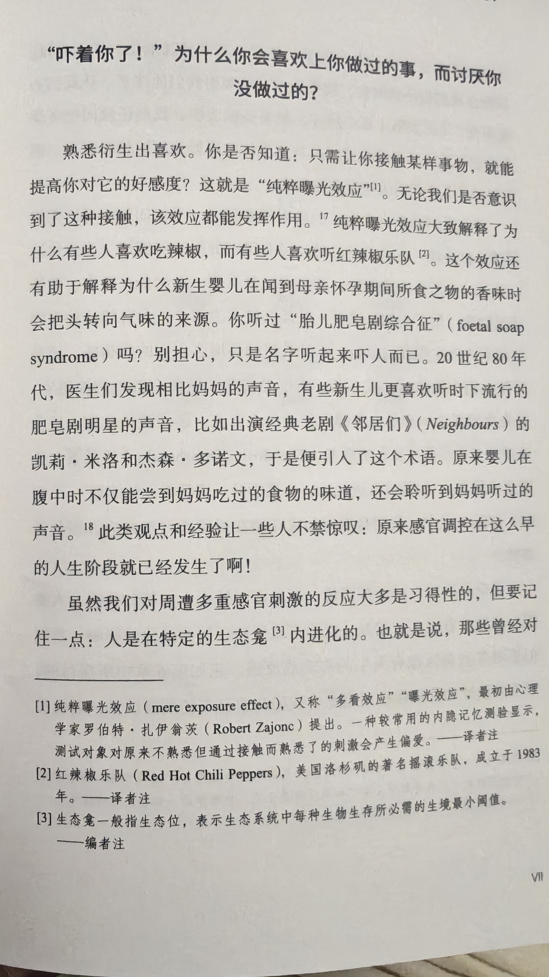 书名《这种感觉真棒》 人们只要接触到某样事物,就能提高对他的好感度,这就称作纯粹曝光效应。 原来婴儿在腹中时不仅能尝到妈妈吃过的食物的味道,还会聆听妈妈听过的声音。这就是感官调控的最早阶段。
