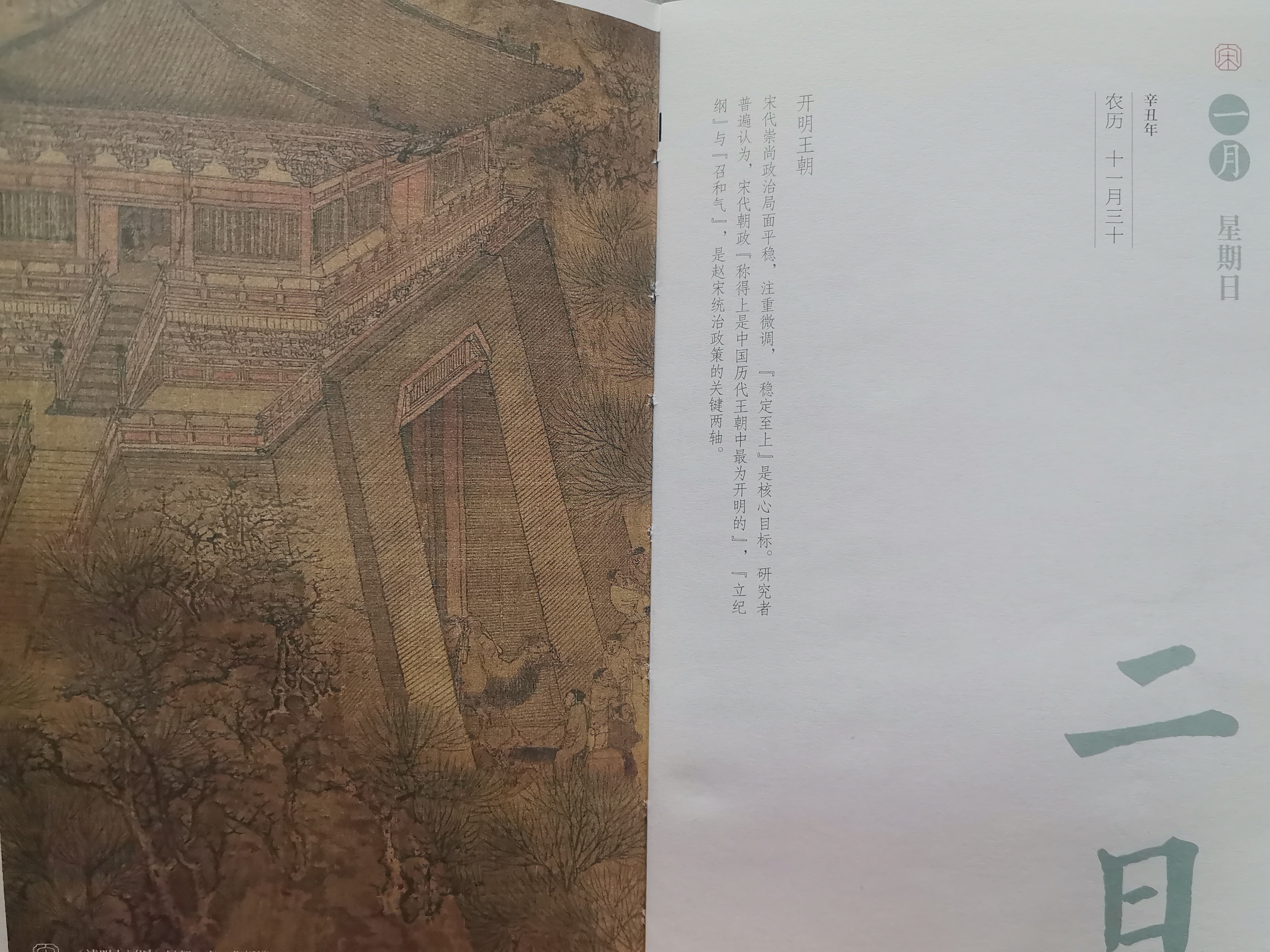 《宋朝日历》辛丑年农历十一月三十:宋代崇尚政治局面平稳,注重微调,『稳定至上』是核心目标。研究者普遍认为,宋代朝政『称得上是中国历代王朝中最为开明的』,『立紀纲』与『召和气』,是赵宋统治政策的关键两轴。