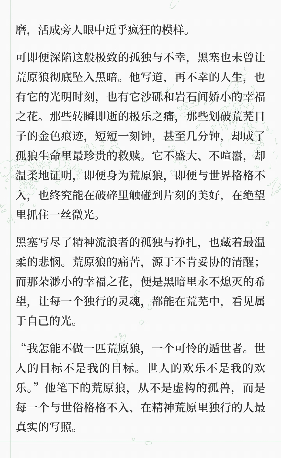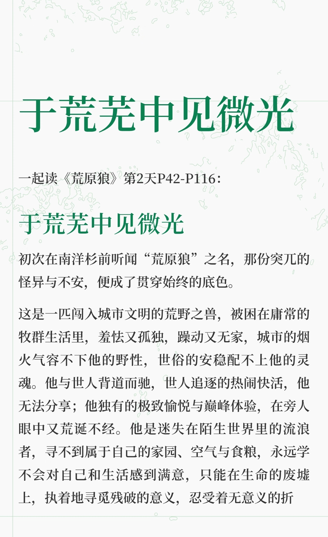 文学经典 | 《荒原狼》(二) 一起读《荒原狼》第2天第42-116页: 于荒芜中见微光 《荒原狼》描绘了一匹迷失在城市中的荒野之兽,他孤独、躁动,无法融入世俗生活,却在绝望中寻找一丝微光。 黑塞通过荒原狼的故事,展现了精神流浪者的孤独与挣扎,同时也传递出对内心世界的温柔悲悯与希望。