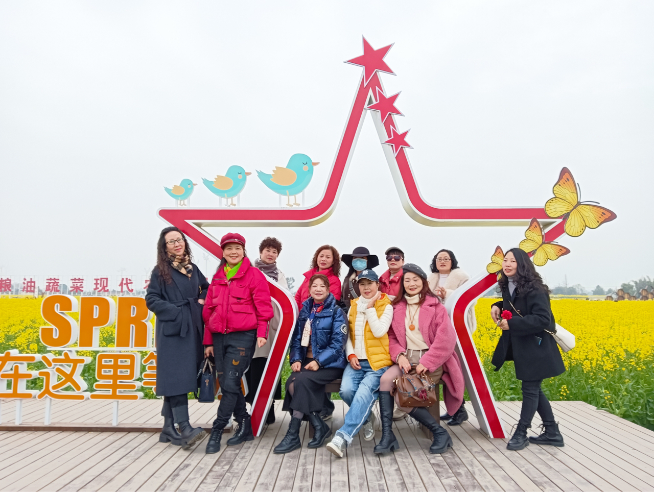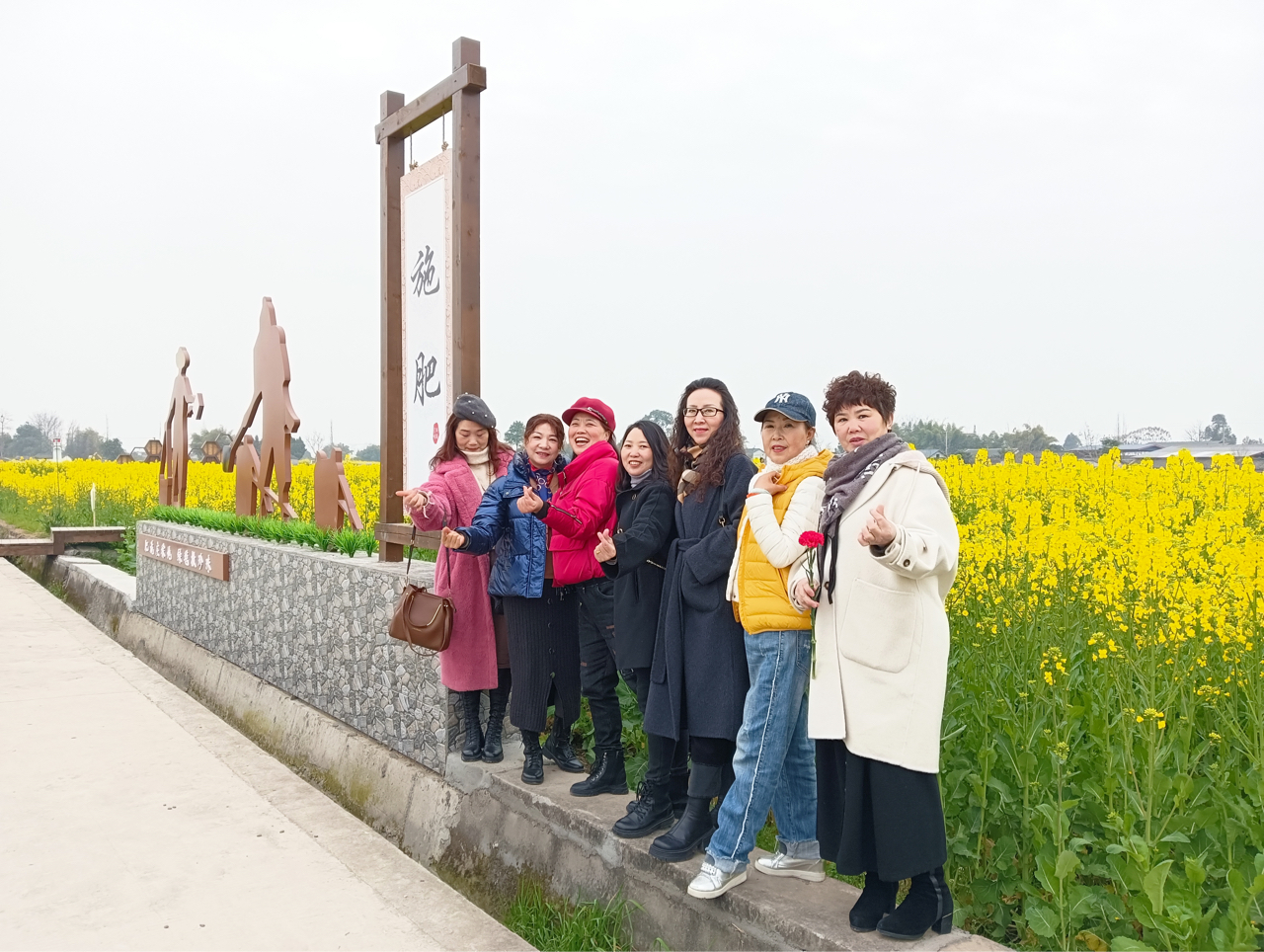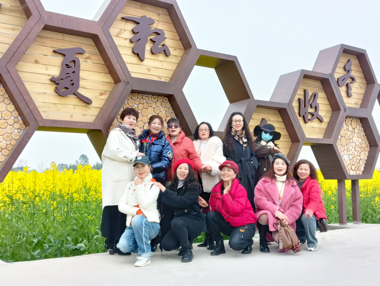 什地镇油菜花海,蜂巢与五角星间,中老年姐妹笑靥如春,木坊静立,红花缀绿,晴光潋滟,尽是田园诗。