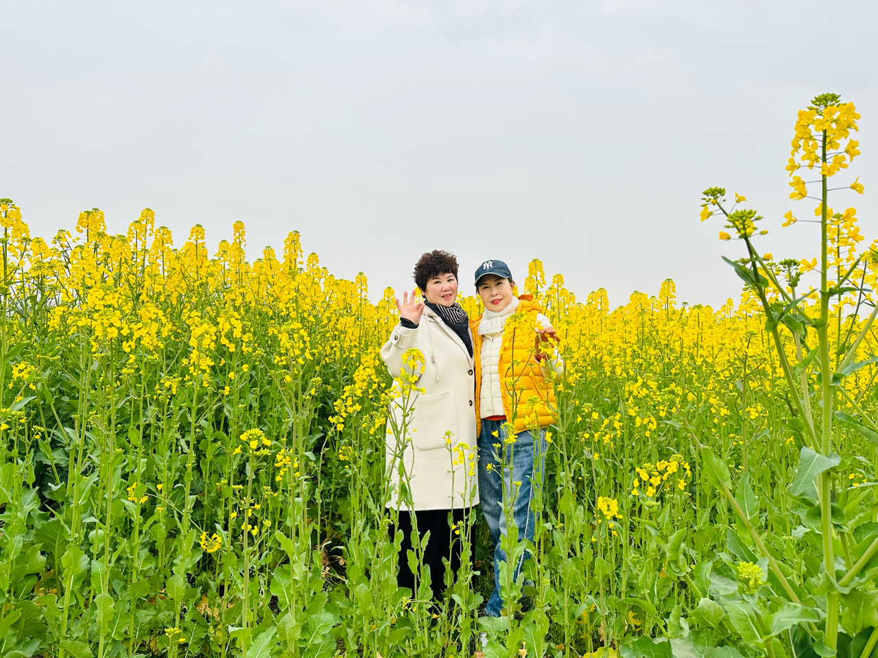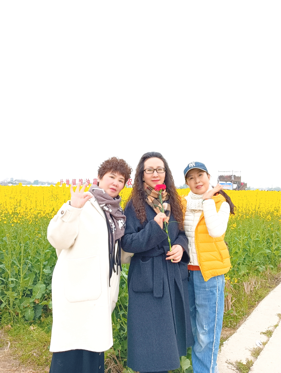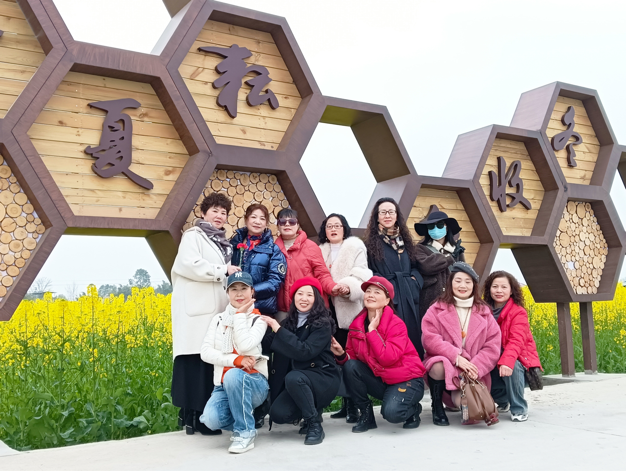 什地镇油菜花海,蜂巢与五角星间,中老年姐妹笑靥如春,木坊静立,红花缀绿,晴光潋滟,尽是田园诗。