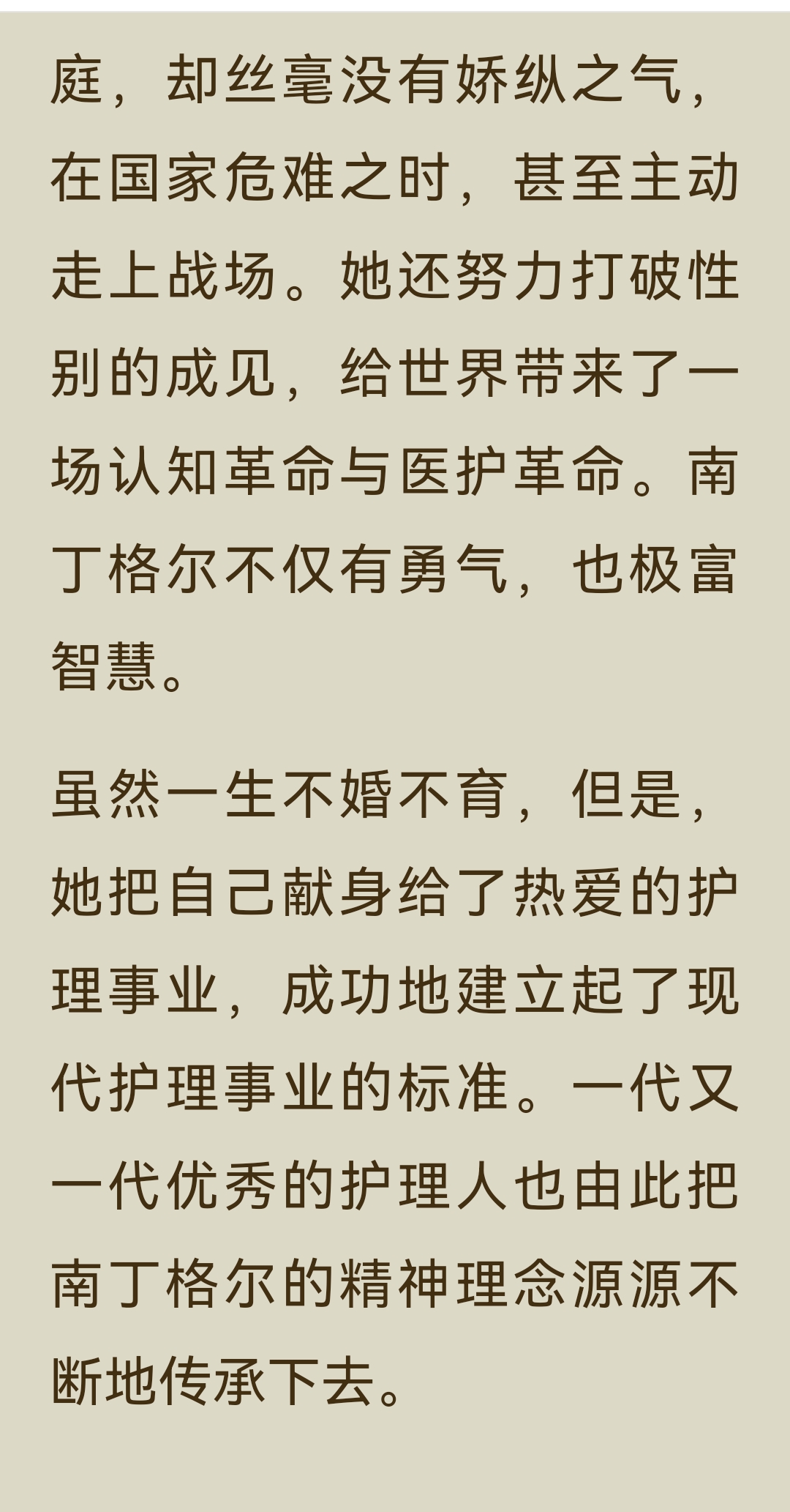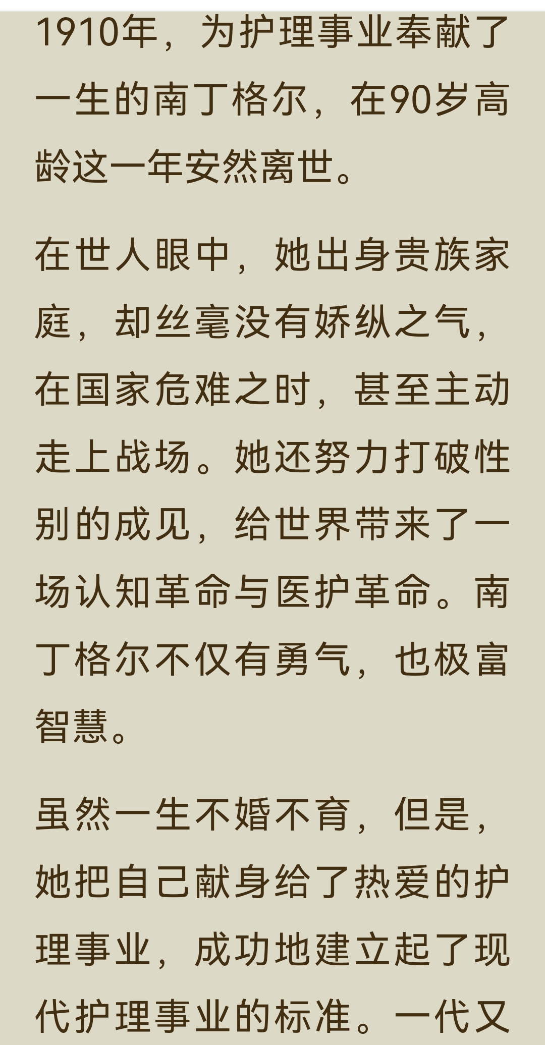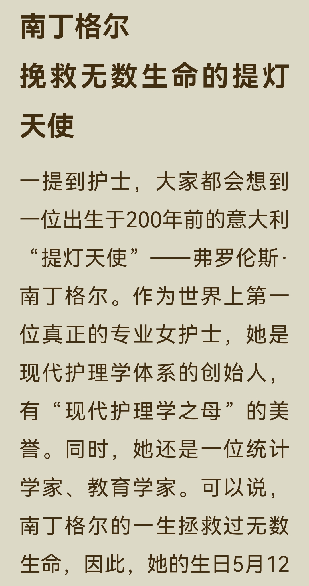 《了不起的女子》“能力篇”之南丁格尔:主要内容与阅读体会: 一、主要内容 南丁格尔的一生,是一场用专业与勇气打破偏见、重塑行业的伟大征程。 1. 出身与觉醒 1820年,她生于意大利佛罗伦萨的英国贵族家庭,自幼接受良好教育,精通多国语言。17岁时,她感受到“上帝的召唤”,渴望投身护理事业,这与当时贵族女性的“贤妻良母”角色期待产生了激烈冲突。面对家人的反对和恋人的挽留,她坚定地选择了自己的道路,拒绝婚姻,立志成为一名“漂泊者”。 2. 战场的变革 1853年克里米亚战争爆发,英军战地医院条件恶劣,士兵死亡率高达42%。南丁格尔主动请缨,带领38名志愿者奔赴前线。她不仅改善了医院的卫生条件、制定管理制度、亲自护理伤员,更用数据说话,将死亡率数据制成“南丁格尔玫瑰图”,成功说服国会增加投入。最终,战地医院的死亡率从42%骤降至2%,她也因此被称为“提灯天使”。 3. 行业的奠基 战争结束后,她并未止步于英雄光环。1860年,她在伦敦圣多马斯医院创建了世界上第一所正规护士训练学校,确立了现代护理的专业标准与“南丁格尔誓言”。她还凭借卓越的统计才能,成为英国皇家统计学会首位女性成员,推动了数据可视化的发展。 4. 精神的传承 1910年,90岁的南丁格尔离世。她终身未婚,将一生奉献给了护理事业,彻底改变了世人对护理工作的认知,让护士成为受人尊敬的专业职业,其精神理念至今仍在传承。 二、阅读体会 南丁格尔的故事,最令人震撼的,是她身上那种超越时代的专业精神与人格力量。 - 清醒的自我认知:她从一开始就清楚地知道自己想要什么,不被出身、性别或世俗的期待所定义。在那个女性被禁锢在家庭中的时代,她勇敢地宣称“如果婚姻会限制我的自由,那我将永不结婚”,这种对自我价值的坚守,本身就是一种革命。 - 强大的专业能力:她不仅有爱心,更有解决问题的硬核能力。她用科学的管理和精准的数据,将一个混乱不堪的战地医院变成了高效的生命救治系统,证明了专业主义的力量。 - 深远的格局:她的目光从未局限于个人的成就,而是着眼于整个行业乃至社会的进步。她建立护士学校,是为了让护理成为一门受人尊重的专业;她用数据推动改革,是为了让更多生命得到拯救。她的格局,早已超越了个人的悲欢。 她用一生证明,真正的“了不起”,不在于出身多么显赫,而在于你是否有勇气去定义自己的人生,并用专业和智慧,为这个世界带来真正的改变。