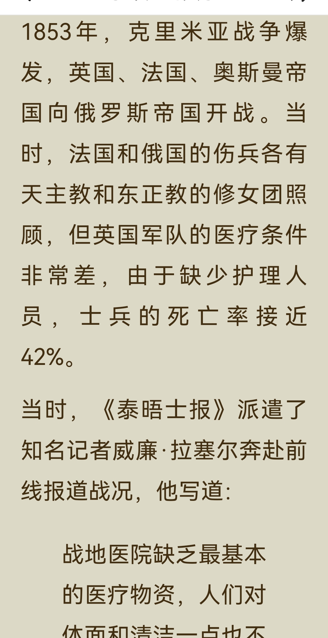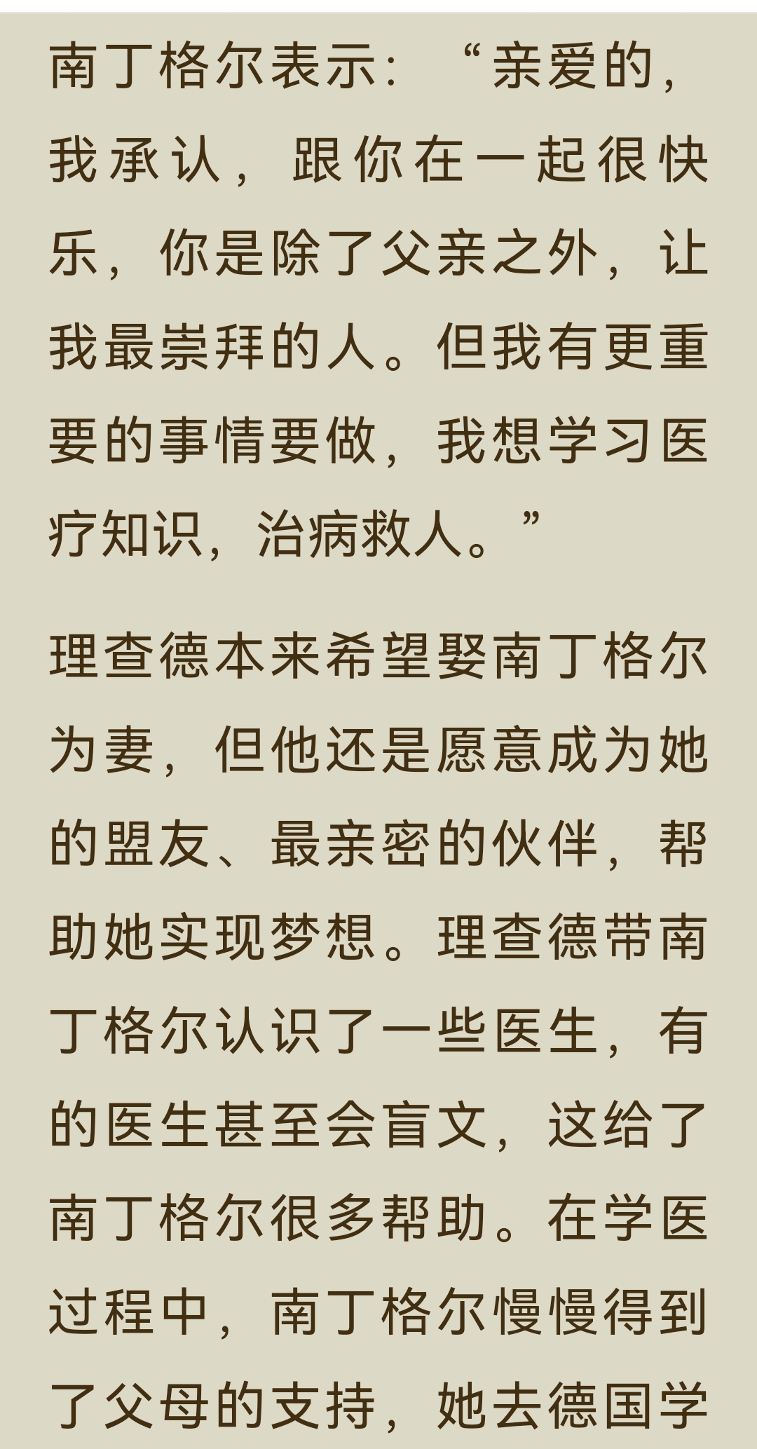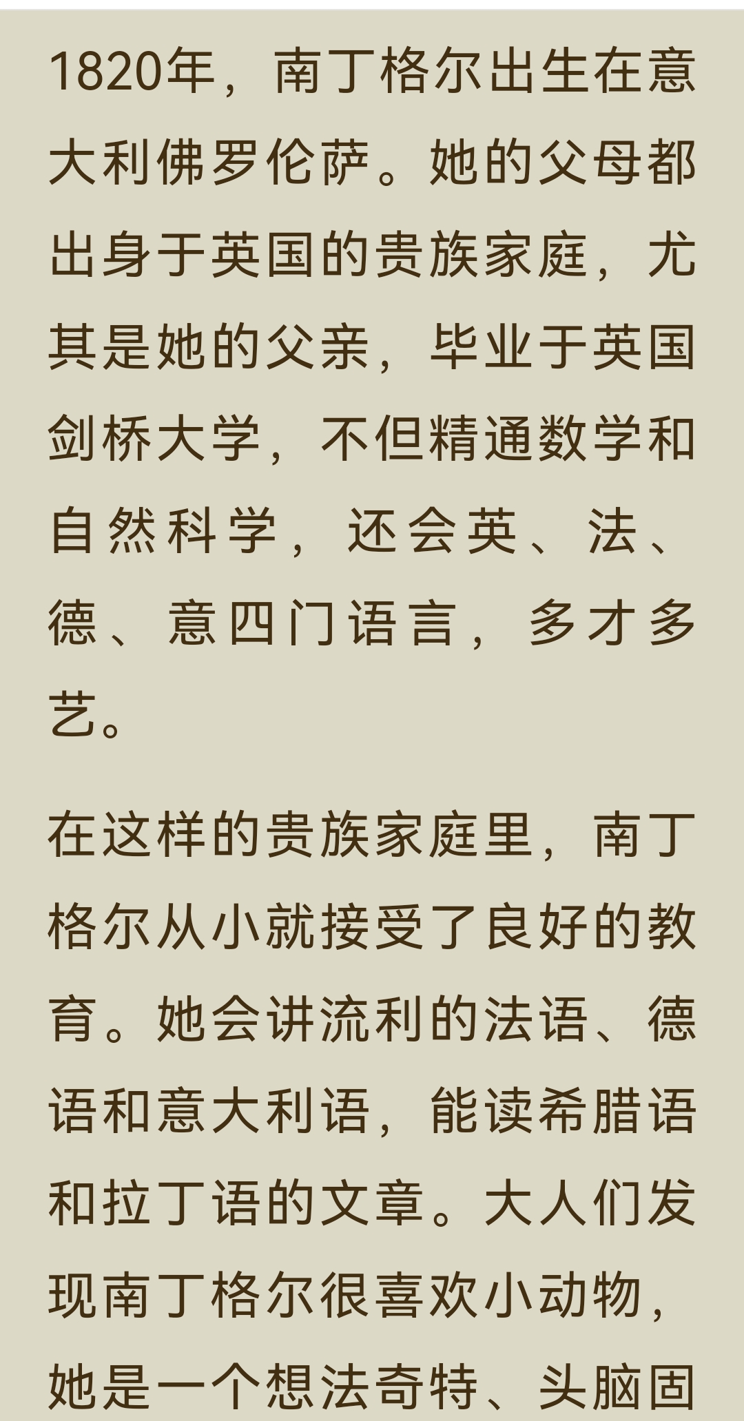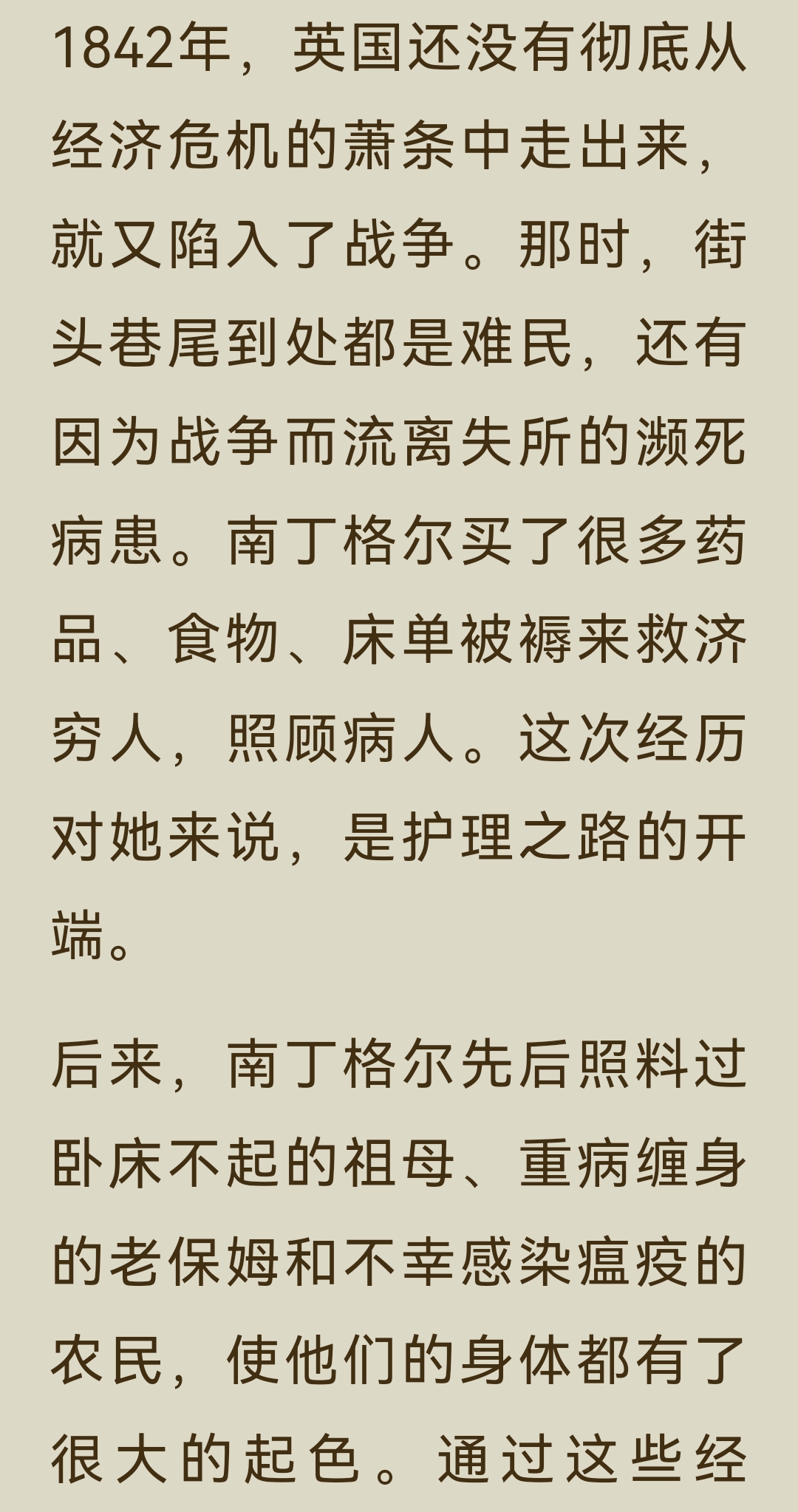 《了不起的女子》“能力篇”之南丁格尔:主要内容与阅读体会: 一、主要内容 南丁格尔的一生,是一场用专业与勇气打破偏见、重塑行业的伟大征程。 1. 出身与觉醒 1820年,她生于意大利佛罗伦萨的英国贵族家庭,自幼接受良好教育,精通多国语言。17岁时,她感受到“上帝的召唤”,渴望投身护理事业,这与当时贵族女性的“贤妻良母”角色期待产生了激烈冲突。面对家人的反对和恋人的挽留,她坚定地选择了自己的道路,拒绝婚姻,立志成为一名“漂泊者”。 2. 战场的变革 1853年克里米亚战争爆发,英军战地医院条件恶劣,士兵死亡率高达42%。南丁格尔主动请缨,带领38名志愿者奔赴前线。她不仅改善了医院的卫生条件、制定管理制度、亲自护理伤员,更用数据说话,将死亡率数据制成“南丁格尔玫瑰图”,成功说服国会增加投入。最终,战地医院的死亡率从42%骤降至2%,她也因此被称为“提灯天使”。 3. 行业的奠基 战争结束后,她并未止步于英雄光环。1860年,她在伦敦圣多马斯医院创建了世界上第一所正规护士训练学校,确立了现代护理的专业标准与“南丁格尔誓言”。她还凭借卓越的统计才能,成为英国皇家统计学会首位女性成员,推动了数据可视化的发展。 4. 精神的传承 1910年,90岁的南丁格尔离世。她终身未婚,将一生奉献给了护理事业,彻底改变了世人对护理工作的认知,让护士成为受人尊敬的专业职业,其精神理念至今仍在传承。 二、阅读体会 南丁格尔的故事,最令人震撼的,是她身上那种超越时代的专业精神与人格力量。 - 清醒的自我认知:她从一开始就清楚地知道自己想要什么,不被出身、性别或世俗的期待所定义。在那个女性被禁锢在家庭中的时代,她勇敢地宣称“如果婚姻会限制我的自由,那我将永不结婚”,这种对自我价值的坚守,本身就是一种革命。 - 强大的专业能力:她不仅有爱心,更有解决问题的硬核能力。她用科学的管理和精准的数据,将一个混乱不堪的战地医院变成了高效的生命救治系统,证明了专业主义的力量。 - 深远的格局:她的目光从未局限于个人的成就,而是着眼于整个行业乃至社会的进步。她建立护士学校,是为了让护理成为一门受人尊重的专业;她用数据推动改革,是为了让更多生命得到拯救。她的格局,早已超越了个人的悲欢。 她用一生证明,真正的“了不起”,不在于出身多么显赫,而在于你是否有勇气去定义自己的人生,并用专业和智慧,为这个世界带来真正的改变。