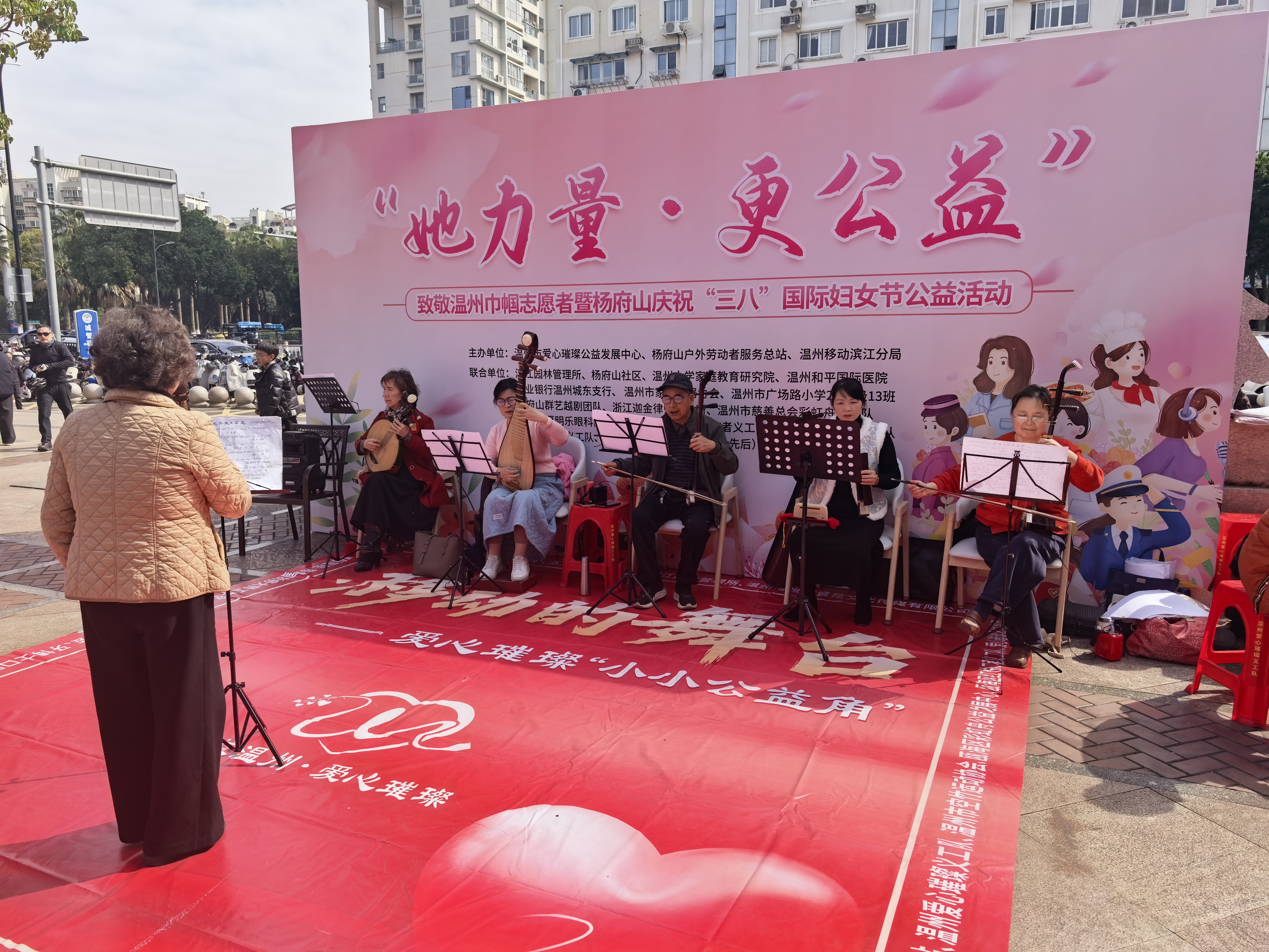“她力量·更公益”致敬温州巾帼志愿者暨杨府山庆祝“三八”国际妇女节公益活动 为致敬温州巾帼志愿者与女性职工的奉献精神,传递社会关爱,营造浓厚的节日氛围。2026年3月8日下午,由温州市爱心璀璨公益发展中心、杨府山户外劳动者服务总站、温州移动滨江分局主办,多家单位联合承办的“她力量·更公益”致敬温州巾帼志愿者暨杨府山庆祝“三八”国际妇女节公益活动在杨府山公园南门户外劳动者服务总站前温馨举行。 活动现场,公益市集热闹开市,设有义诊、义剪、缝补铺、以物易物、法律咨询、颈椎调理等多个便民服务摊位,吸引了众多居民和户外劳动者前来参与,来自各个单位的志愿者们热情服务,传递温暖与关怀。与此同时,杨府山群艺越剧团队为现场的居民带来了一场精彩的民乐演奏会,悠扬的越剧唱腔和传统民乐交织,展现了中华传统文化的魅力,也为节日增添了浓厚的艺术氛围。 本次活动弘扬了志愿服务精神,凝聚了城市温暖力量,是对女性志愿者和职工辛勤付出的礼赞,也是社会各界共同推动公益事业发展的一次生动实践。