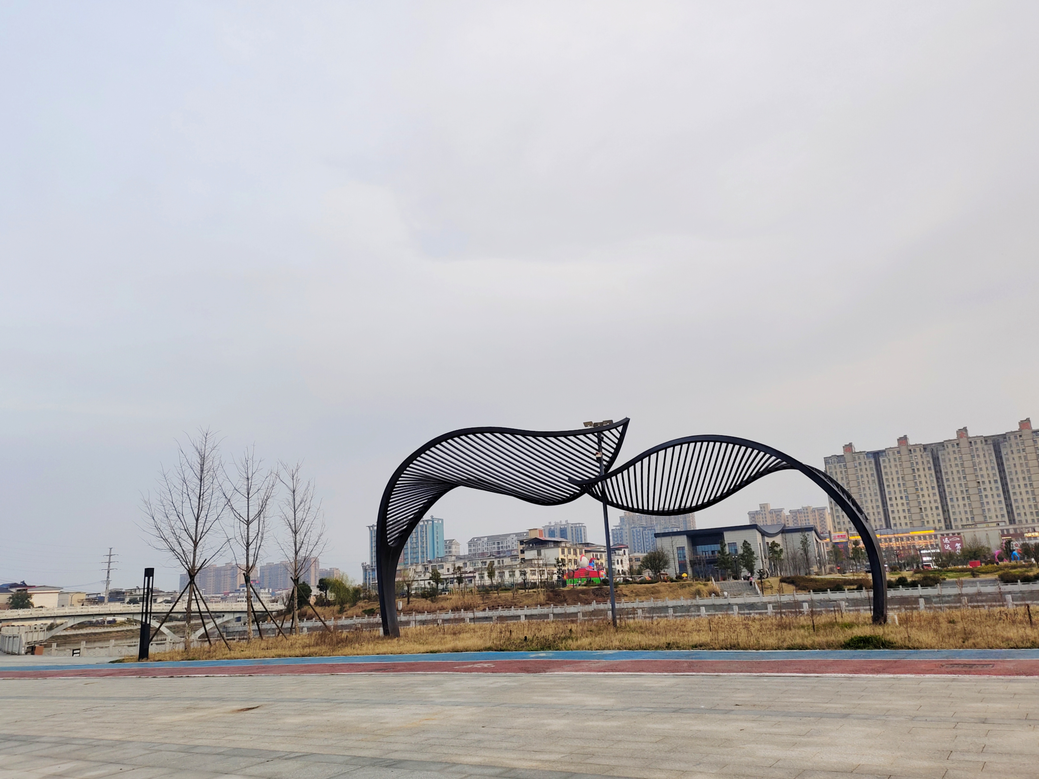 钢结构雕塑弯出诗意,枯树步道间,城市天际线悄悄入镜。