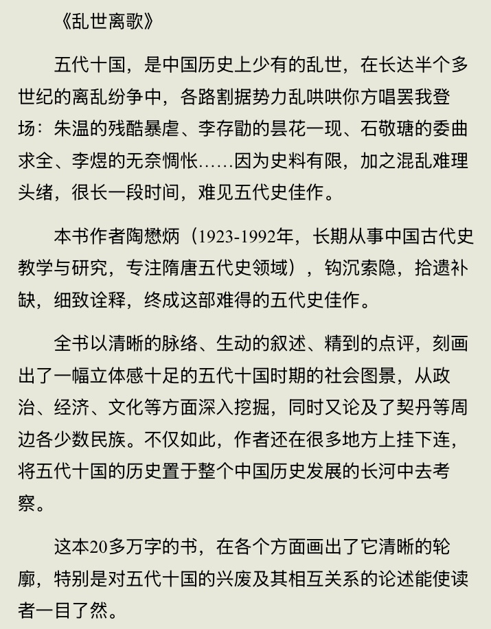 陶懋炳先生的《乱世离歌:五代史略》是潮新闻春风月榜2026年2月推荐的好书之一,其被誉为该领域的“开山之作”。恰逢2026年1月贵州人民出版社推出新版,下面我想结合成书背景、内容特色及学界反馈,为大家带来这部经典的全景式解读。 奠基之作:从尘封经典到再版归来 · 作者与成书背景:陶懋炳(1923-1992)师从熊德基、白寿彝等大家,是湖南师范大学著名史学家。面对五代史料零散、研究匮乏的困境,他“钩沉索隐,拾遗补缺”,写就了这部填补空白的新中国五代史研究奠基之作,最早于1985年问世。 · 再版意义:2026年新版由贵州人民出版社推出,让这部尘封经典重归大众视野。全书512页,约34万字,精装帧设计也满足了当下读者的收藏需求。 深度鉴赏:何以成为“压舱石”? 这部作品的核心魅力,在于它构建了理解乱世的宏大框架与深刻洞见。 · 宏观视野下的“通史意义”:作者突破单一王朝视角,将五代十国置于整个中国历史长河中考察。形式上虽是断代史,实则具有通史的眼光,清晰论证了此阶段上承隋唐、下启两宋的关键转型意义。 · 叙事艺术:乱花不迷眼:将繁杂的史料梳理得脉络分明,叙事深入浅出,既有严谨考证,又有生动刻画,配以精到的点评,打破了传统史学的枯燥感。例如书中对朱温、李煜等人物的速写极具张力。 · 结构匠心:全方位的立体图景: · 打破中原中心论:不仅详述中原五代更迭,还系统论述南方十国(吴越、南唐等)的发展,以及契丹等周边民族,完整呈现多元政治格局。 · 超越政治史:内容广涉经济、文化、社会结构。特别关注了南方经济的恢复、海上丝绸之路的萌芽等,论证了分裂中孕育的统一因素。 理性评价:经典的价值与时代印记 · 学界与读者口碑:豆瓣评分高达 8.8,被誉为五代史领域的“敲门砖”和“压舱石”。中国社科院熊德基先生称赞其“深入浅出”、“实事求是”,不为新奇可怪之论。 · 不可替代的价值:最大的贡献在于填补空白,为后续研究构建了系统的框架。将混乱的历史线索梳理得条理分明,为无数读者打开了了解这段历史的大门。 · 小疵与时代局限:部分当代读者认为,书中对后周世宗柴荣褒奖过高,对宋太祖赵匡胤的评价则略显严苛,带有特定时代的价值判断痕迹。个别史料引用也存在细微疏漏。 总而言之,《乱世离歌:五代史略》是一部 “大家小书” 的典范。它既是一把开启纷繁乱世的入门钥匙,也是一部经得起反复研读的学术经典。 大家是否对书中关于南方十国或契丹崛起的具体论述感兴趣?我们可以就某个篇章展开更细致的探讨哦~