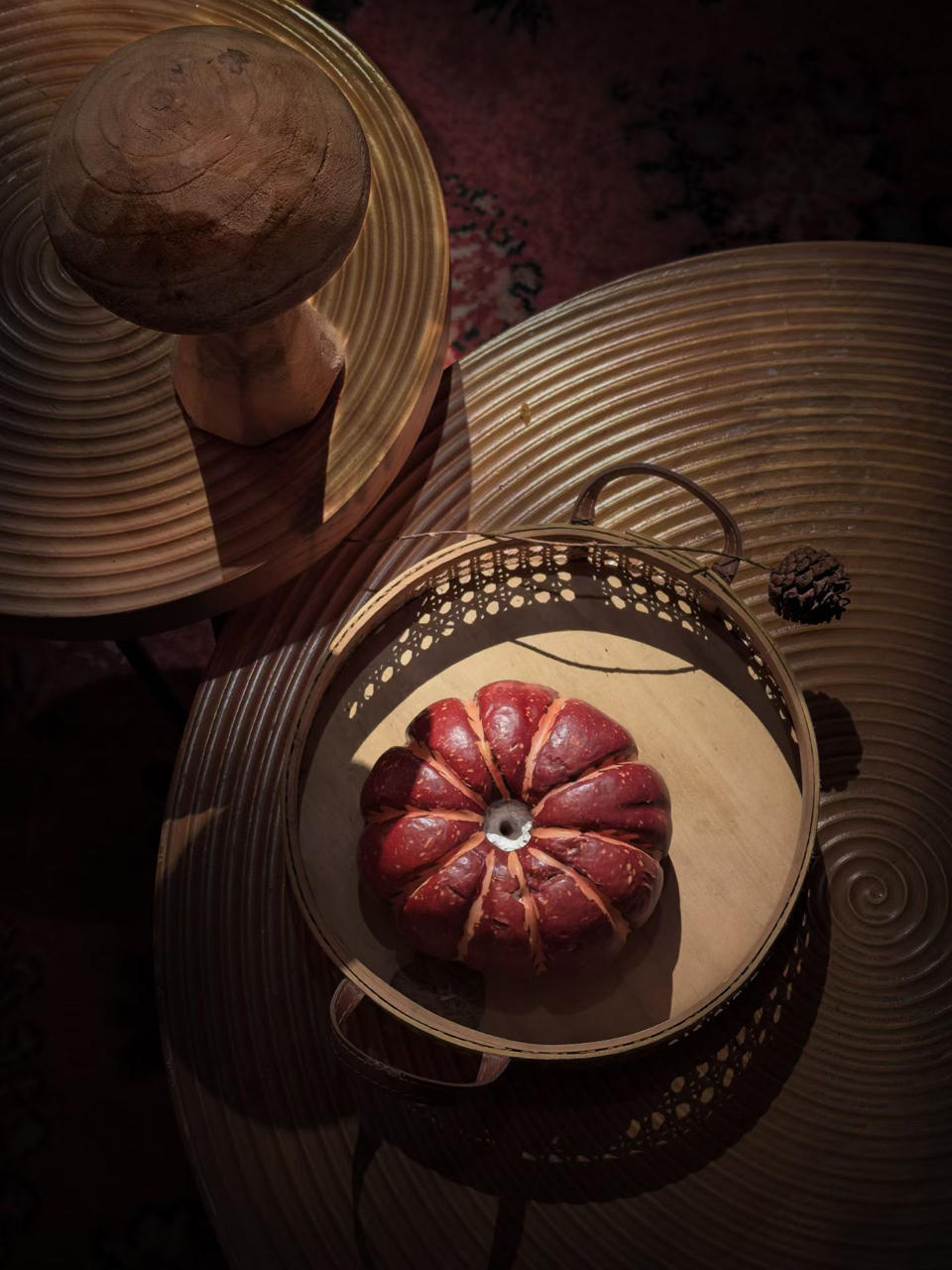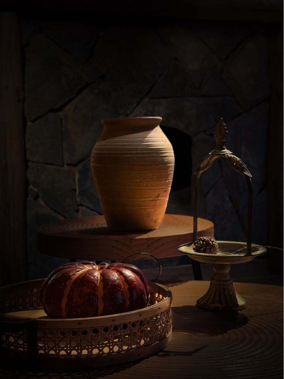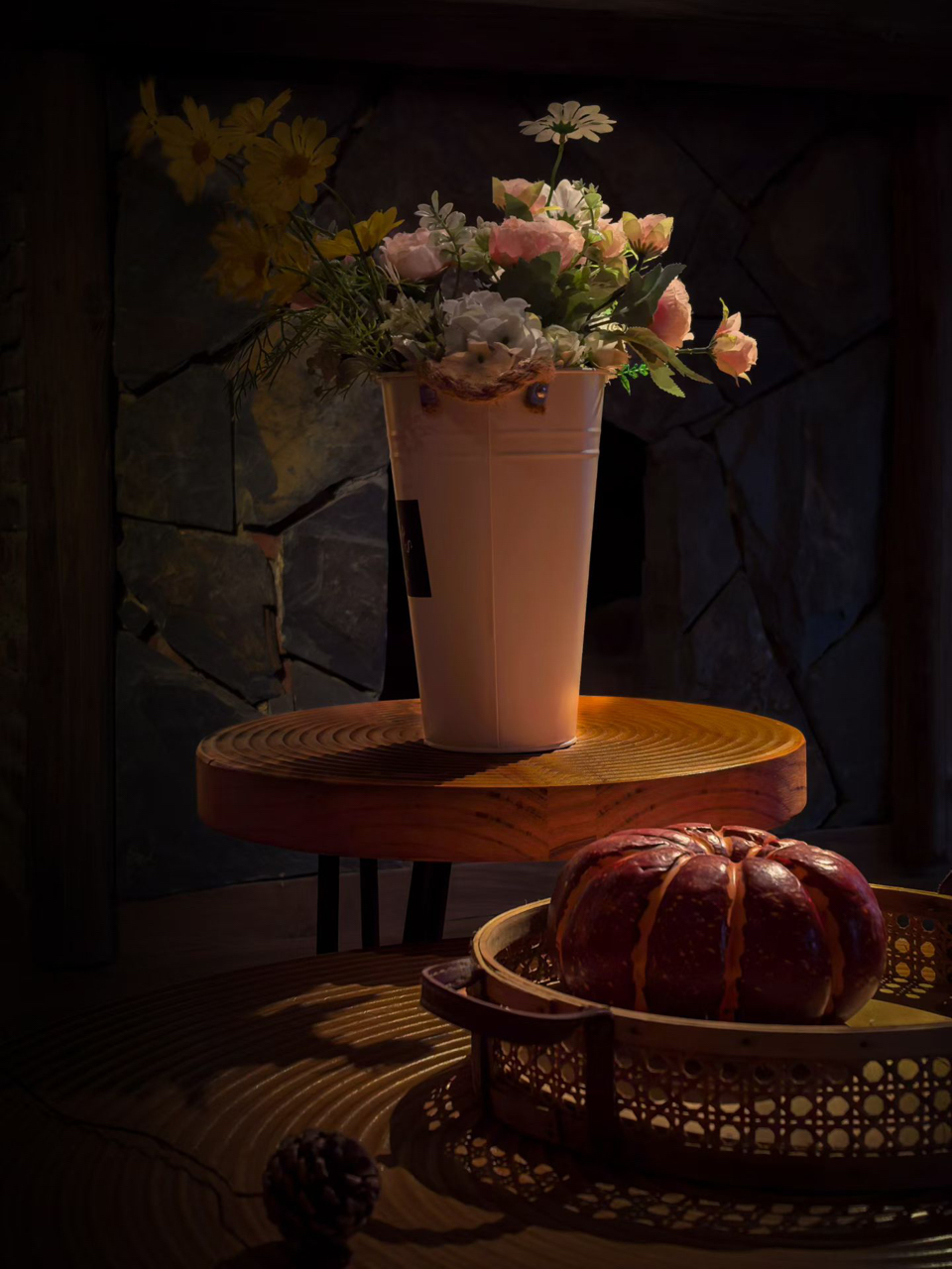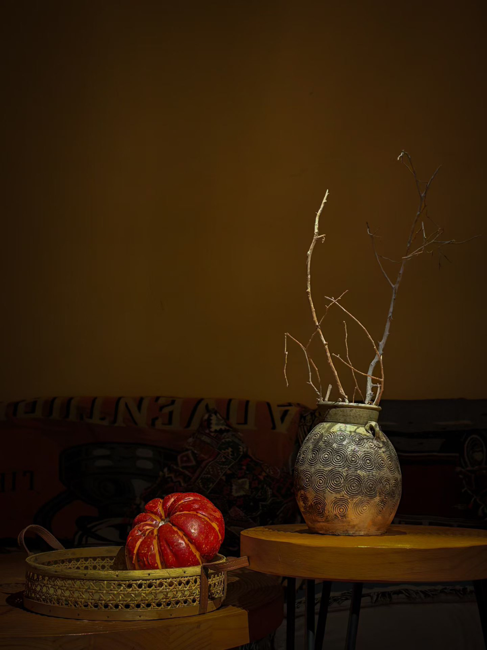 秋光漫溢,南瓜静卧陶罐旁,干枝斜倚编织篮,暖光轻抚每寸纹理,时光在此刻低语。