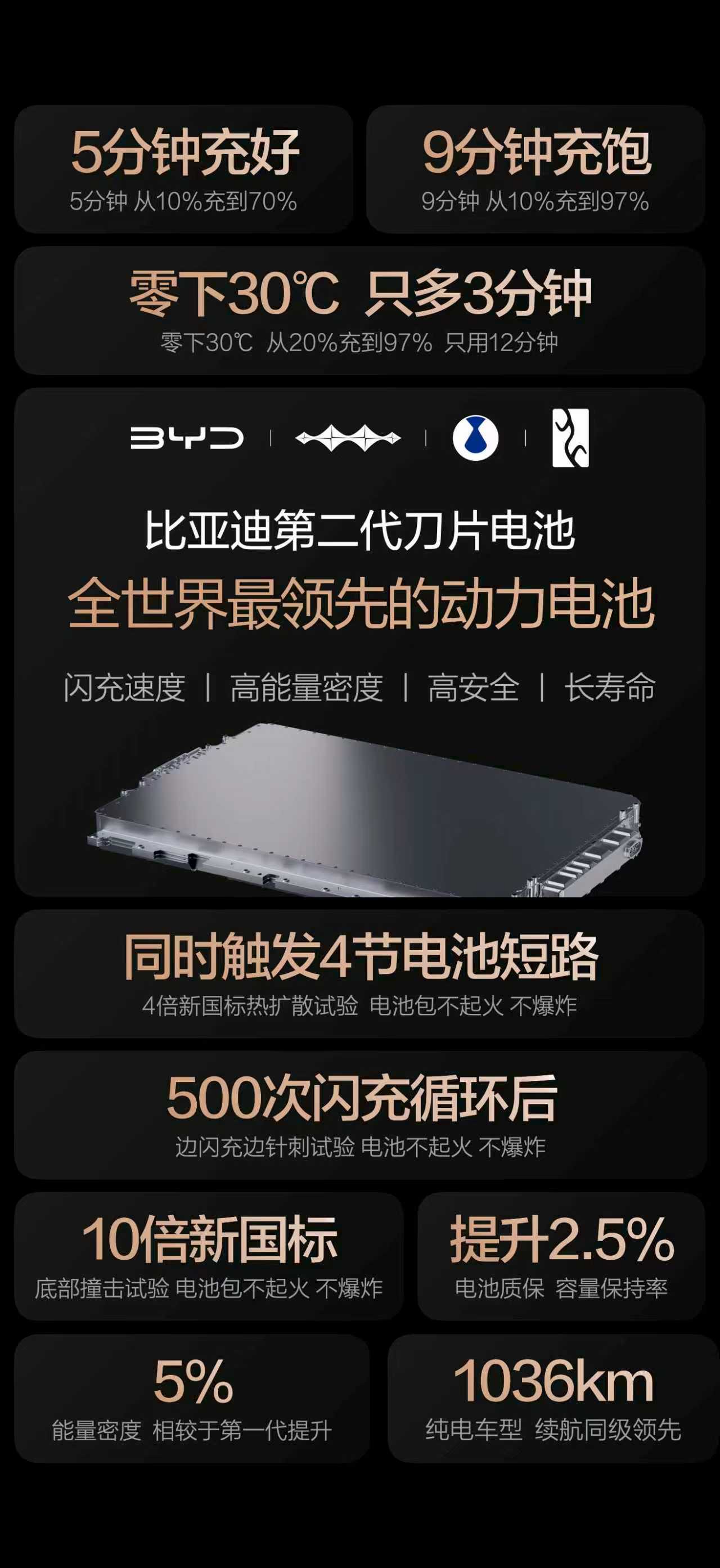 比亚迪第二代刀片电池“闪充与长寿命兼得”!比亚迪近期举办了第二代刀片电池及闪充技术发布会,不少关注新能源和电池技术的朋友都在讨论。硬核闪充技术树立行业新标杆,这次比亚迪推出的第二代刀片电池,看得出来是延续了自身在电池领域的扎实积淀。作为从电池起家的企业,比亚迪一直把安全和长寿命放在核心位置,着力解决用户使用中的实际顾虑。大家普遍关心的闪充伤电池问题,通过“锂离子高速通道”和全温域智能热管理系统,实现闪充少产热、快散热,对电池寿命几乎无影响。该电池通过了远超新国标的安全试验,500次闪充循环后依旧保持安全稳定。质保政策也进一步加码,电芯终身保修,容量低于77.5%可免费包换。目前,全新腾势Z9GT、大唐、海豹07EV等多品牌车型已搭载该电池,让更多用户享受到安全耐用的闪充体验。