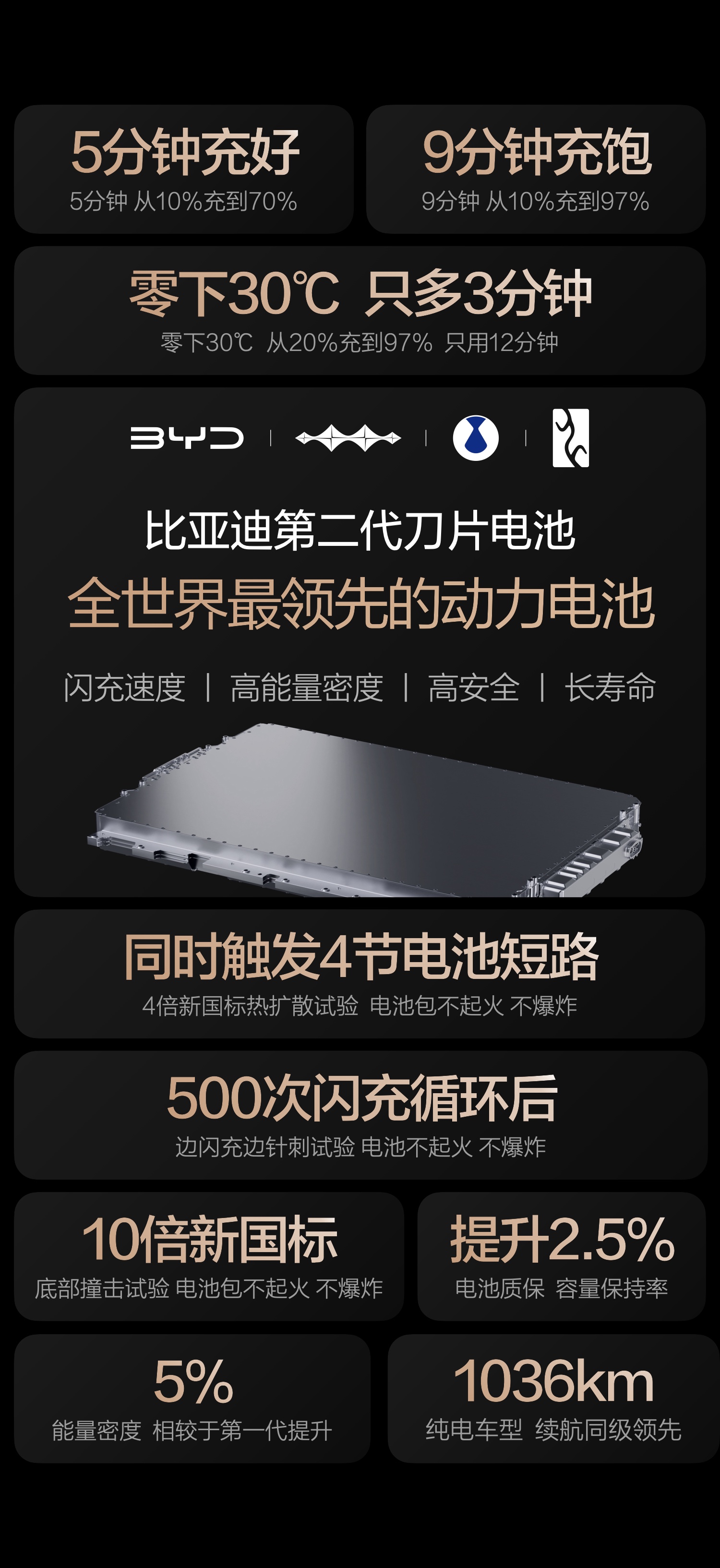 六年磨一“刀”,比亚迪第二代刀片电池如何让闪充与长寿命兼得? 3月的深圳,比亚迪交出了一份时隔六年的重磅答卷:第二代刀片电池。发布会后,朋友圈几乎被刷屏,但最让我印象深刻的,不是那些冰冷的参数,而是现场反复强调的一句话:“常温充电,5分钟充好,9分钟充饱”,硬核闪充技术树立行业新标杆! 坦白讲,听到这话的第一反应不是兴奋,而是疑惑:“充这么快,电池受得了吗?用两年是不是就得换了?”这恐怕是所有人面对“闪充”时最朴素、也最尖锐的疑问。毕竟闪充与寿命,曾经是一对天敌。 但比亚迪这次显然是有备而来。他们把解决方案拆解为两步:一是让闪充尽量少产热,二是让热量更快散出去。通过打造“锂离子高速通道”和“全温域智能热管理系统”,第二代刀片电池在提升充电速度的同时,几乎把对寿命的影响降到了忽略不计的程度。 发布会现场公布的一组数据很有意思:500次闪充循环后,边闪充边进行针刺试验,电池没有热失控,没有冒烟起火。500次闪充循环是什么概念?按照官方测算,大约相当于30万公里的行驶里程。对普通私家车而言,这已经是15年的用车周期。换句话说:在你可能换掉这辆车之前,这块电池依然安全、依然耐用。 这种底气,最终化为了实实在在的质保承诺。比亚迪宣布,第二代刀片电池的质保政策再加码:容量保持率整体提升2.5%,电池容量低于77.5%即可免费包换,电芯依旧是终身保修。比亚迪直接用售后政策给用户喂了一颗定心丸。 除了寿命,安全依然是这场发布会的底色。在安全测试环节,比亚迪展现了一种近乎“炫技”的自信。从第一代刀片电池用针刺测试捅穿安全神话,再到如今用第二代刀片电池攻克“闪充与寿命”的矛盾,这个企业最懂电池的软肋在哪,也最知道如何给电池穿上盔甲。 六年磨一“刀”。这一次,比亚迪想传递的信息很明确:成年人不做选择,闪充的效率和长久的安心,我们全都要。