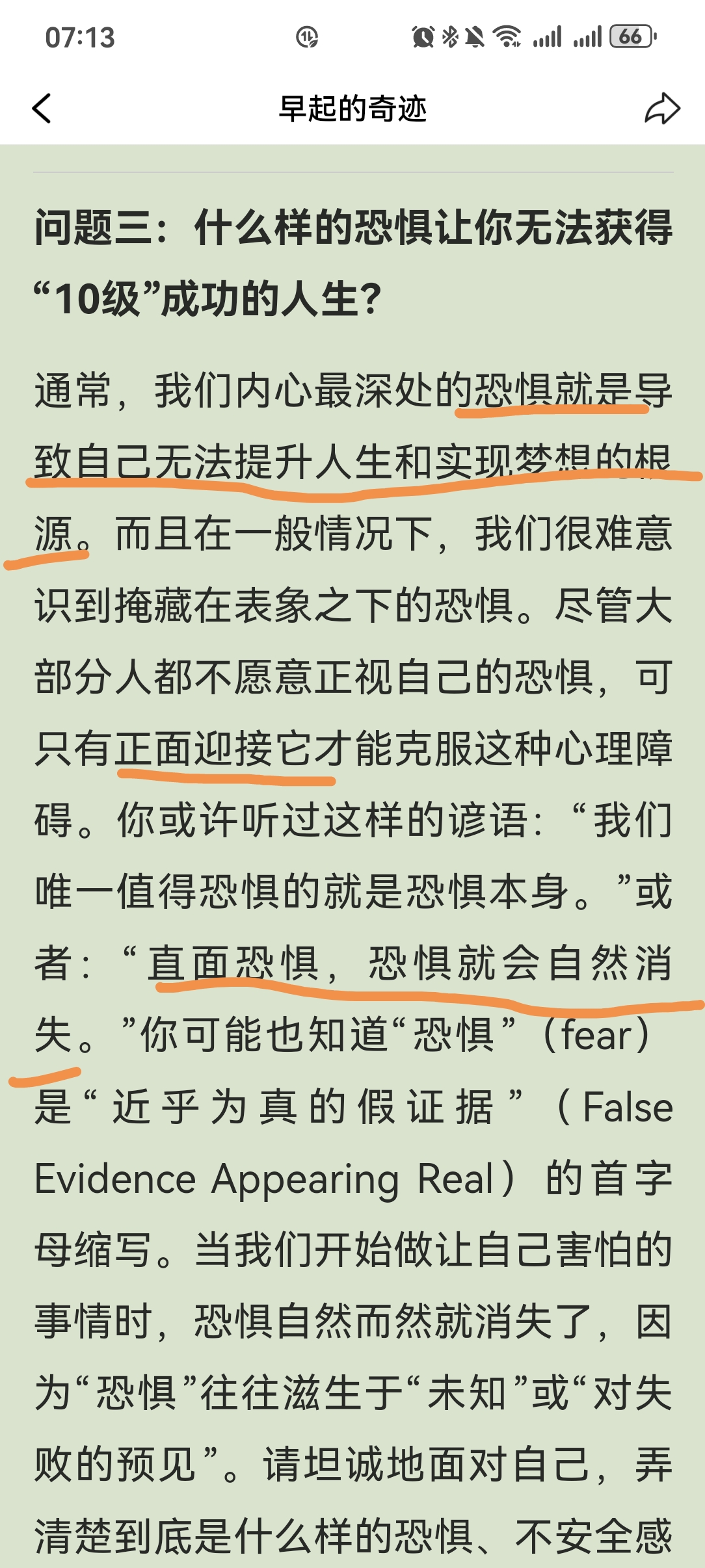 今日阅读:早起的奇迹。 追求自己想要的人生,就要直面恐惧。只有面对恐惧,才能把恐惧消失。 我想要让自己的身体健康,也想让自己能赚钱养活自己,想过自己想要的生活方式。 这几天通过阅读《早起的习惯》这本书,并对自己的行为进行了改变。 每天坚持快速走路一会儿,调整呼吸,走路也不像以前那么累了。 每天坚持阅读,提升自己的记忆力和写作能力。 希望今年能够不一样。