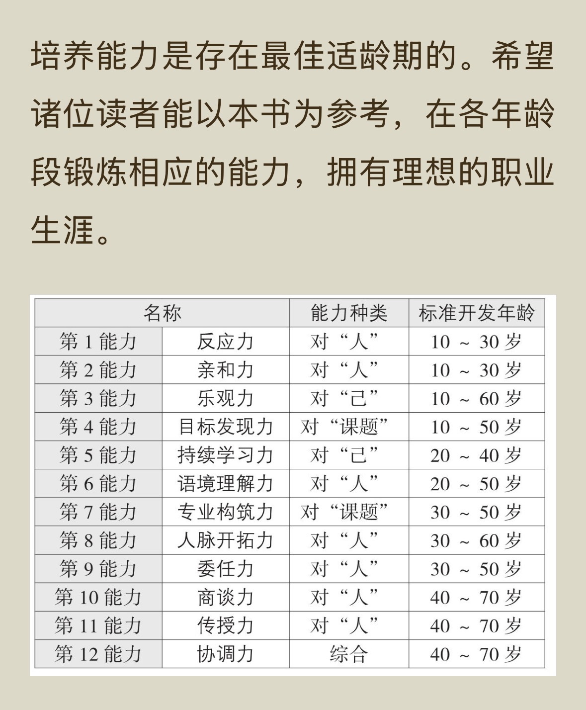 Day2 读《12个工作的基本》摘记 5.持续学习力。知识工作者是指能够独立自主定义自己该做的事,并为此学习必要知识的人才。作者认为人们不学习的原因是不懂得学习方法,缺少享受学习过程和收获的经验。尽量在大学时代掌握持续学习力。 养成学习习惯的关键:精力集中;确定近期目标;记住就立刻说出来;确定是否习惯化;灵活运用,收获成果。 6.语境理解力。依靠感情控制力,逻辑思考力,表达能力三股力量支撑。锻炼语境理解力关键要跟语境不同的人多交流。同时养成整理论点的习惯。 7.专业构筑力。选择专业领域的标准:一是尽量选择已经积累大量经验的领域。二是弄清楚在公司内部是否存在被估价的可能性,在社会上是否存在高需求。三是选择能在相对较短的时间内达到一定水平的领域。四是能想象出自己享受该领域工作的模样。 实践经验、系统理论、领域内的专家关系网,三点齐备的时候,这就是你的专业领域。 8.人脉开拓力。首先要见想见的人。对方是否拥有工作需要的信息,能不能成为工作伙伴,对于提高自己的品性和教养有无帮助。 二次接触,加深印象。 介绍给第三方是加深关系的有效技巧。 怀着无私付出的心态才是开拓人脉的关键。 锻炼自己的信息提供力,使自己成为宝贵的信息源。 不要吝啬自己掏腰包的交际费和饮食费。 停止加班,空出时间来与人交往。 9.委任力。工作中的人可以分为两种:一种是被人驱使的人;一种是驱使别人的人。一个人如果不能掌握委任力,就无法肩负重任。 “自己做更快”“叫你做是应该的,你做好也是应该的”阻碍了你的委任力锻炼。托付别人工作与自己完成工作相比,难度更大。你需要把自己了解的东西详细讲给对方听,直到对方明白,才能托付工作。而且必须把握对方的理解程度,中途依次检查工作进程。如果对方做得不到位,必须加以修改。同时尽量向托付方表示感谢和赞赏。这些都要求你必须具备更高的水平。 具备委任力的人要具备信赖别人的能力;要有符合要求的阶段化目标。 10.商谈力。理想的上司要能详细阐述工作意义,要能认可部下优点,要能耐心提供建议,帮助部下迅速进步。这是“职业顾问型”上司,也是管理者的理想形象。 11.传授力。提高传授力最重要的是要尽量跟受教方形成平等的伙伴关系。身为教员,不能把所有东西都主动说出来,关键是要向对方提问,让对方思考并给出答案。 12.协调力。更高级的能力。协调力是包括确保整体平衡发展的“调整力”、在人与人之间起联系作用的“中介力”、向成功方向引导的“推进力”这三种能力的综合能力。协调力是人类的终极能力。