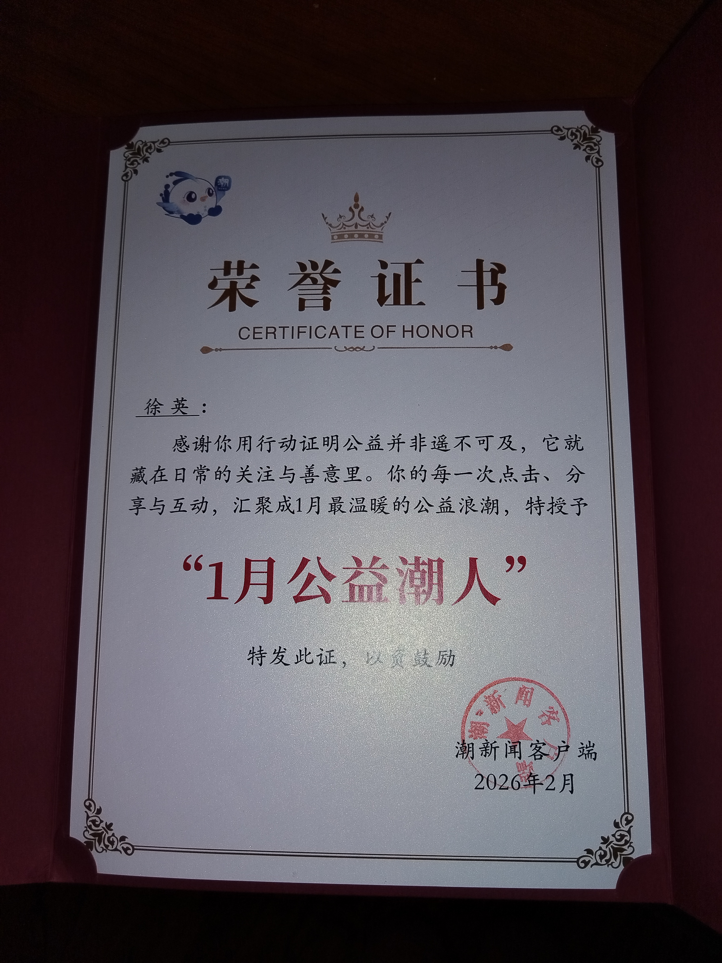 拿到1月“公益潮人”的荣誉证书啦!感谢潮新闻的鼓励和认可,也感恩公益路上各位潮人的支持。益起来公益,我们继续努力!