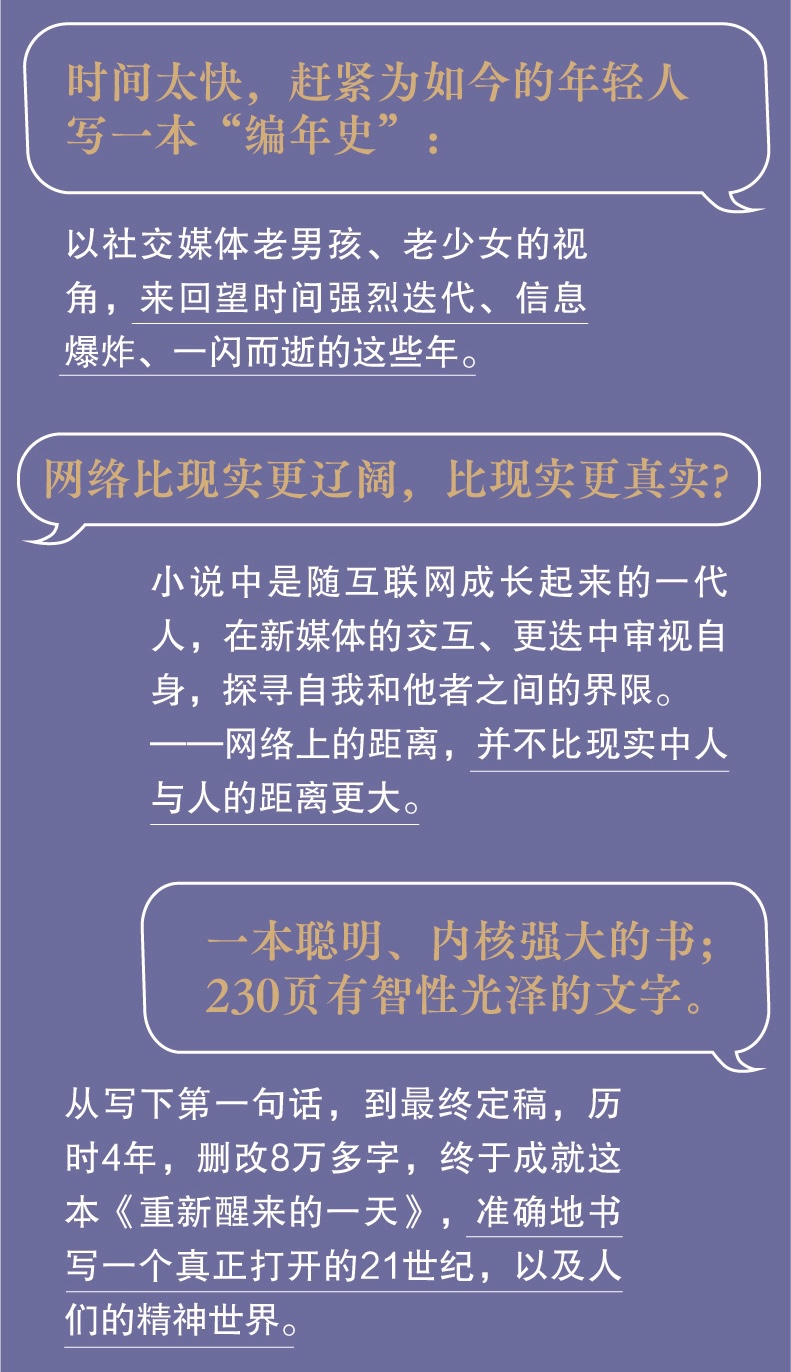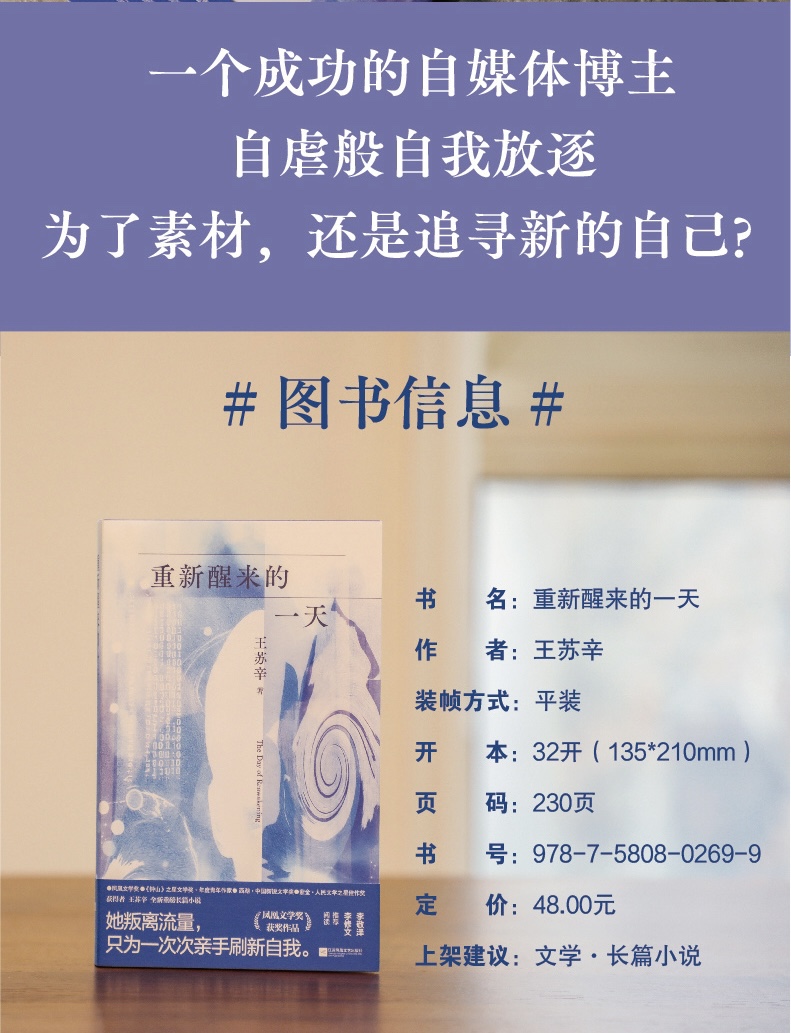王苏辛的长篇小说《重新醒来的一天》是潮新闻春风月榜2026年2月推荐的好书之一,其是一部为数字时代画像的作品。它于2026年2月由江苏凤凰文艺出版社正式出版,曾获第三届凤凰文学奖提名奖。这部小说以一位短视频博主的视角切入,深入探讨了在信息爆炸的当下,个体如何在虚拟与现实交织中寻找自我与完整叙事。 下面我想从内容概要、艺术特色、主题思想三个维度,为大家详细介绍并鉴赏这部作品。 一、故事与人物:在“流浪”中重塑自我 小说的主人公岳予同,是一位从小喜欢独处又渴望探索的女孩 。她成长于一个经营小型货运公司的家庭,父母的“在路上”状态让她很早就学会了观察世界的细节 。 · 成长的轨迹:故事跨越了岳予同从童年到35岁之后的人生。25岁后,她辗转于多座城市,从事自媒体工作、创业,结交各种背景的朋友 。她的人生充满了“流动感”,这一点鲜明地体现在她与网络的关系上——她不断注册新的网络账号,从一个平台“流浪”到另一个,每一次重新开始,都像重新面对一次记忆 。 · 核心设定:书名“重新醒来的一天”正是她在35岁后创立的新视频账号名。在这个阶段,她决定将每一个视频都视为自己的“最后一个作品”来创作,这种决绝的姿态背后,是对生命意义和创作价值的终极追问 。 · 父母的双线叙事:小说特别设置了父辈的线索。父亲王志华从事着近乎“镖师”般的工作,运送的不仅是货物,更是深入偏远山区的“消息”与信息;母亲岳凯乐则将这些经历写成日记,成为女儿日后创作的素材 。这两条线如同两条瀑布,最终在时空中交汇,构成了微观的当代“编年史” 。 二、艺术特色:为短视频时代构建的“元小说”形式 这部作品在形式上极具实验性和辨识度,被评论界称为“短视频时代的元小说” 。 · 独特的音乐性结构:小说的结构非常新颖,它不是传统的章节划分,而是借用了古典音乐和戏剧的术语,如 “慢板”、“快板”、“谐谑曲”、“歌队合唱” 等来组织文本。例如,小说分为“泥土松软”、“再见,观众”、“等待降临”三个部分,内部则穿插着“谐谑曲:阿K”、“快板:不断被世界退货的人”这样的单元 。这种结构模仿了多声部的交响乐,如同我们在刷短视频时感受到的碎片化与跳跃感,却在整体上形成一种回旋与复沓的音乐美。 · 碎片化的“镜廊”文本:小说家走走的评论指出,这部小说如同一面“可以走入的镜子”,由无数碎片整合而成。文本内部是一条条曲折回环的“镜廊”,每个镜廊里陈列的不是传统画像,而是一条条风格迥异的短视频。这种拼贴与折叠的叙事方式,精准地模拟了我们被图像和信息包围的感官经验。 · 互联网语境的介入:小说在正文前设置了 “名词解释” ,例如对“音画不同步”这一词条的解释是:“故乡从来就没有清晰过。人说不识故乡,只是不识自己” 。这种类似“弹幕”或朋友圈辞典的写法,将互联网时代的语言习惯直接植入文学文本,构成了对现实的元叙事反思。 三、主题与评价:深度勘探数字时代的生存 这部小说不仅仅是一个人的成长史,更是一次对当下集体精神状况的深度勘探。 · “出走”与“回归”的现代变奏:小说聚焦 “出走” 二字。岳予同一次次从故乡潜城出发去往远方,又一次次回归积蓄力量。但这种出走不再是地理上的冒险,而是在虚拟与现实、自我与他者之间的穿梭。她在互联网上构建身份,也在现实生活中探索人与人的边界。 · 代际传递与精神同盟:小说深刻探讨了代际关系。岳予同和父母虽然常年分离,却通过网络主页和视频默默观察彼此。父母那一代对偏远地区的“信息传递”,与女儿这一代作为“信息创作者”的短视频工作,形成了奇妙的呼应,共同构成了一种跨越时代的、对连接与意义的追寻。 · 为一代人立传的野心:评论者普遍认为,王苏辛完成了一个凶险而艰难的任务——为尚未被时间封闭的当下时代画像。她捕捉了90后一代如何在物质与精神资源过剩的环境中,塑造内心的棱角与骨骼。小说中的人物通过创作短视频收获流量,也收获对生活的理解,他们的生活交织成所有人共同的命运,时代便以这种方式流入了他们的眼中。 总的来说,《重新醒来的一天》是一部 “这很苏辛” 的作品——凌厉、敏锐,带着锐不可当的锋芒,同时又充满哲思与钝感。它用最当下的形式,包裹了最古老的主题:我们如何醒来,如何面对自己,如何在信息的洪流中,重新找到属于自己的那一天。