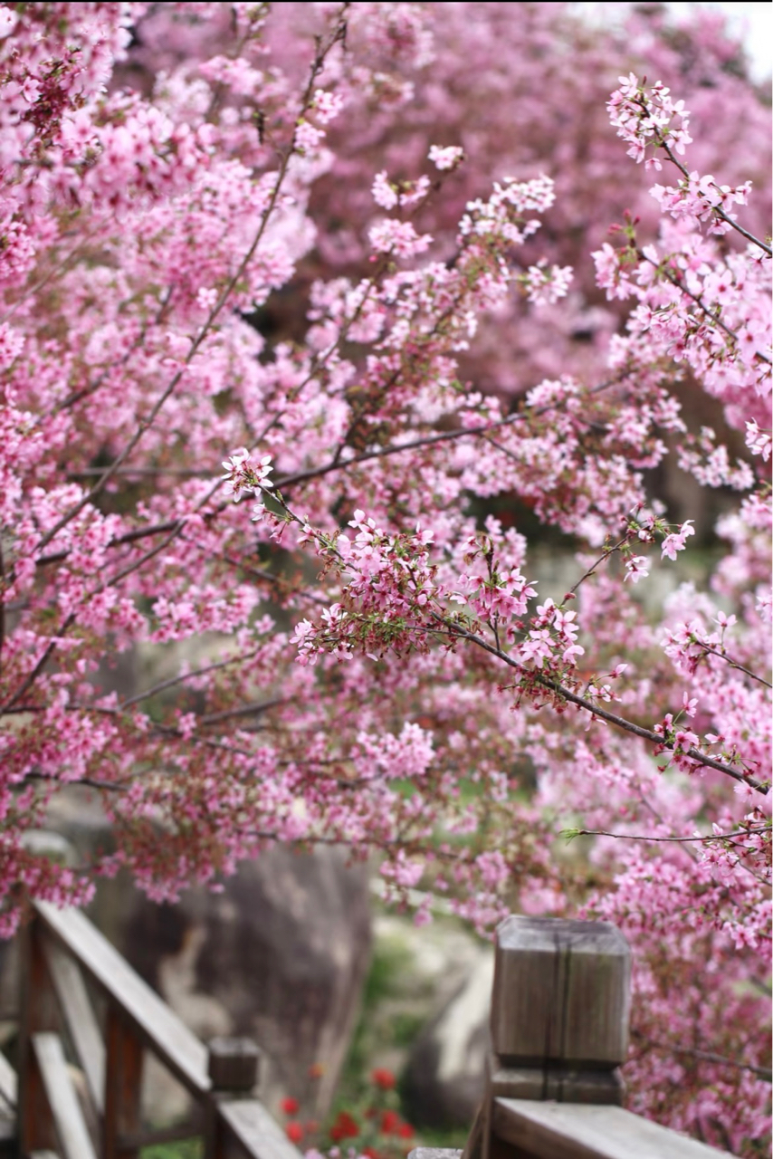 春樱初盛,粉瓣轻倚木栏,枝头蕊影朦胧,一园柔色入画来。