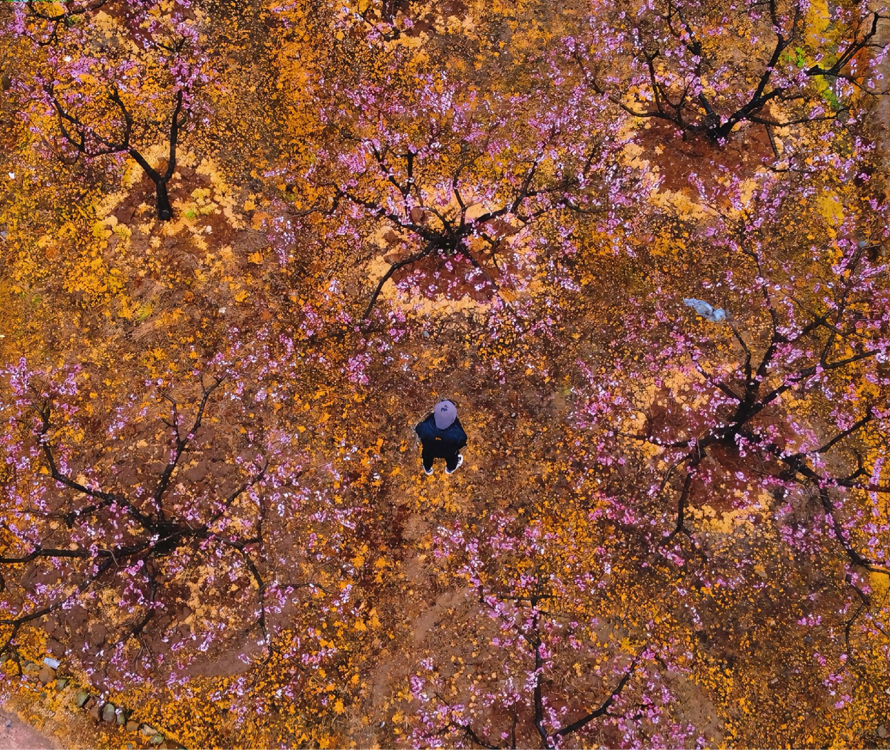 春日公园,俯拍视角太上头!粉色樱花铺满地面,像打翻的腮红盘~橙色落叶悄悄混入,撞出温柔秋春CP。黑色大衣+灰帽的我,慢悠悠独行其中,树枝在头顶织成天然画框。谁说赏樱一定要人挤人?这片静谧花海,才是大地最浪漫的即兴创作呀~