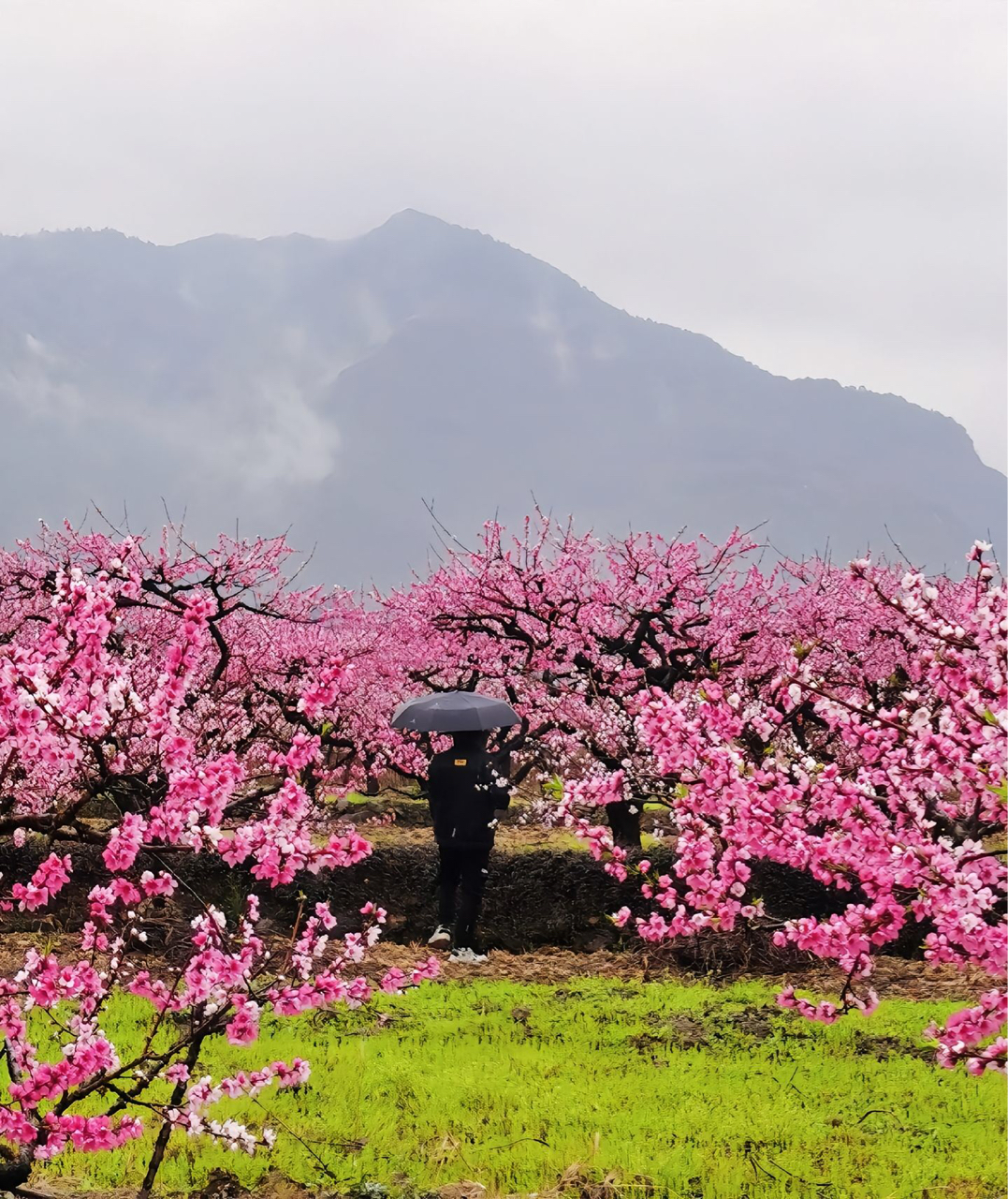雨丝轻飘,伞下偷拍桃林小景~粉云浮在青草地,远山淡成水墨。快门按下去的瞬间,连雨滴都替我藏住了春天。撑伞人歪头一笑,整片桃园都成了柔焦背景。江南三月,原来最野的构图,是让花枝自己闯进镜头里。