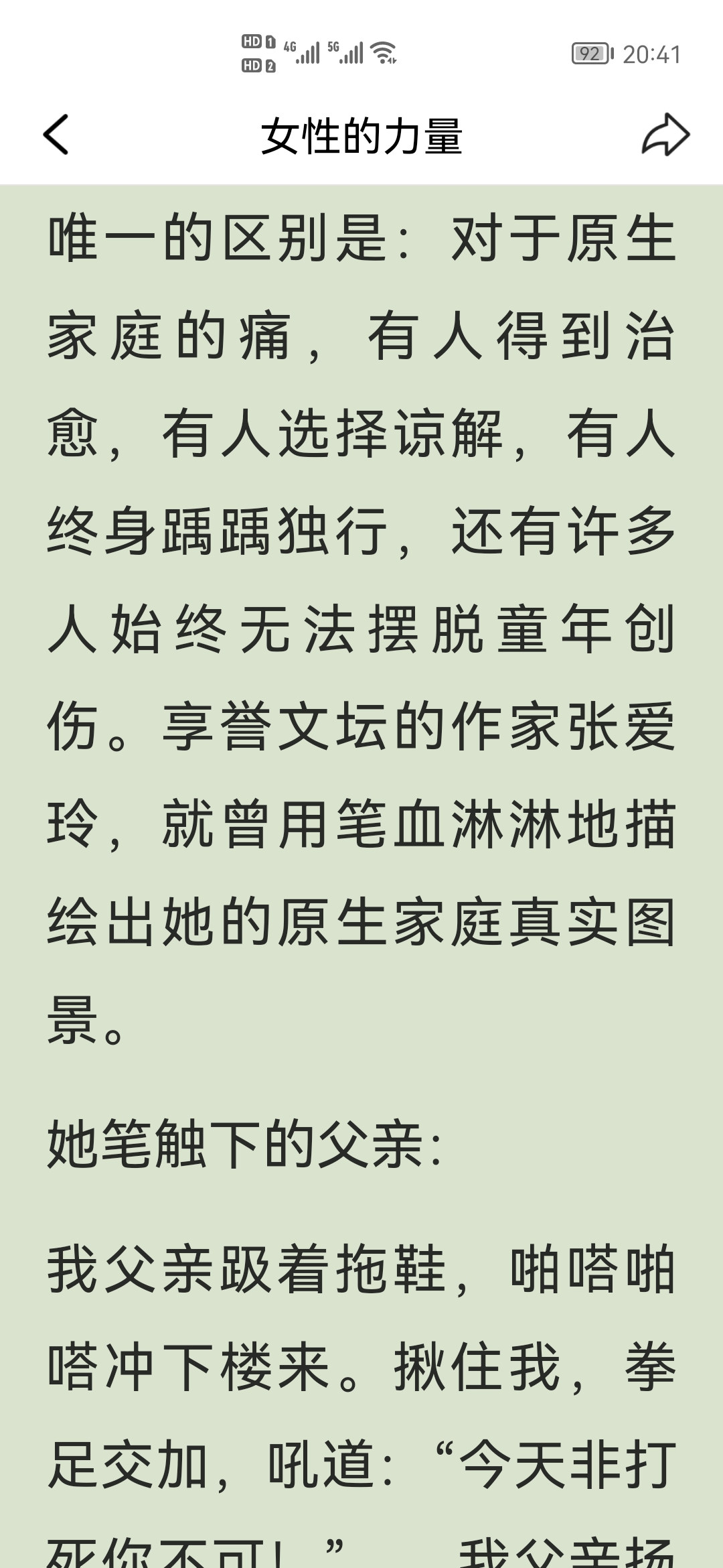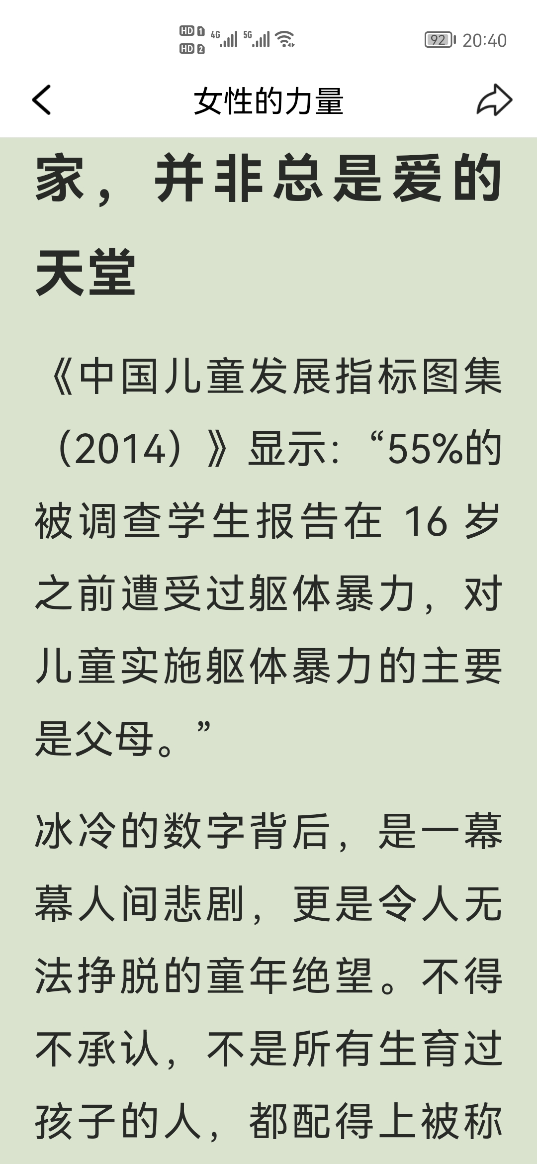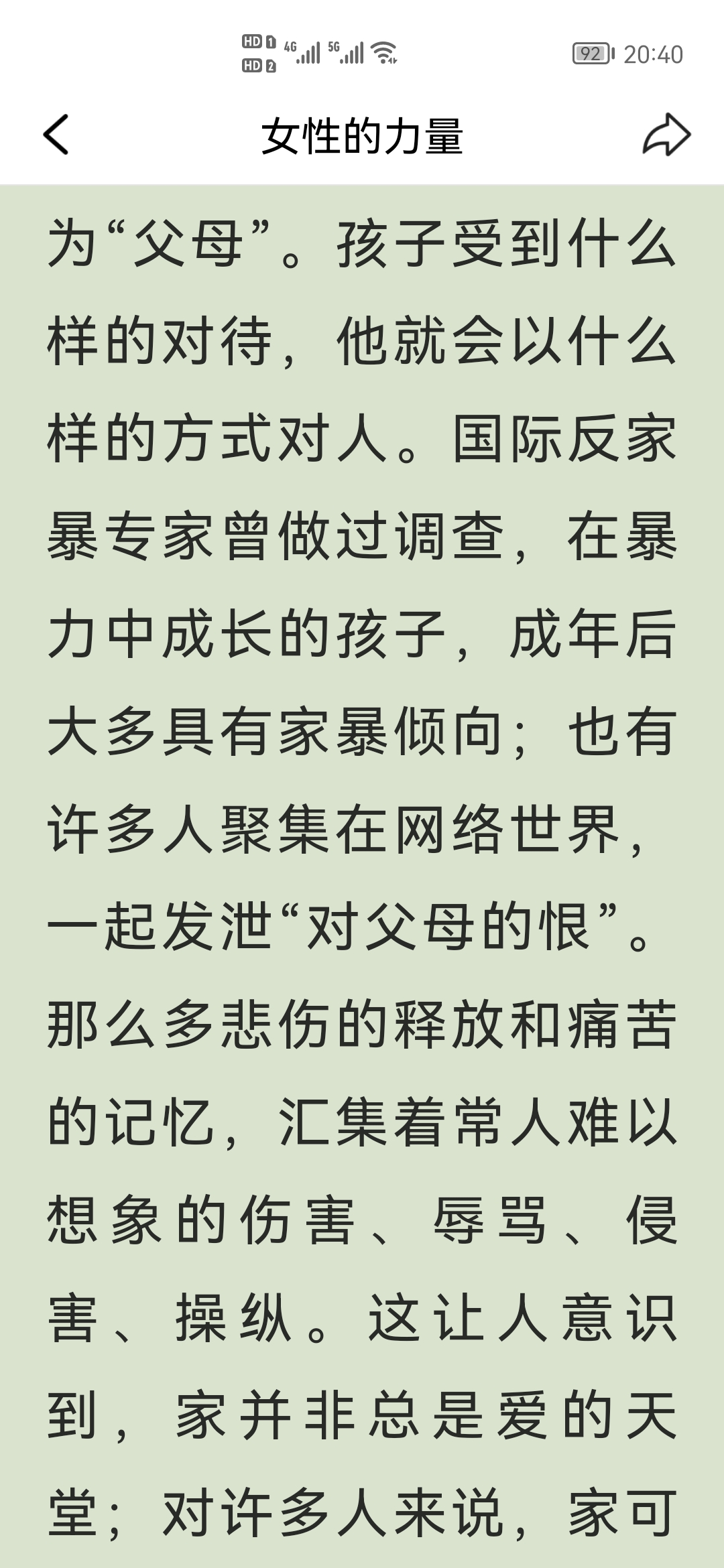 《女性的力量》第四章第一小节内容与阅读体会 一、主要内容 本小节以“家,并非总是爱的天堂”为核心,先引用《中国儿童发展指标图集(2014)》数据,指出55%的16岁前学生曾遭受父母实施的躯体暴力,揭示冰冷数字背后童年创伤的残酷现实,提出并非所有生育者都配称“父母”的观点。 接着说明原生家庭暴力的代际影响:在暴力中成长的孩子成年后易有家暴倾向,也可能在网络发泄对父母的怨恨,这些伤害包括辱骂、侵害、操纵等,凸显原生家庭创伤的深远性。同时强调,女性因性别不平等、身份认同落差,所承受的原生家庭痛苦尤为深重,身患抑郁症的成年女性,其致病根源常与原生家庭相关。 随后指出,世上无完美父母,每个孩子都或多或少受原生家庭非正面影响,借用米奇·阿尔博姆的表述,说明父母都会给孩子留下成长印记,而面对原生家庭之痛,不同人有着不同结局:有人治愈、有人不解、有人终身受困,还以张爱玲、太宰治等为例,展现原生家庭创伤对个体人生的持续影响,最后抛出核心问题——经历原生之痛的人,该如何走出创伤、走向治愈。 二、阅读体会 读这一小节,心里特别不是滋味,却又觉得无比真实——原来不是所有家都是避风港,原来有些伤害,真的来自最亲近的人。 以前总被“家是爱的天堂”这种话洗脑,觉得父母就该是无条件的爱与包容。可这小节摆出来的数据和案例,直接打破了这种幻想:一半以上的孩子挨过父母的打,还有人在原生家庭里被伤害、被忽视,这种痛不是一句“父母是爱你的”就能抹平的。尤其是对女性来说,原生家庭的苦好像更沉一些——重男轻女的偏见、不被重视的委屈、甚至被亲人伤害的经历,这些藏在角落里的痛,很多人都没法对外人说。 我特别懂那种“困在原生伤害里”的感觉。身边有朋友因为父母从小的否定,长大后连夸自己都觉得别扭;有人被原生家庭的情绪操控,明明想远离,却又忍不住被过去牵绊。就像文中说的,有人像张爱玲一样,一辈子和原生家庭划清界限,却还是被阴影缠了一生;也有人像太宰治笔下的人一样,连幸福都不敢碰,这种无力感太真实了。 但好在,这小节没有只讲痛,还留了一个关键的问题:我们能做什么?这才是最核心的。原生家庭的伤没法改写,但我们可以选择不被它绑架。不用逼着自己“原谅”,也不用困在“恨”里,第一步是先看见自己的伤——承认“我曾经被伤害过”,承认“这些伤影响了我”,而不是假装没事。 然后慢慢学着“解绑”:比如不再用父母的标准苛责自己,不再因为他们的否定否定自己;比如如果暂时没法和解,就先保持距离,先照顾好自己的情绪;比如找一个出口,把心里的委屈、愤怒说出来,写下来,或者找专业的人帮忙。 对女性来说,走出原生之痛,其实就是找回自己的过程。不用逼自己成为“完美的女儿”,不用活成父母期待的样子,先做自己的“父母”,好好疼自己,慢慢修补那些破碎的地方。毕竟,人生的后半程,我们有能力给自己一个新的“家”——一个由自己构建的、充满爱与安全感的内心家园。