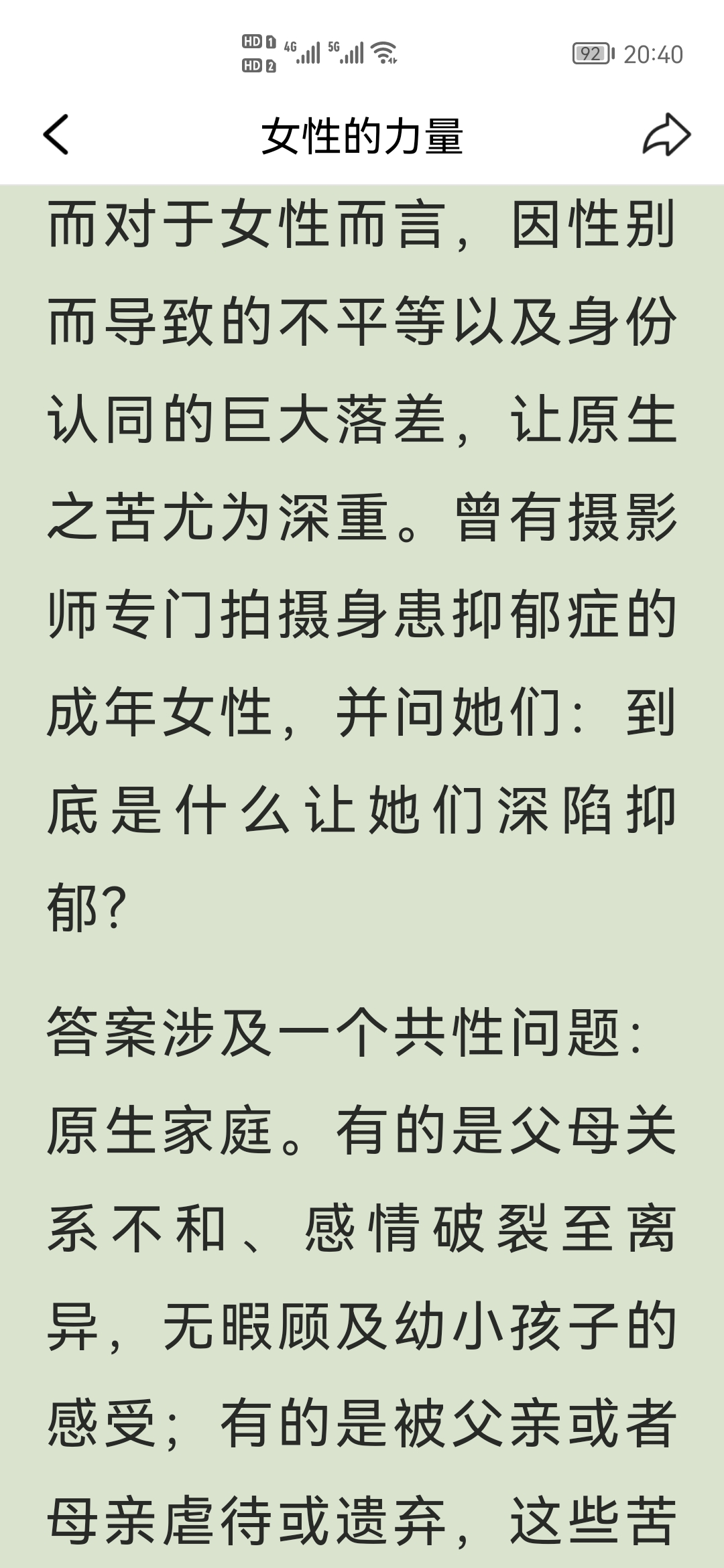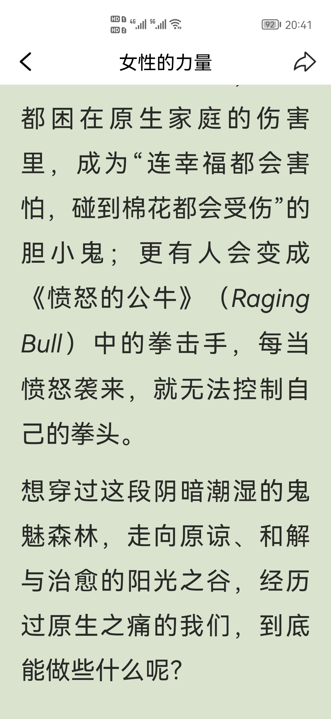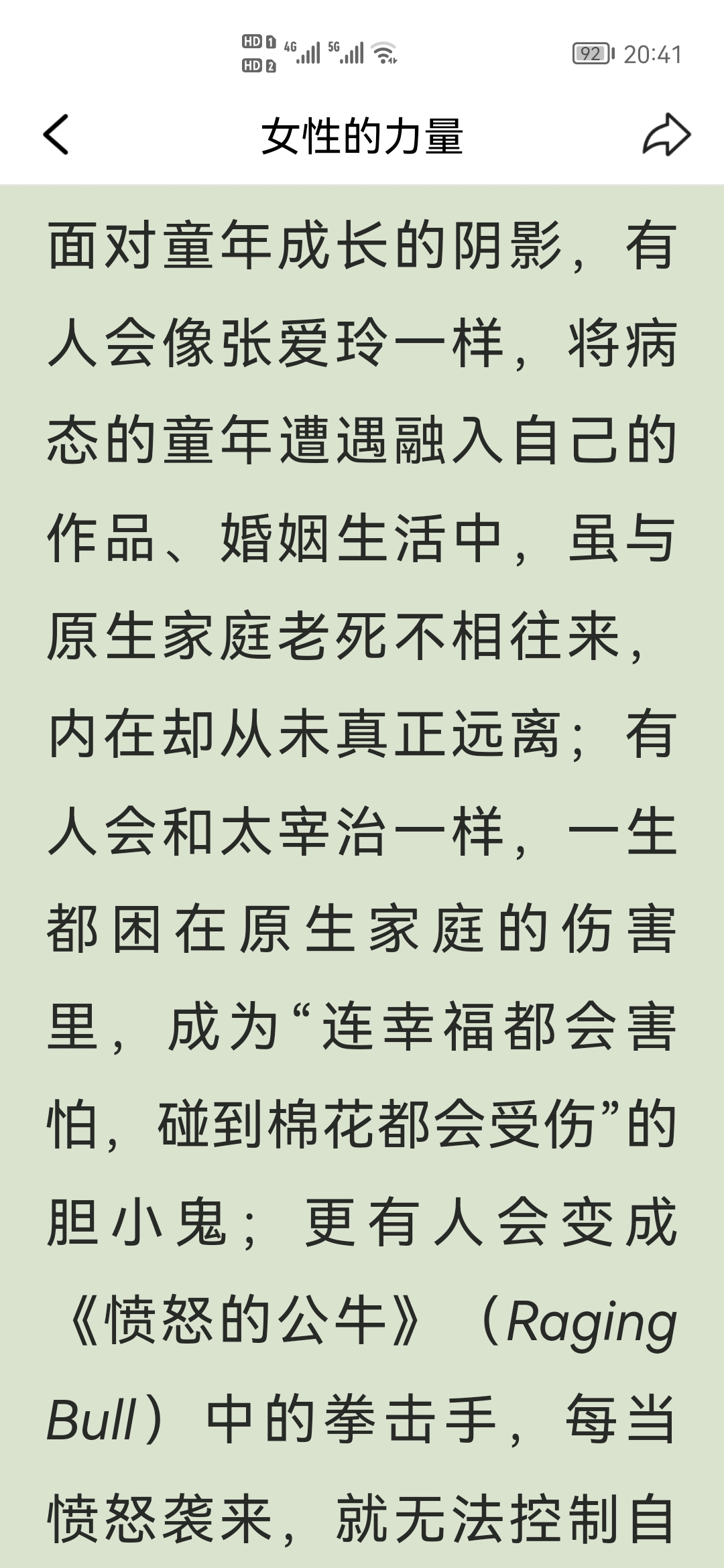 《女性的力量》第四章第一小节内容与阅读体会 一、主要内容 本小节以“家,并非总是爱的天堂”为核心,先引用《中国儿童发展指标图集(2014)》数据,指出55%的16岁前学生曾遭受父母实施的躯体暴力,揭示冰冷数字背后童年创伤的残酷现实,提出并非所有生育者都配称“父母”的观点。 接着说明原生家庭暴力的代际影响:在暴力中成长的孩子成年后易有家暴倾向,也可能在网络发泄对父母的怨恨,这些伤害包括辱骂、侵害、操纵等,凸显原生家庭创伤的深远性。同时强调,女性因性别不平等、身份认同落差,所承受的原生家庭痛苦尤为深重,身患抑郁症的成年女性,其致病根源常与原生家庭相关。 随后指出,世上无完美父母,每个孩子都或多或少受原生家庭非正面影响,借用米奇·阿尔博姆的表述,说明父母都会给孩子留下成长印记,而面对原生家庭之痛,不同人有着不同结局:有人治愈、有人不解、有人终身受困,还以张爱玲、太宰治等为例,展现原生家庭创伤对个体人生的持续影响,最后抛出核心问题——经历原生之痛的人,该如何走出创伤、走向治愈。 二、阅读体会 读这一小节,心里特别不是滋味,却又觉得无比真实——原来不是所有家都是避风港,原来有些伤害,真的来自最亲近的人。 以前总被“家是爱的天堂”这种话洗脑,觉得父母就该是无条件的爱与包容。可这小节摆出来的数据和案例,直接打破了这种幻想:一半以上的孩子挨过父母的打,还有人在原生家庭里被伤害、被忽视,这种痛不是一句“父母是爱你的”就能抹平的。尤其是对女性来说,原生家庭的苦好像更沉一些——重男轻女的偏见、不被重视的委屈、甚至被亲人伤害的经历,这些藏在角落里的痛,很多人都没法对外人说。 我特别懂那种“困在原生伤害里”的感觉。身边有朋友因为父母从小的否定,长大后连夸自己都觉得别扭;有人被原生家庭的情绪操控,明明想远离,却又忍不住被过去牵绊。就像文中说的,有人像张爱玲一样,一辈子和原生家庭划清界限,却还是被阴影缠了一生;也有人像太宰治笔下的人一样,连幸福都不敢碰,这种无力感太真实了。 但好在,这小节没有只讲痛,还留了一个关键的问题:我们能做什么?这才是最核心的。原生家庭的伤没法改写,但我们可以选择不被它绑架。不用逼着自己“原谅”,也不用困在“恨”里,第一步是先看见自己的伤——承认“我曾经被伤害过”,承认“这些伤影响了我”,而不是假装没事。 然后慢慢学着“解绑”:比如不再用父母的标准苛责自己,不再因为他们的否定否定自己;比如如果暂时没法和解,就先保持距离,先照顾好自己的情绪;比如找一个出口,把心里的委屈、愤怒说出来,写下来,或者找专业的人帮忙。 对女性来说,走出原生之痛,其实就是找回自己的过程。不用逼自己成为“完美的女儿”,不用活成父母期待的样子,先做自己的“父母”,好好疼自己,慢慢修补那些破碎的地方。毕竟,人生的后半程,我们有能力给自己一个新的“家”——一个由自己构建的、充满爱与安全感的内心家园。