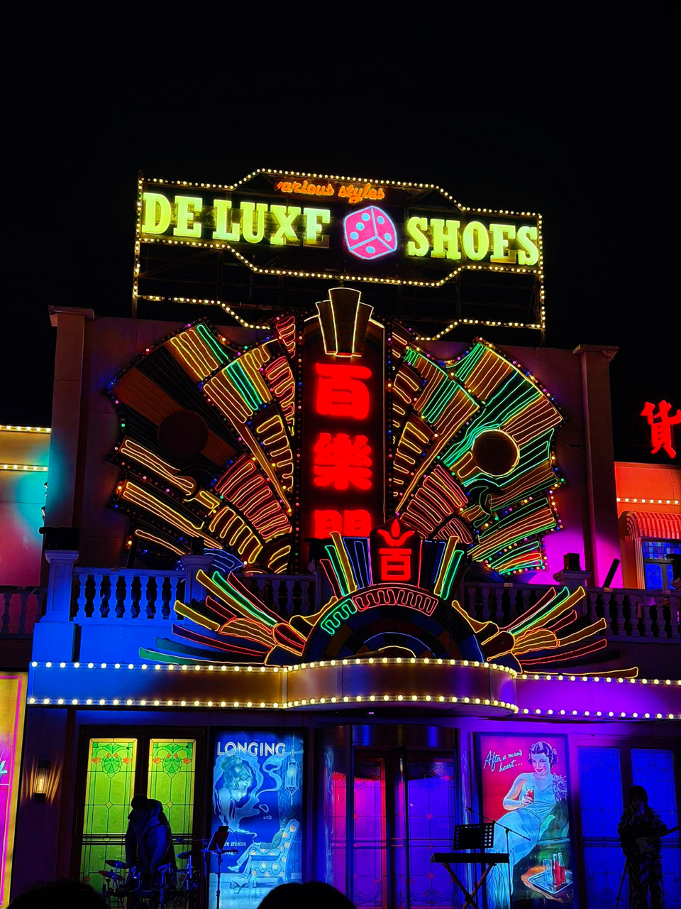 百乐鞋店那块DE LUXE SHOES霓虹招牌太上头!紫光打底,中英双语闪得恰到好处,骰子图案+玻璃窗插画,复古得刚刚好~随手一拍就是Longing海报感。谁懂?这哪是鞋店,分明是藏在夜色里的小舞台✨