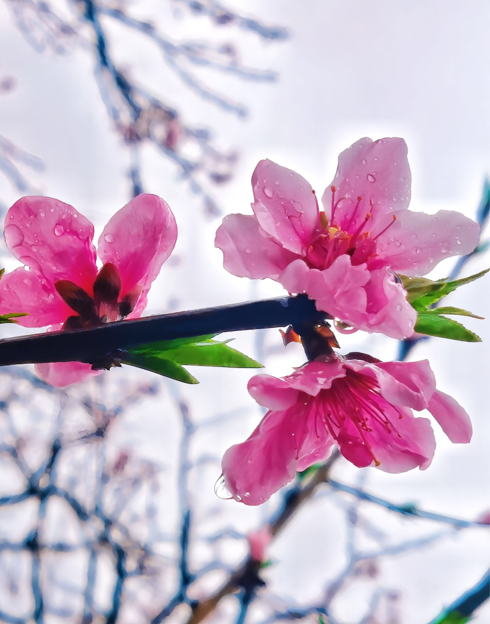 今早遛弯撞见雨后桃花,粉嘟嘟的花瓣上还挂着水珠,嫩叶衬着花蕊,湿漉漉的春意扑面而来~顺手咔嚓几张,连树枝都透着一股子鲜活劲儿。春天哪用找?它就蹲在你抬头的一瞬,悄悄滴落肩头~