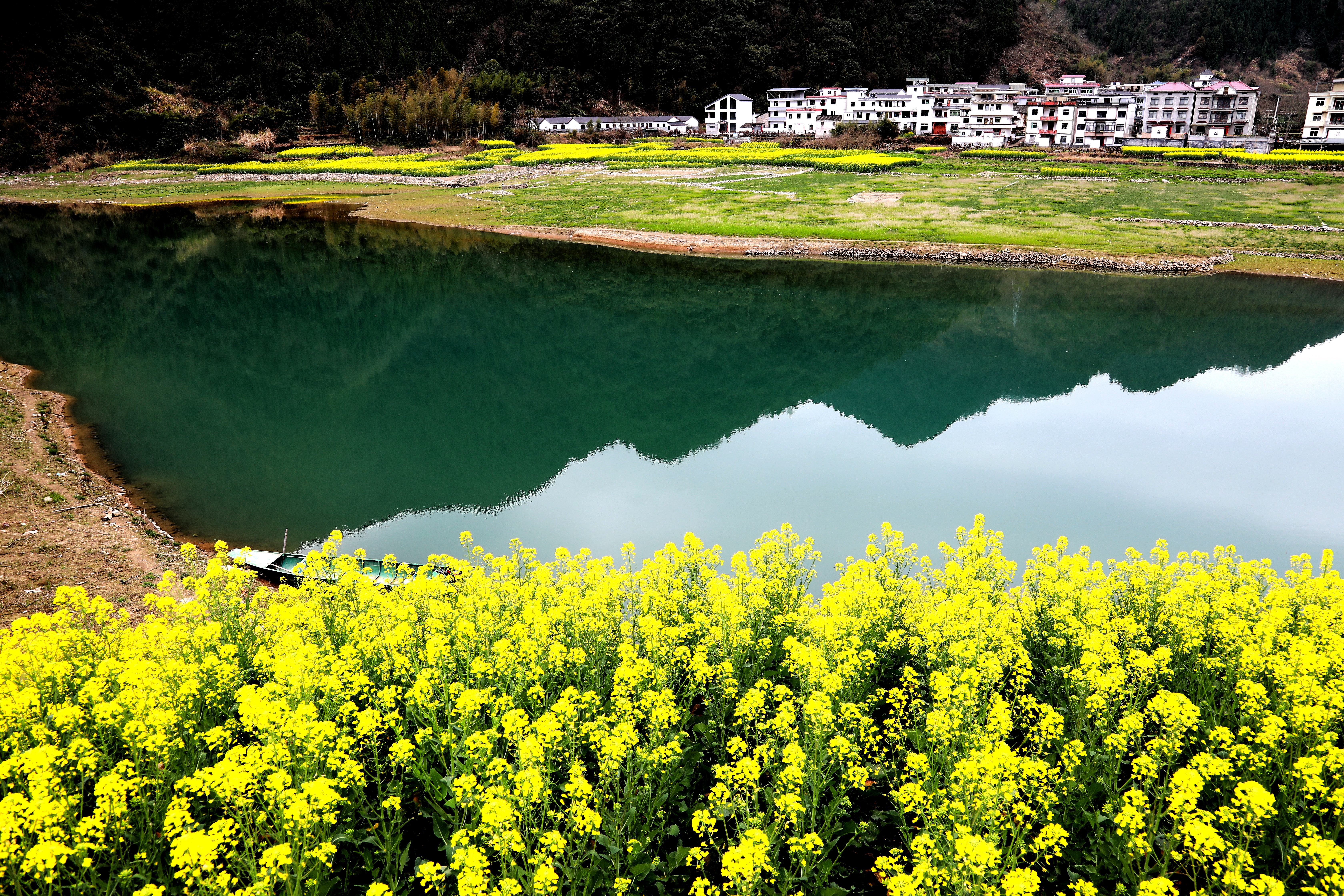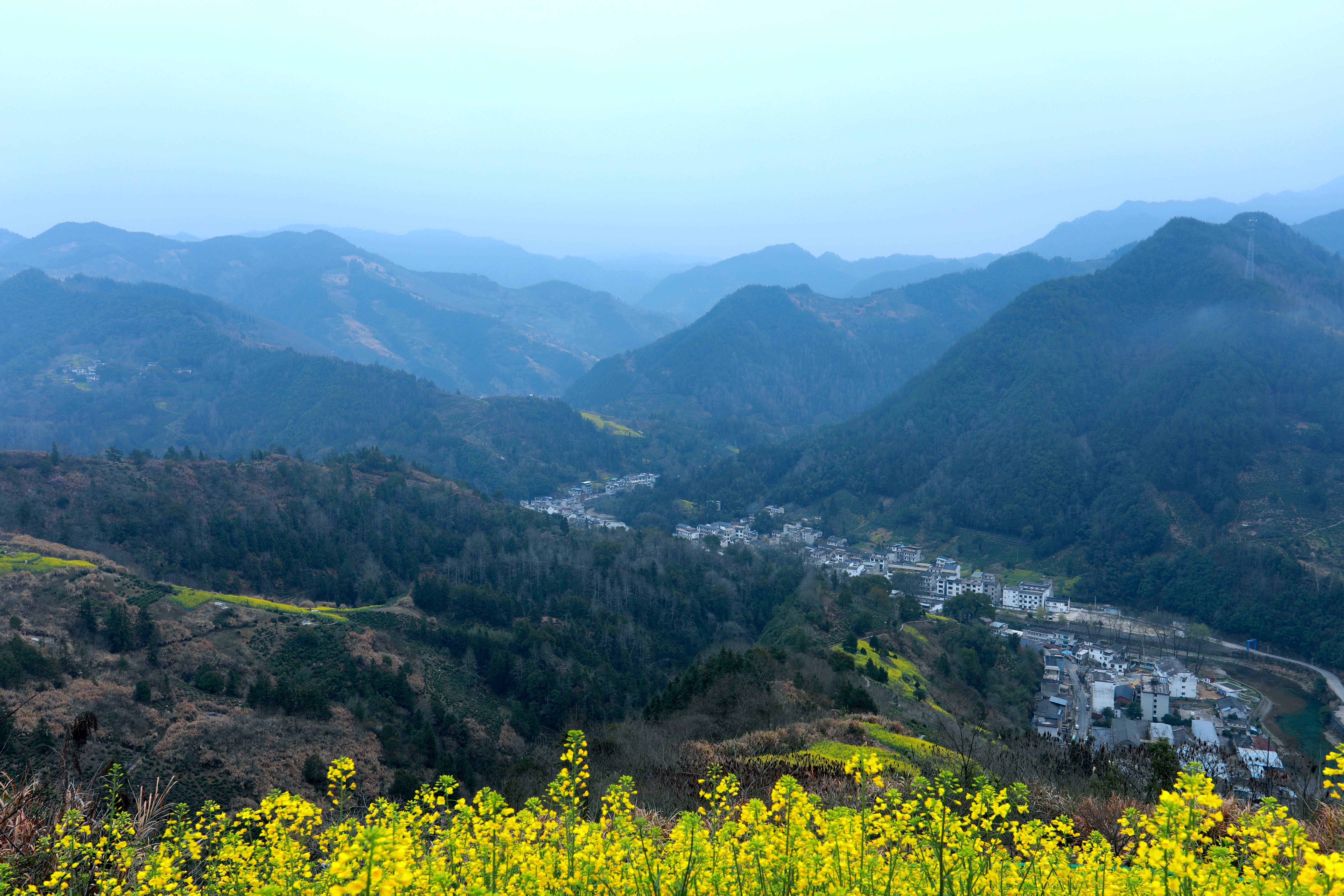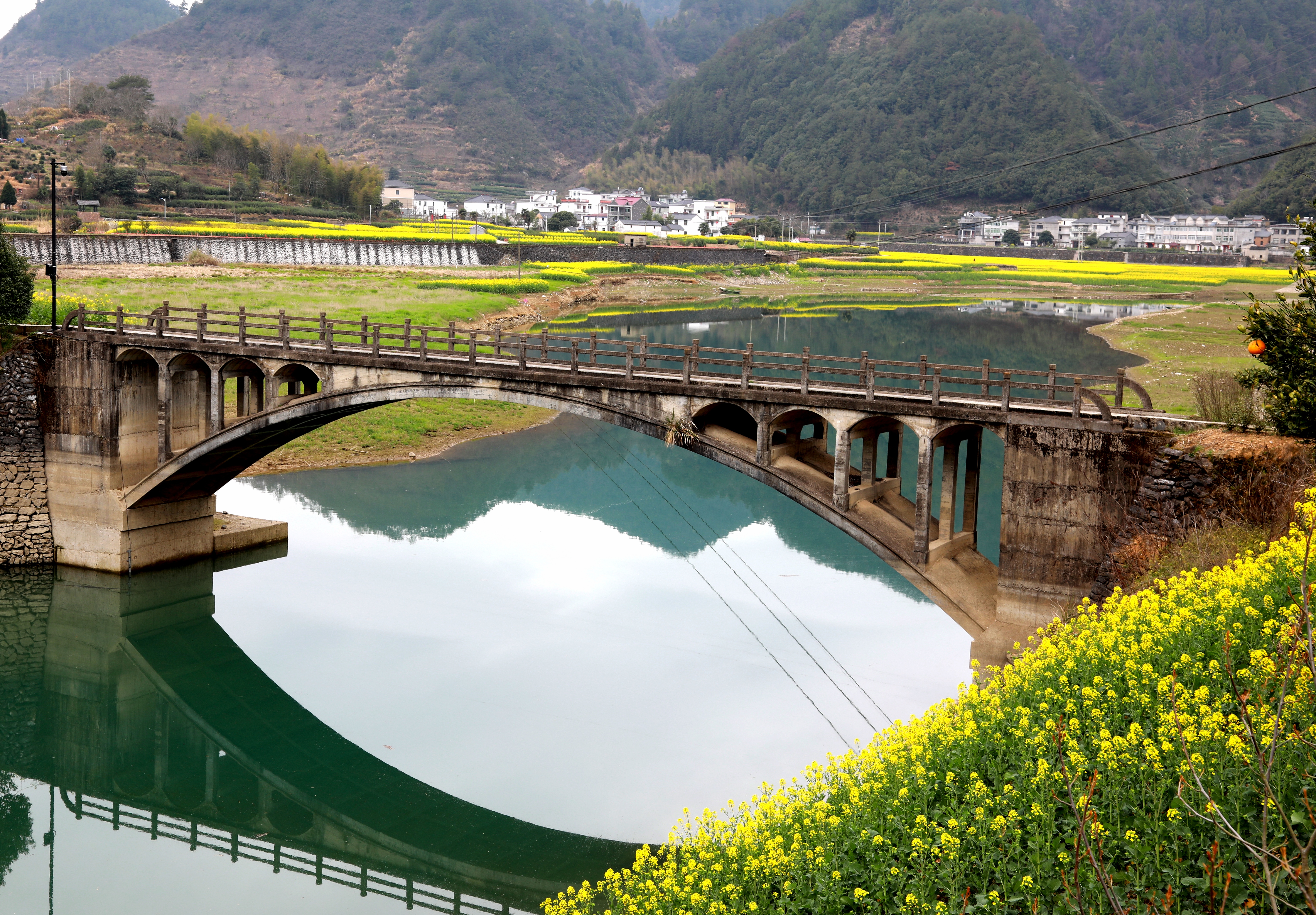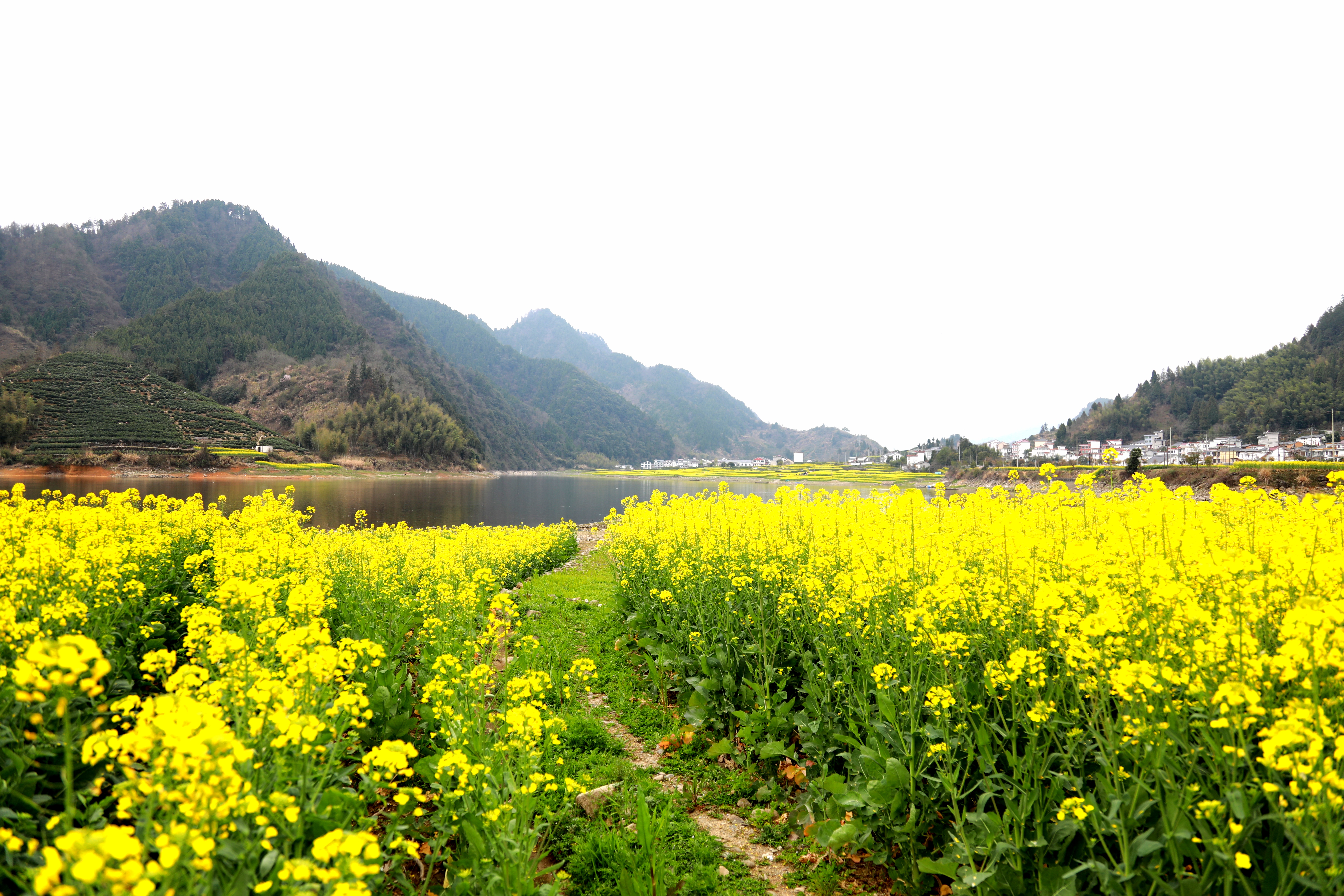 油菜花田漫过青瓦白墙,溪流轻绕古桥,山色与云雾低语,春在徽州的褶皱里缓缓铺展。