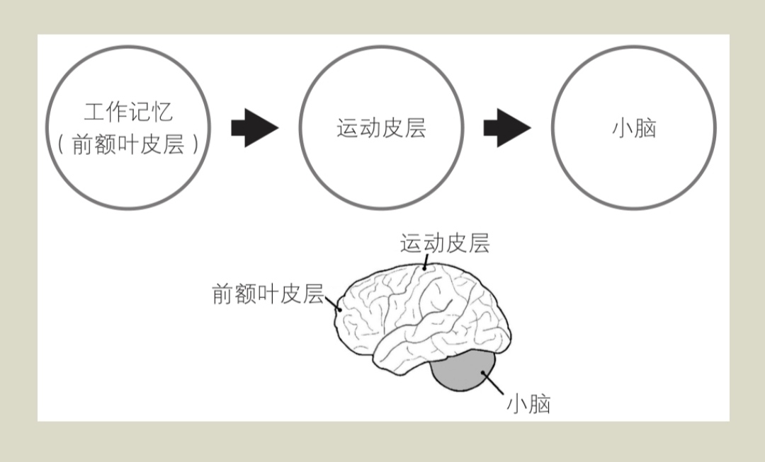 《脑力觉醒》阅读第8天 第六章 全新的身心连接——工作记忆与运动 一、工作记忆运动学习回路(图2) 1.当教练进行指导,工作记忆会通过 前额叶皮层,也就是大脑认知中心, 对指令进行处理。 2.前额叶皮层会把这些信息传输给小脑一大脑的协调中心,并在大脑中对这些动作进行演练。 3.最后,小脑把信息传输给运动皮层,也就是负责随意运动(1)的脑区,指挥肌肉按照教练的指示运动。 这三个步骤就像排球中的“跳、传、扣”。每个队员接到球后都要按照顺序 二、当我们很疲倦时,大脑会直接进入小脑一运动皮层循环。 三、动作叠加是训练习惯的关键。我们总是急于求成,希望能跳过基础技能的训练。但最好还是分解步骤,巩固每一个动作,然后再将其串联起来。 四、研究证实跑步可以提高工作记忆水平,而赤脚跑步的效果尤为明显,这一发现意义非凡,因为这说明心智能力是可以提高的。我们在锻炼身体时,也在锻炼大脑。(小青的温馨提醒:鞋子有减震效果,赤脚跑步可能对膝盖不好,慎用!) 五、工作记忆练习 向最好的老师学习;选择一对一私教;少说话,多感受;拥抱恐惧;利用疲劳状态;分解、钻研、重组;按需启动工作记忆。
