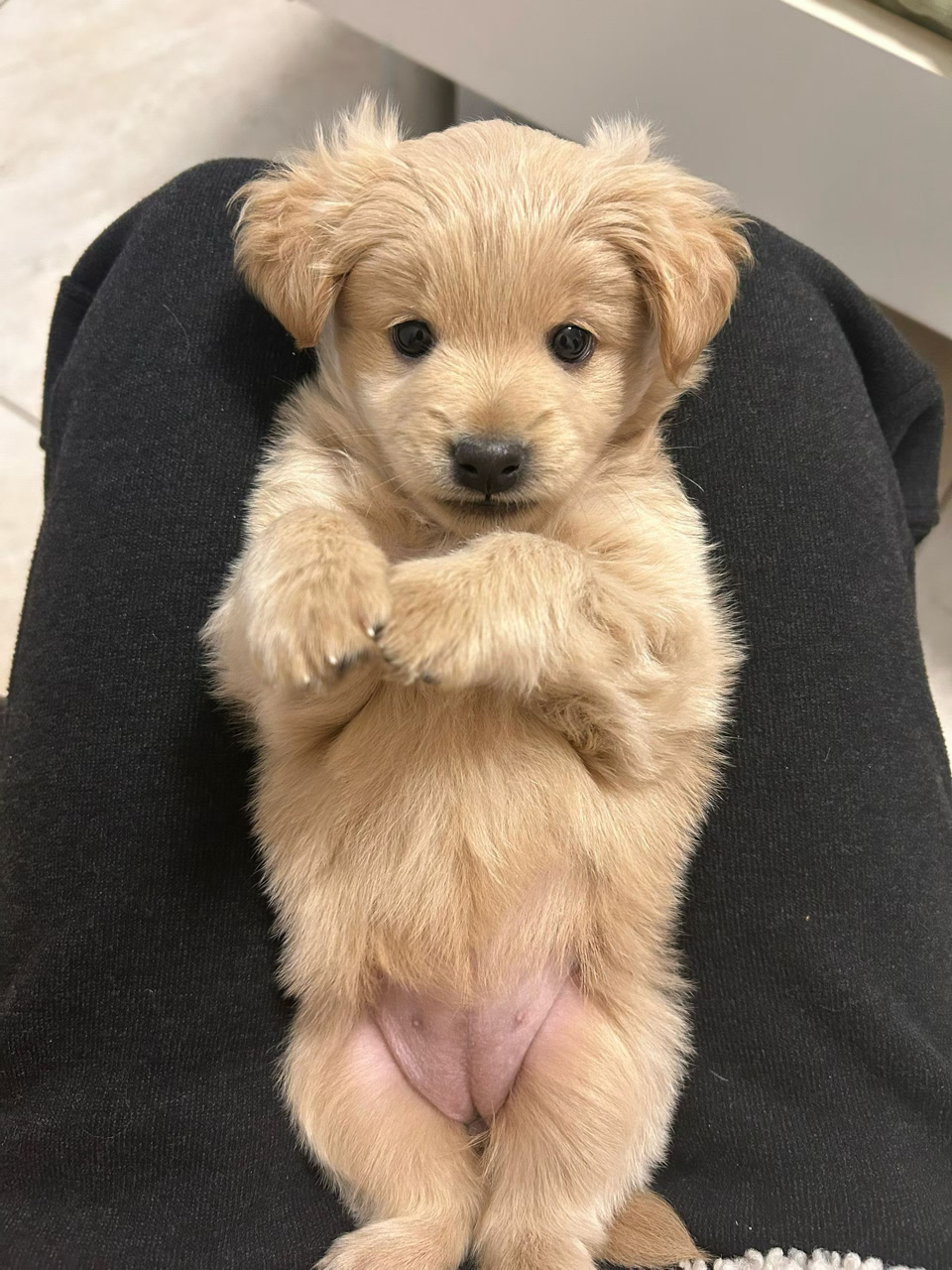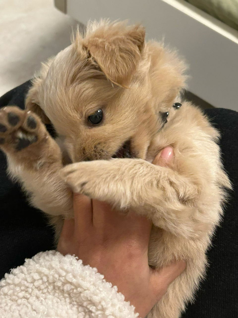 金毛幼犬蜷在怀,浅棕绒毛映白毯,圆眼小鼻,爪轻搭黑衣——时光静默,爱意柔软。