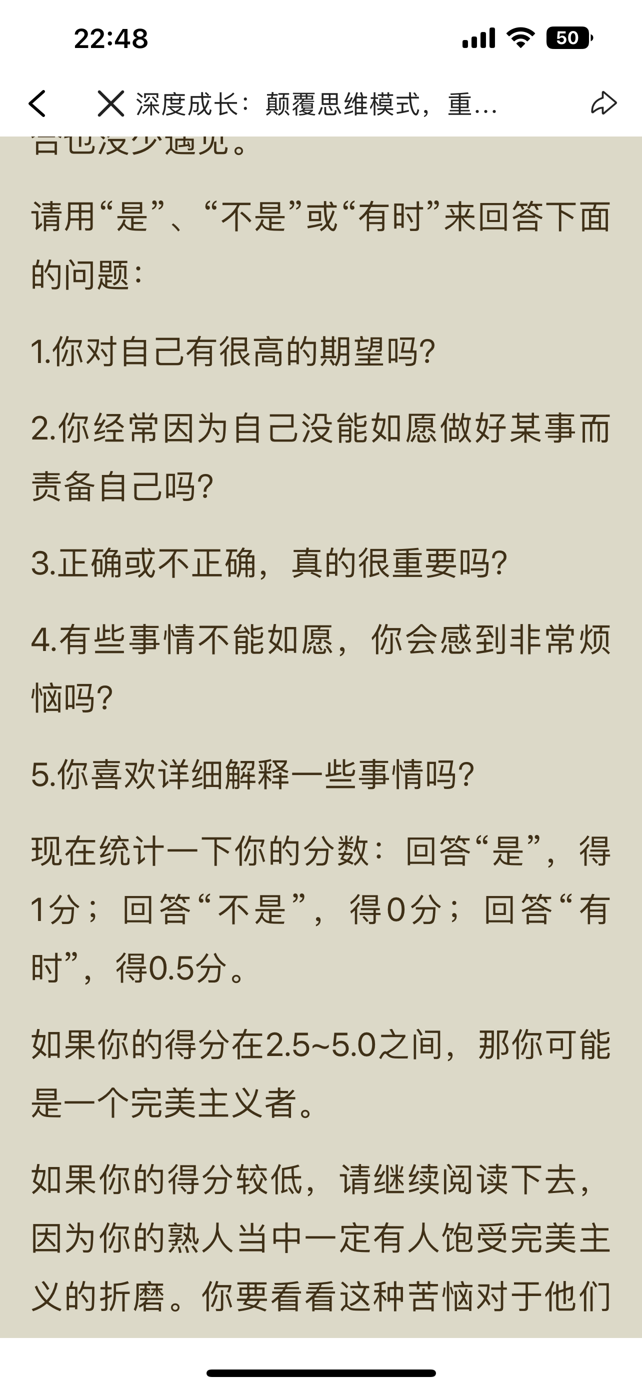 第二轮第八天 今日摘抄: 请用“是”、“不是”或“有时”来回答下面 的问题: 1. 你对自己有很高的期望吗? 2. 你经常因为自己没能如愿做好某事而责备自己吗? 3. 正确或不正确,真的很重要吗? 4. 有些事情不能如愿,你会感到非常烦恼吗? 5. 你喜欢详细解释一些事情吗? 现在统计一下你的分数:回答“是”,得1分;回答“不是”,得0分;回答“有时”,得0.5分。 如果你的得分在2.5~5.0之间,那你可能是一个完美主义者。