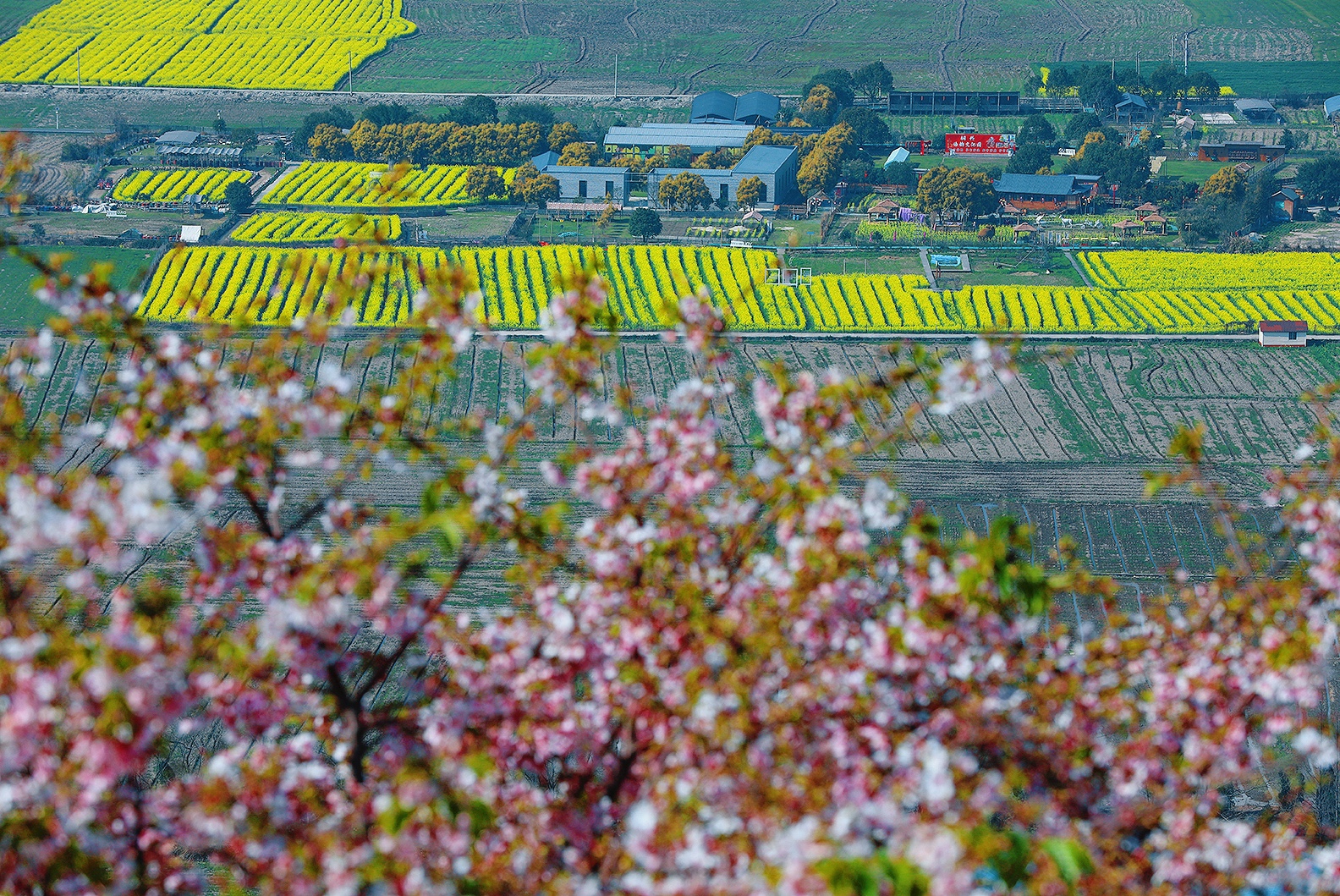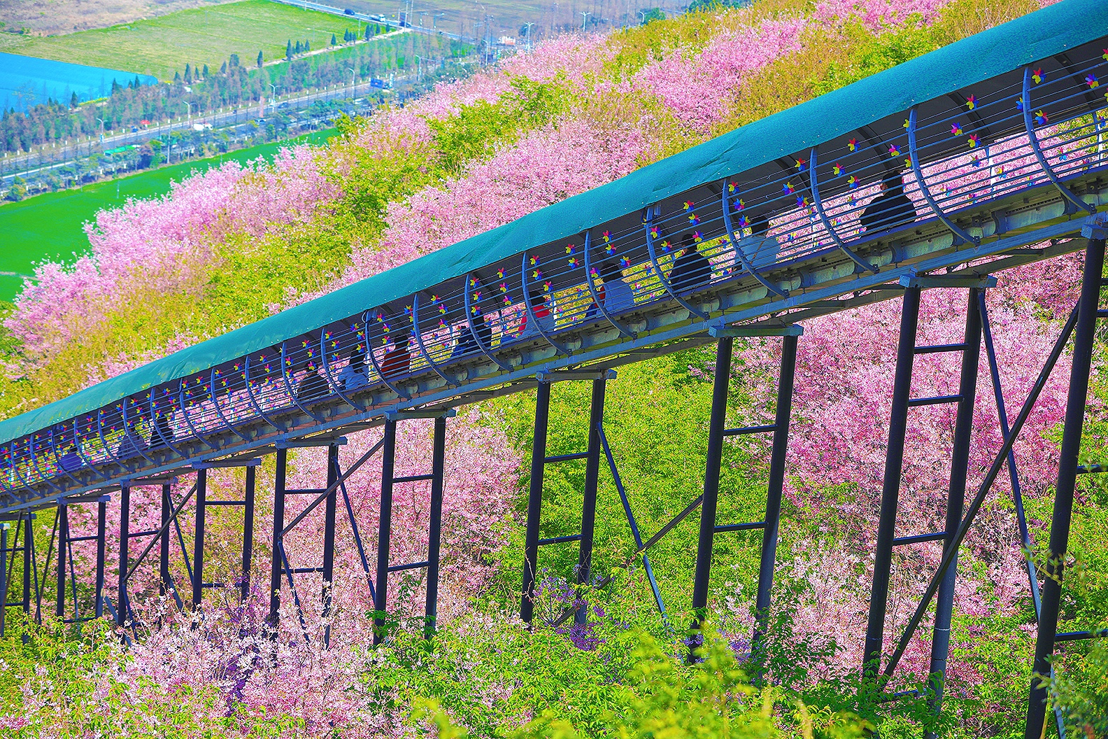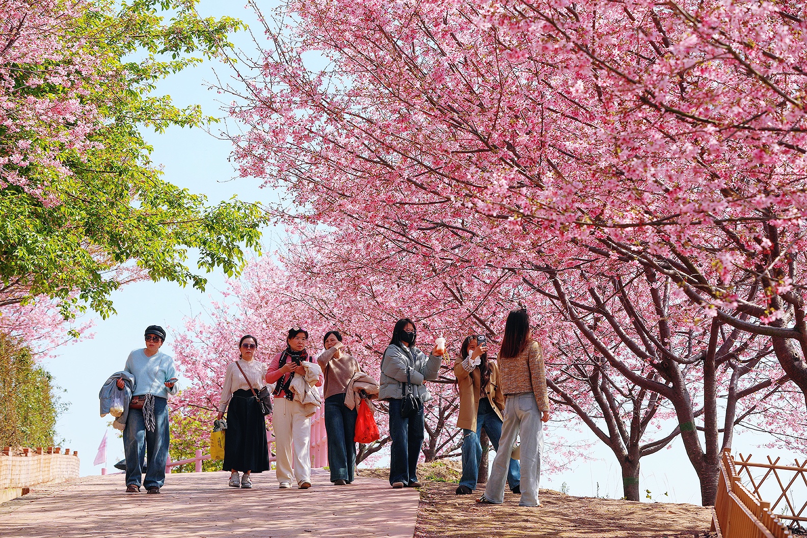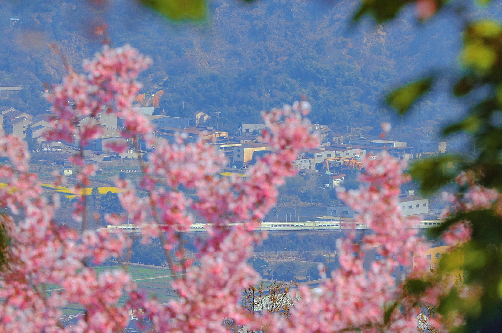 春风漫过江南岸, 粉樱织就云间锦, 金浪翻涌田埂间。 一列银龙破花而来, 载着人间的奔赴与期盼, 在这温柔的春色里, 奔赴下一场山海。 于瑞安桐浦樱花园