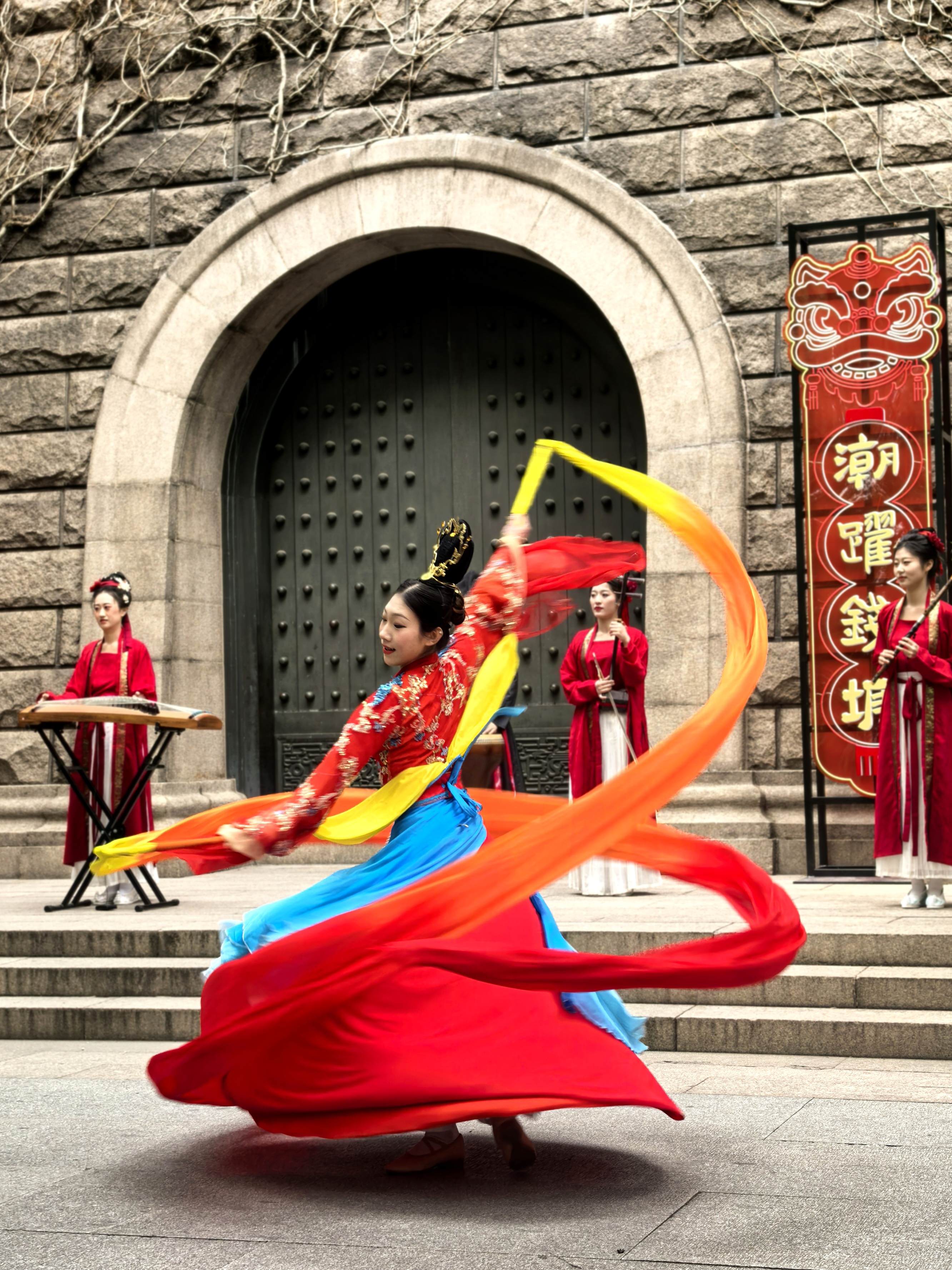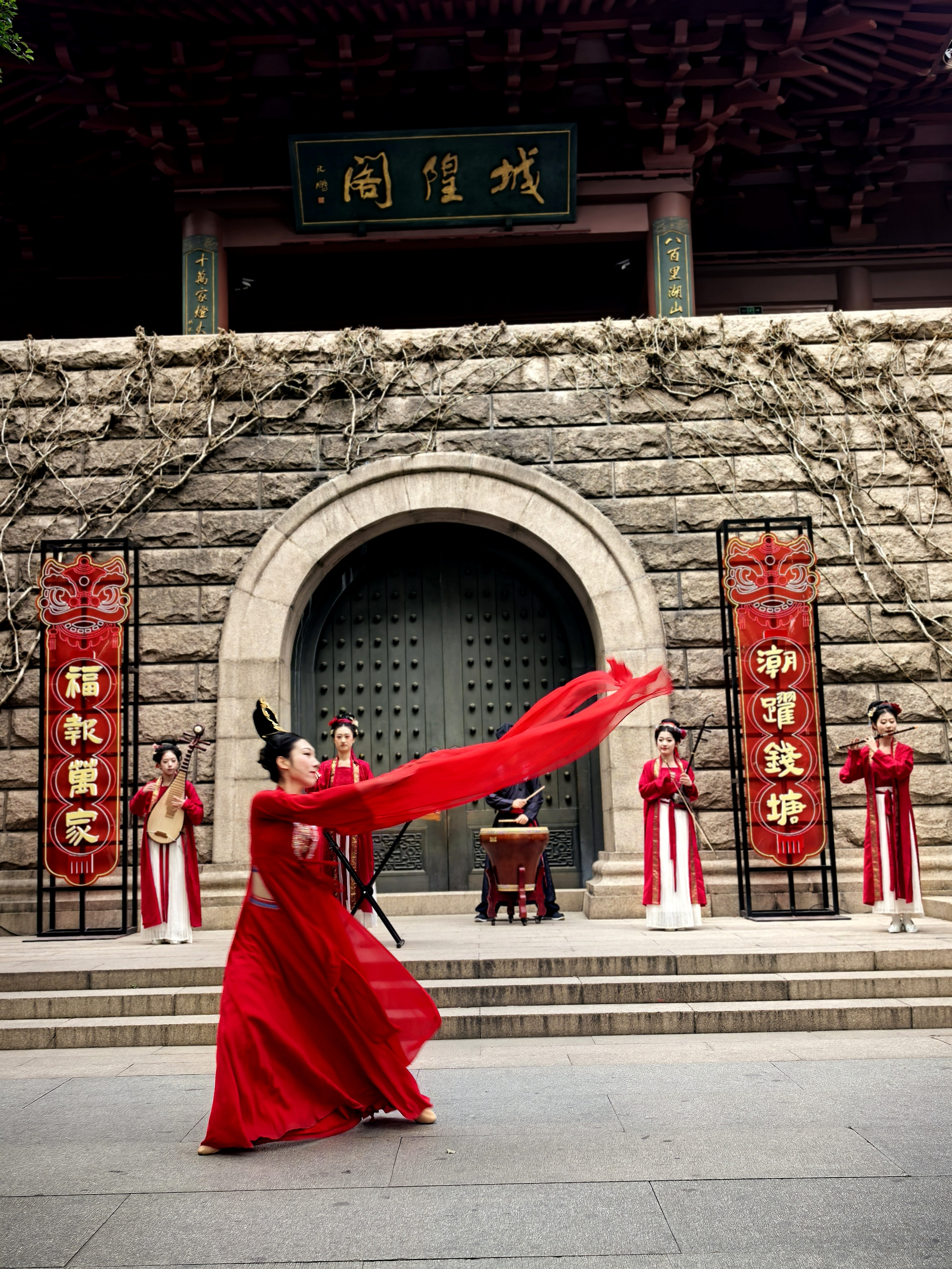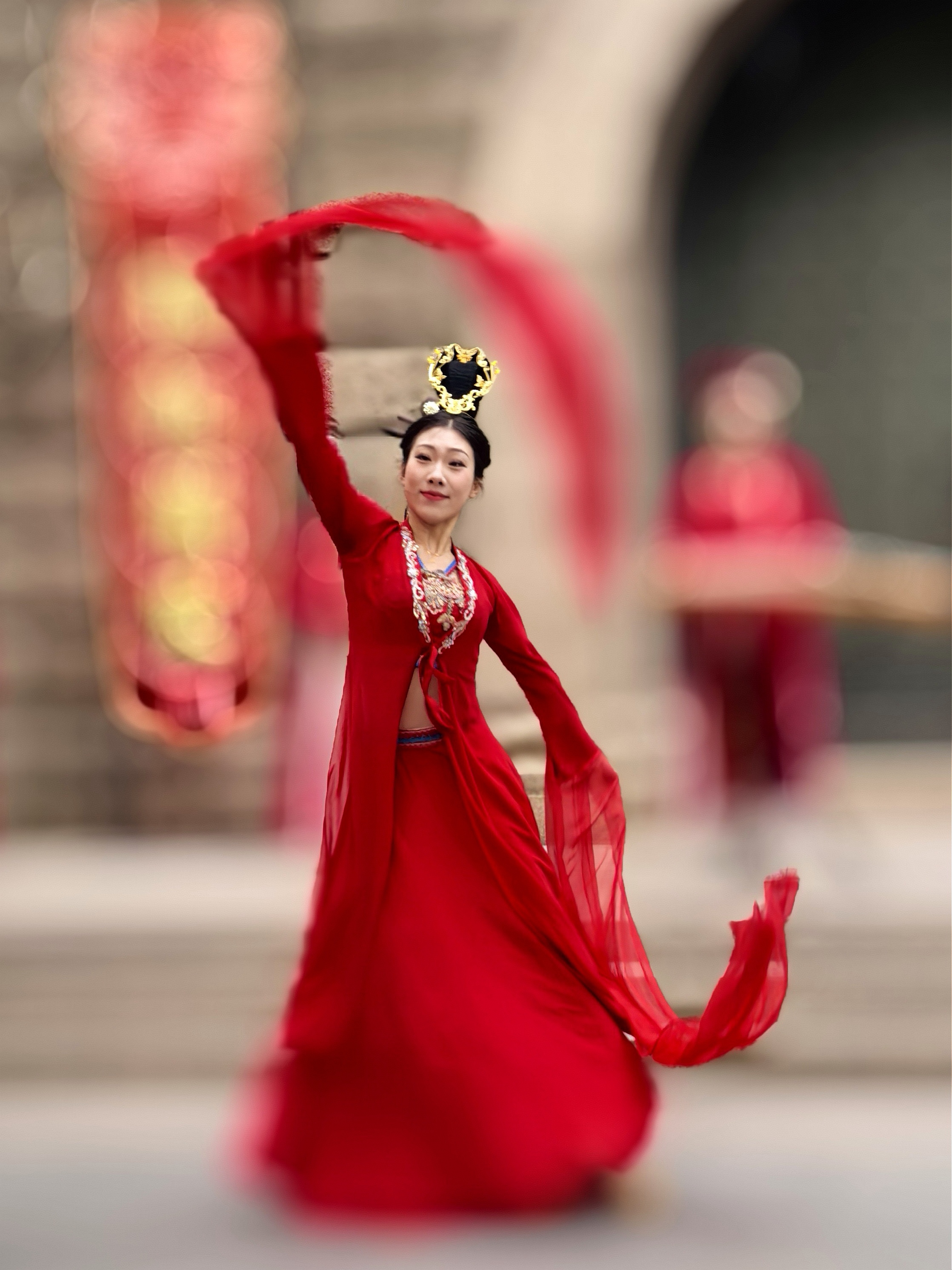 俊俏的舞者水袖翻飞如彩练,红绸曳地,似把盛唐的风裁作衣裳,琵琶弦上流出的乐声,和着古筝、笛箫,在拱门前绕成温柔的圈圈。 一旁红灯笼串成的长廊,映着树影婆娑,风过处,灯影摇曳,把岁月的温柔都揉进这光影里。