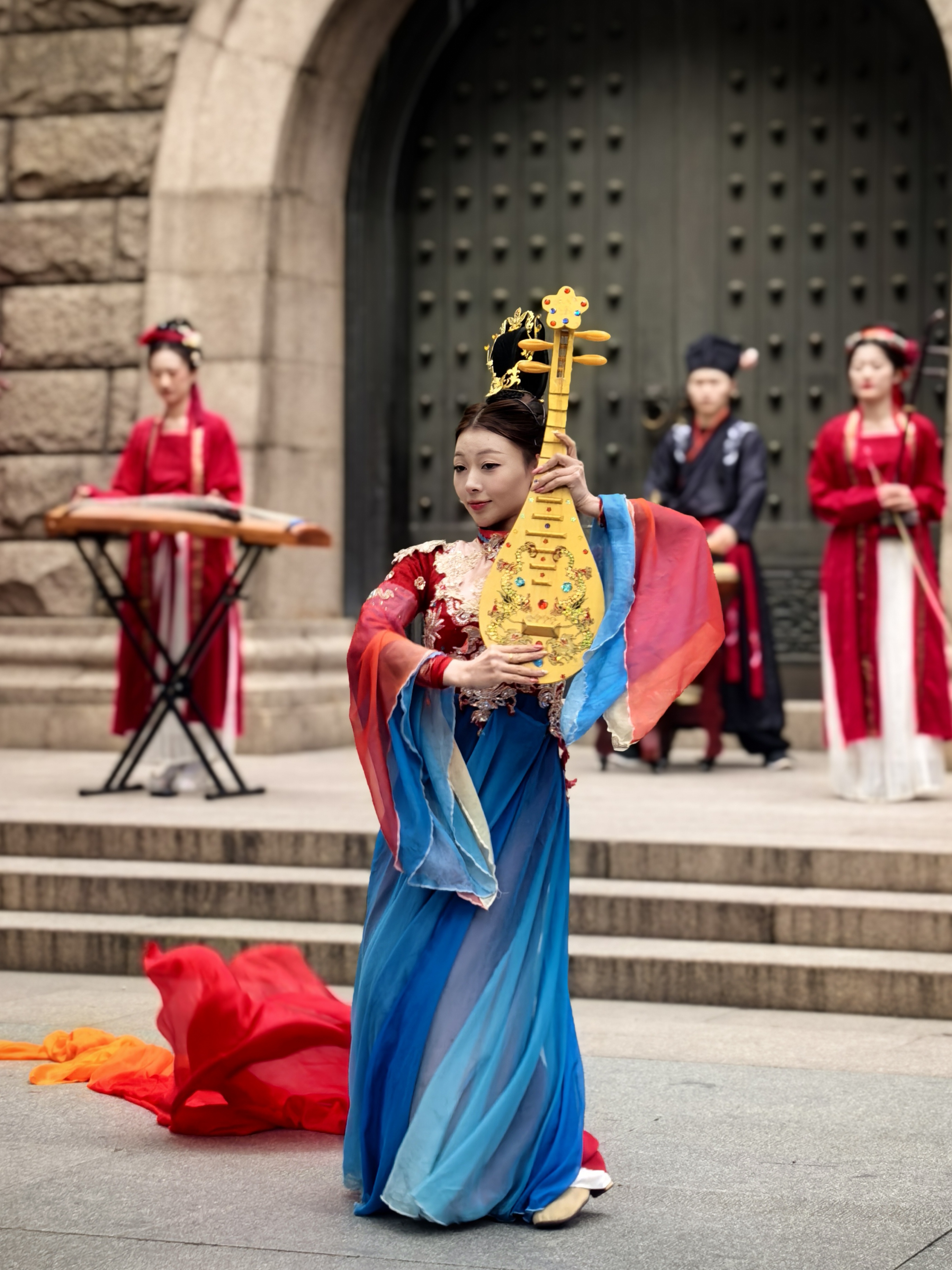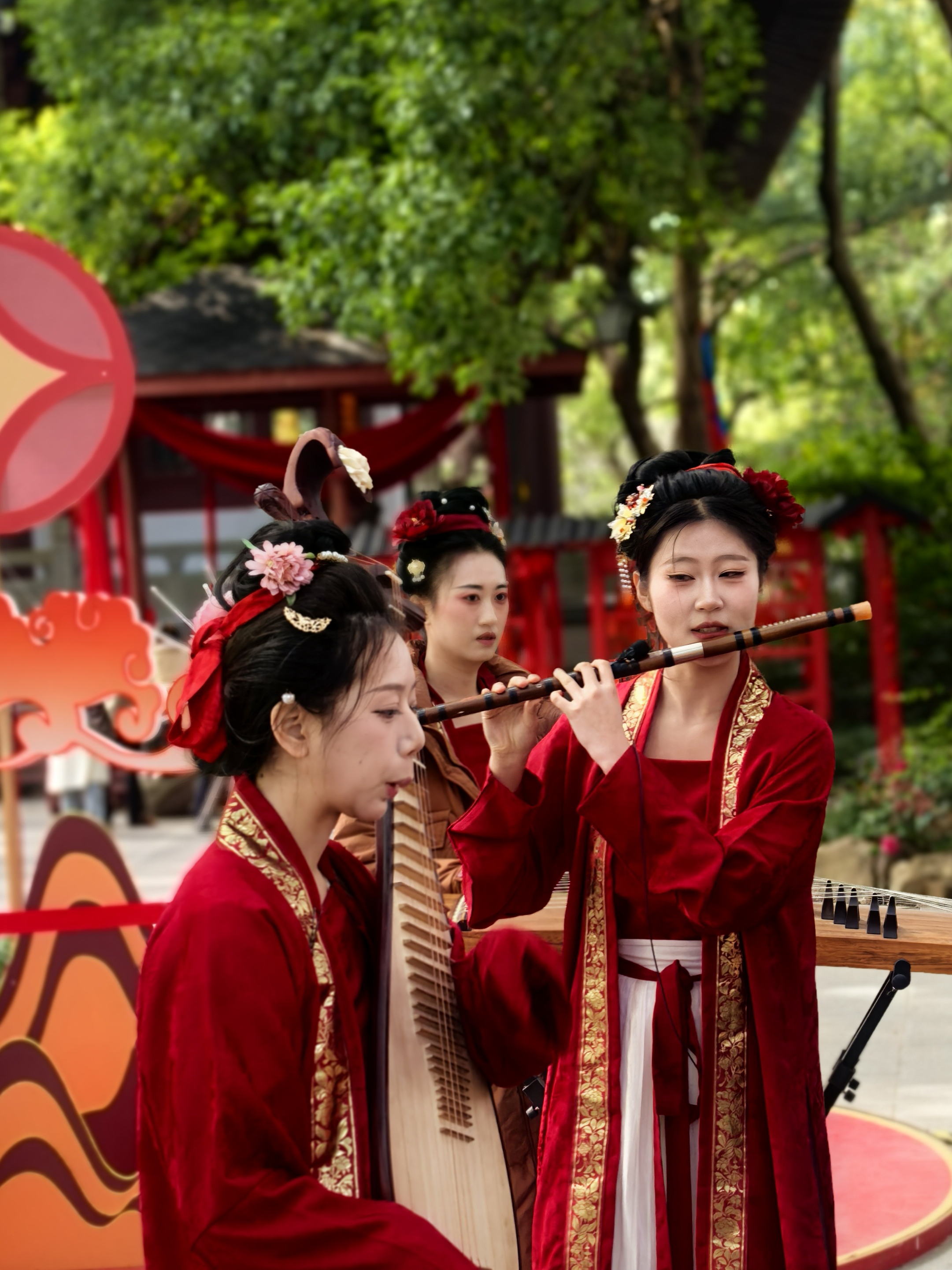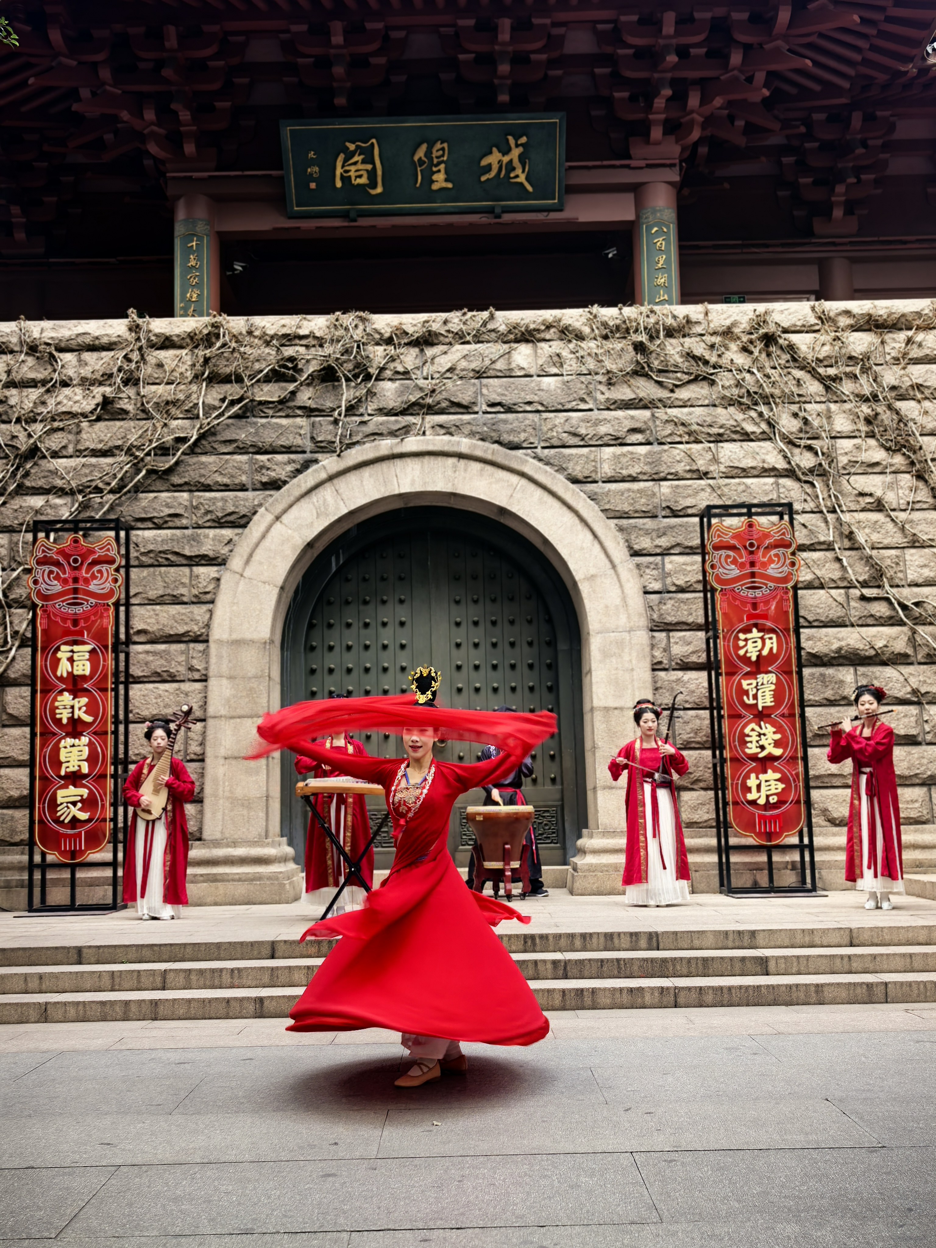 俊俏的舞者水袖翻飞如彩练,红绸曳地,似把盛唐的风裁作衣裳,琵琶弦上流出的乐声,和着古筝、笛箫,在拱门前绕成温柔的圈圈。 一旁红灯笼串成的长廊,映着树影婆娑,风过处,灯影摇曳,把岁月的温柔都揉进这光影里。