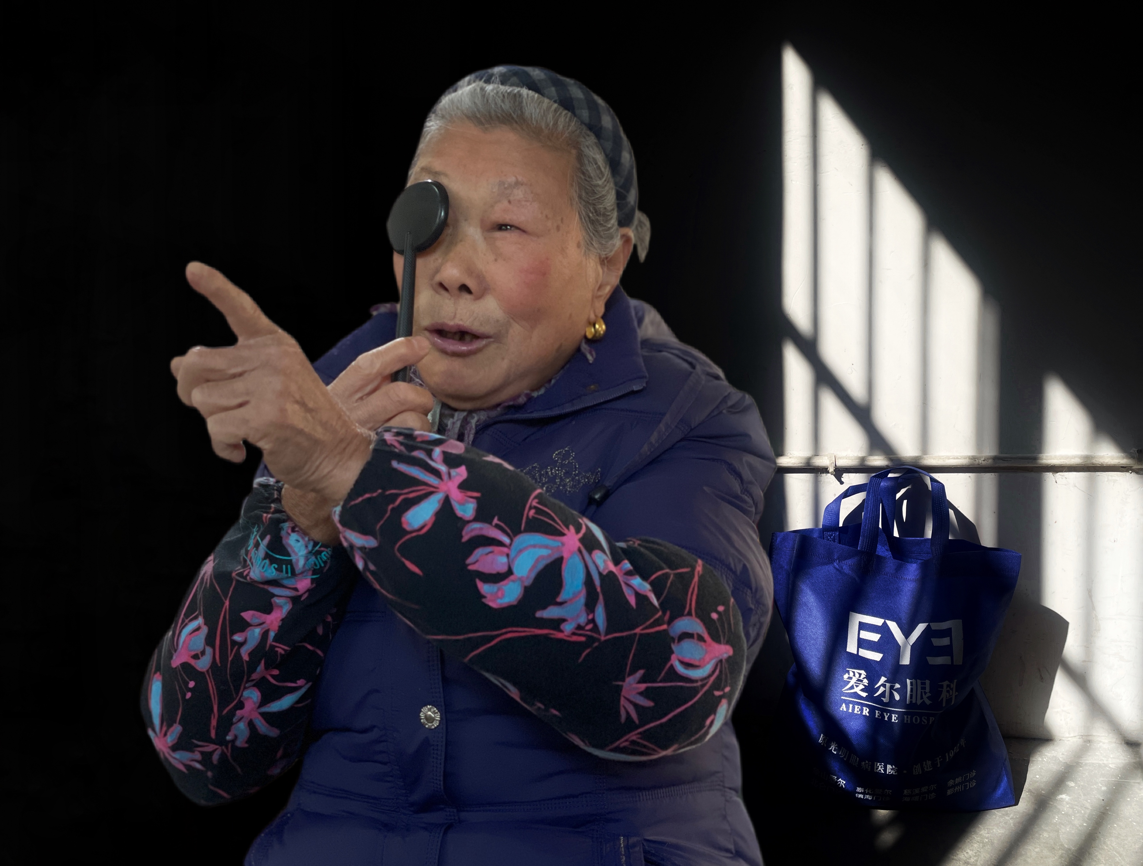 《光影里,看见阿婆的光明!》荒木经惟说:“所谓的摄影,就是拍摄你最喜爱的、最亲密的东西,拍摄近在眼前、就在身边的东西,就是拍人。”今天我拍的这张照片里的阿婆,正是这句话最温柔的注脚。 阳光斜斜切过墙面,在白墙上投下格子状的阴影,像旧时光里的窗棂。阿婆穿着藏青底的棉袄,袖口的粉蓝花朵在光里微微发亮,她举着遮眼板,指尖微微蜷起,另一只手向前探着,像是要抓住眼前的光,又像是在辨认模糊的世界。耳边的金耳环随着她的动作轻轻晃动,银发从格纹头巾里漏出来,被阳光染成暖金色。 这不是宏大的风景,也不是刻意的摆拍,只是一次寻常的眼健康筛查,却藏着最动人的亲近。镜头没有追逐远方,而是停在眼前这位老人身上——她是邻里的长辈,是被阳光眷顾的普通人,是我们身边最熟悉的模样。她脸上的皱纹是岁月刻下的纹路,泛红的脸颊是风霜留下的印记,连那微微张开的嘴,都带着被阳光晒暖的烟火气。 旁边的蓝色布袋上印着“爱尔眼科”的字样,EYE 诉说着这一幕的来由:不是为了艺术而艺术,而是为了守护身边人的光明。摄影在这里,不再是冰冷的技术,而是一种温柔的记录——记录下阿婆努力看清世界的模样,记录下阳光落在她肩头的温度,也记录下我们与身边人之间最朴素的联结。 荒木经惟说要拍“最亲密的东西”,大概就是这样的瞬间:没有距离,没有疏离,只有眼前的人,眼前的光,眼前的生活。这张照片里没有惊天动地的故事,却有着最动人的力量——它让我们看见,真正的摄影,从来都在身边,在那些被我们忽略的、温暖的日常里。