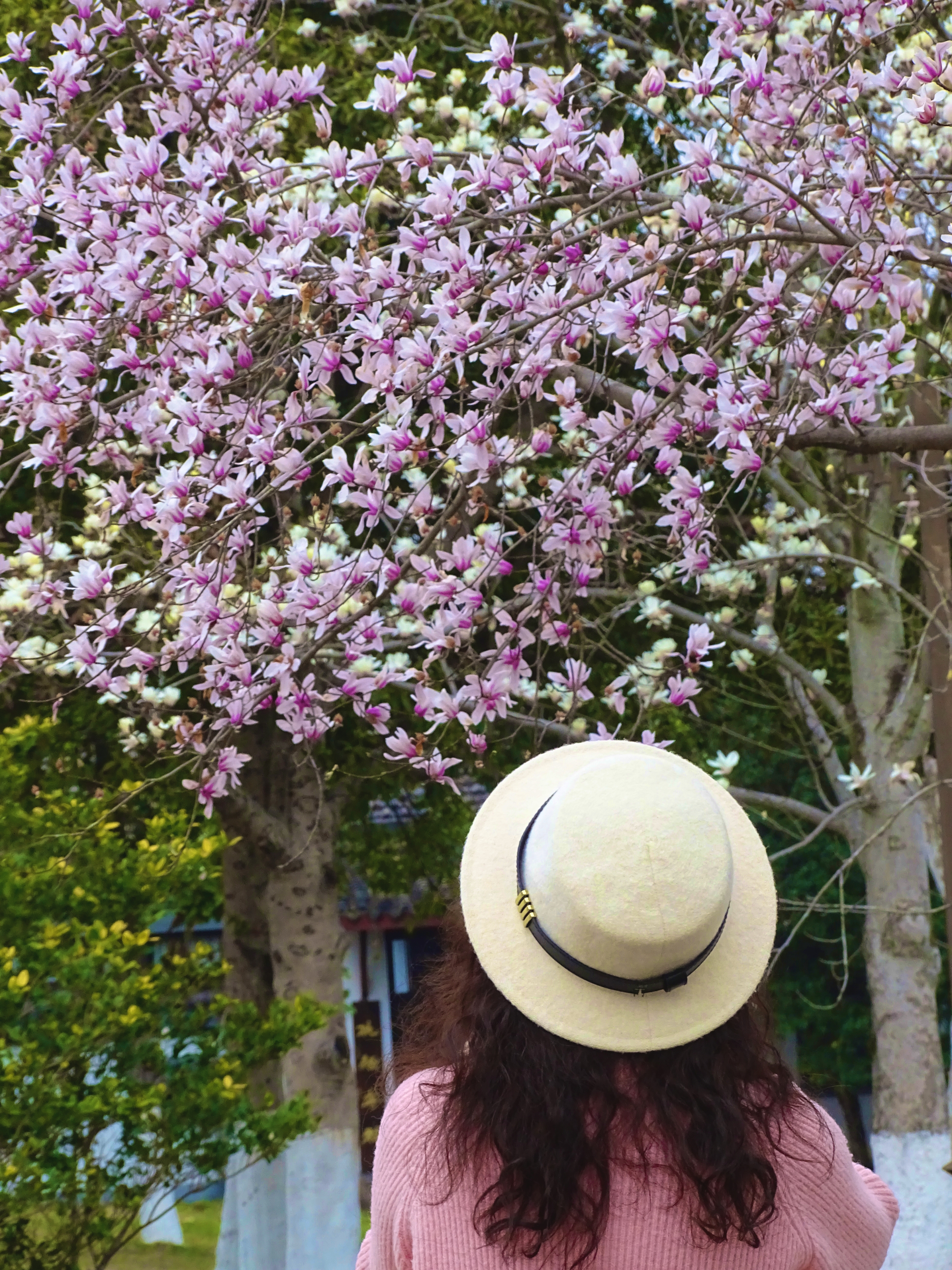 #春拍大赛#天目玉兰开得正好,粉白花瓣像小裙摆,仰头看满树繁花,风一吹就轻轻摇晃,戴帽站在花下,连影子都带着甜丝丝的香气。