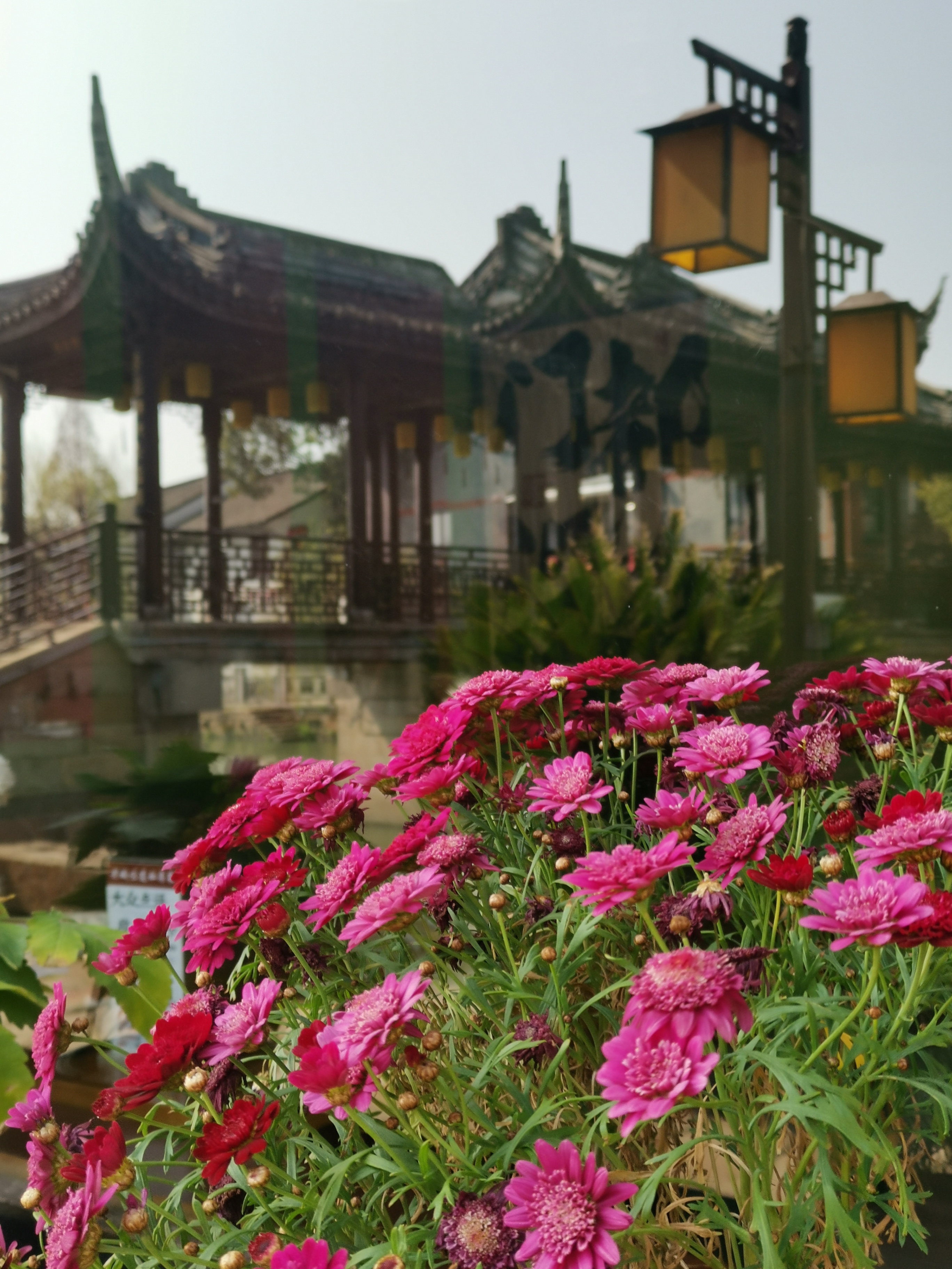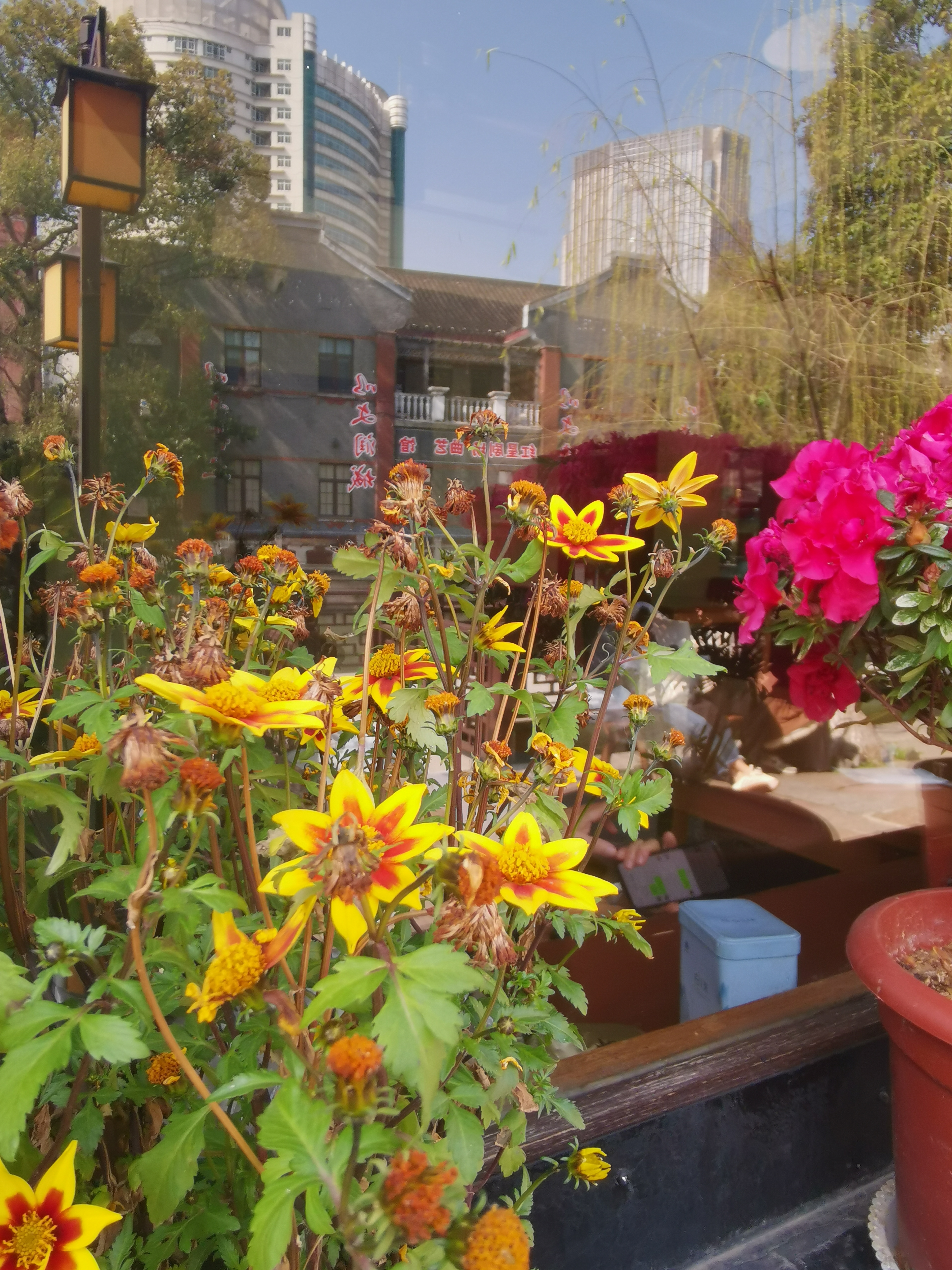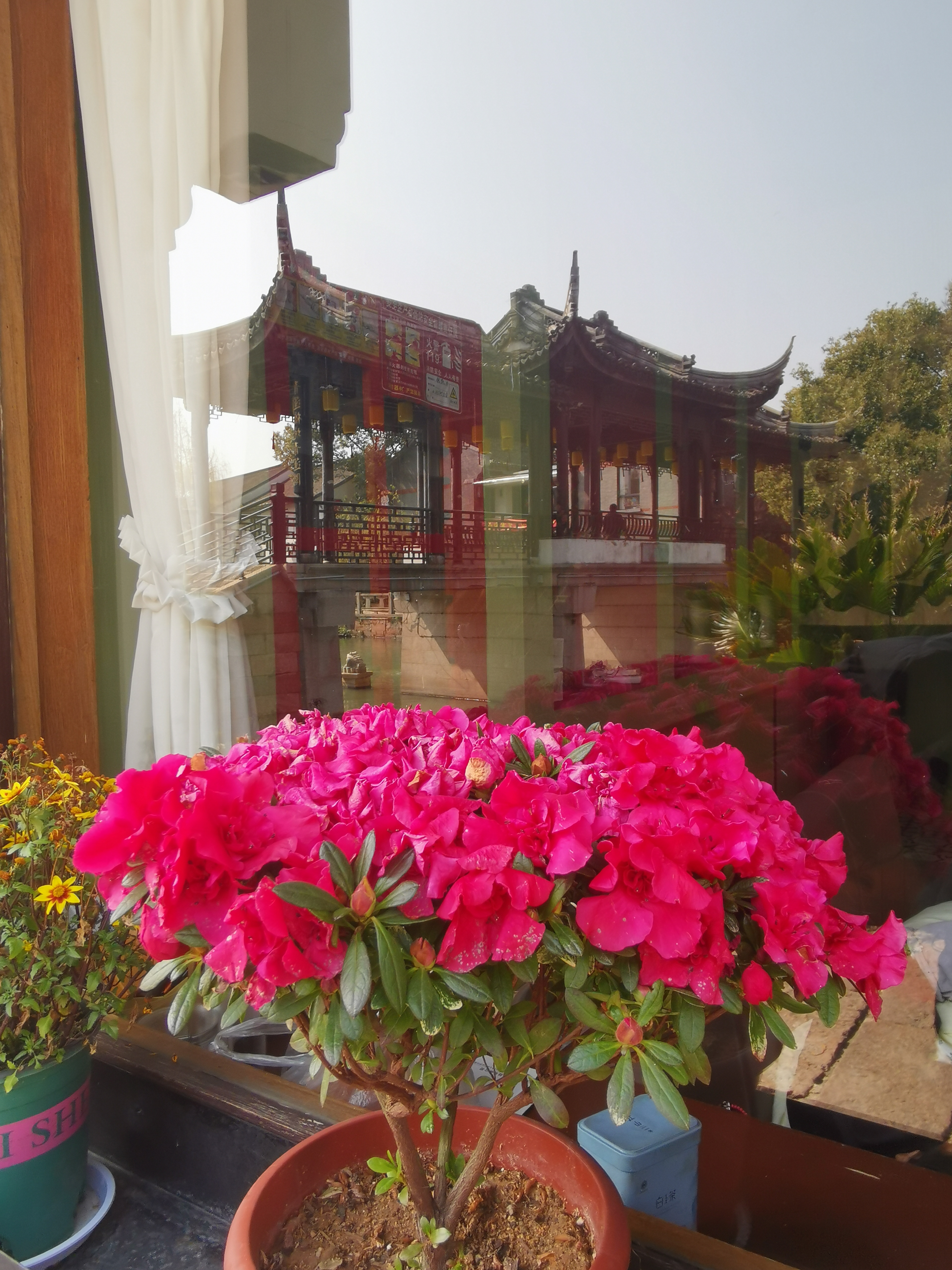 🇨🇳衣裳街一家饭店窗口边的花卉与玻璃窗中反射的影像完美结合,也是一道别样的风景线!#与潮新闻一起飞阅世界#