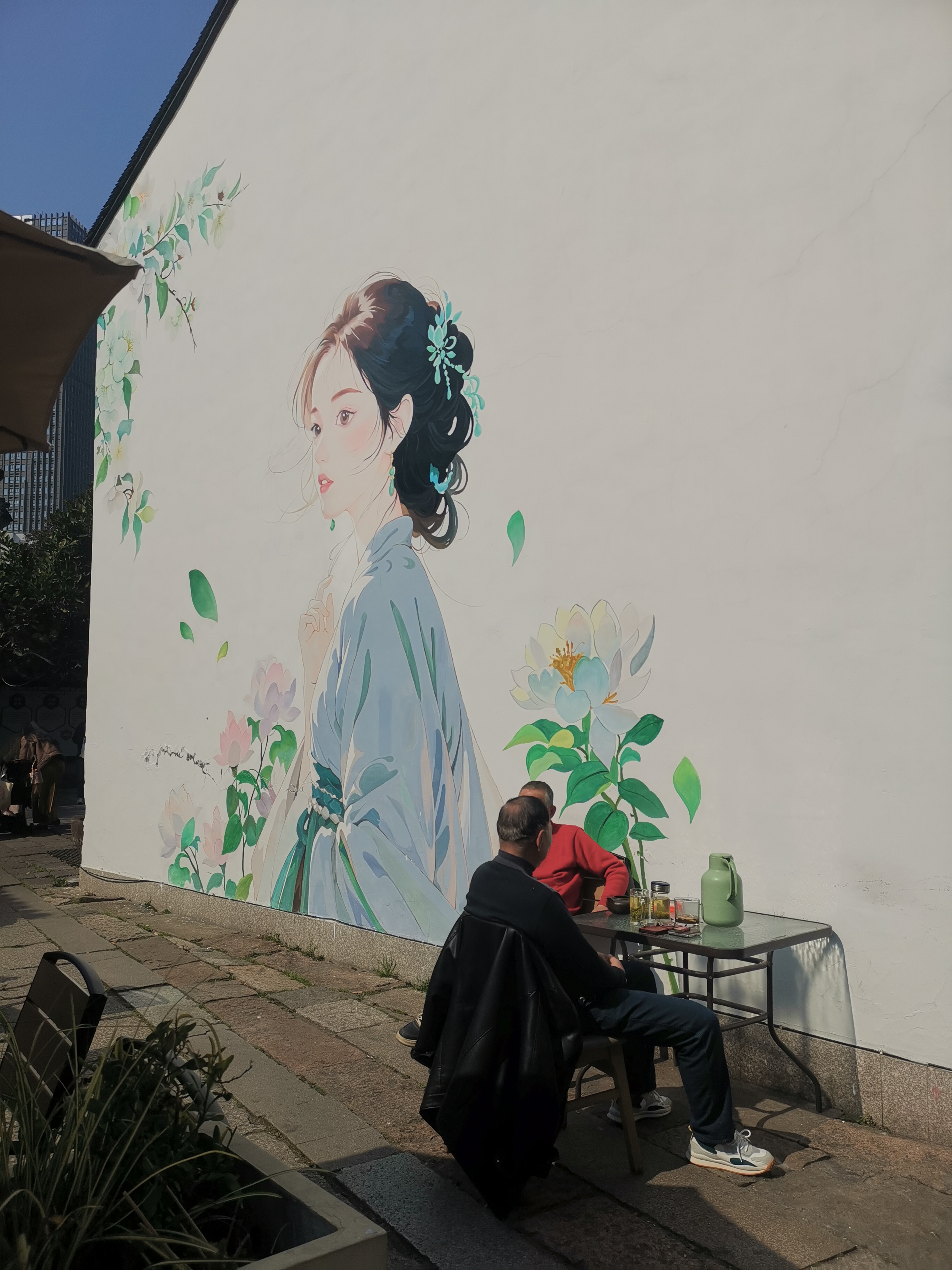🇨🇳衣裳街美女墙边喝茶聊天的两位茶客,生活好惬意!#与潮新闻一起飞阅世界#